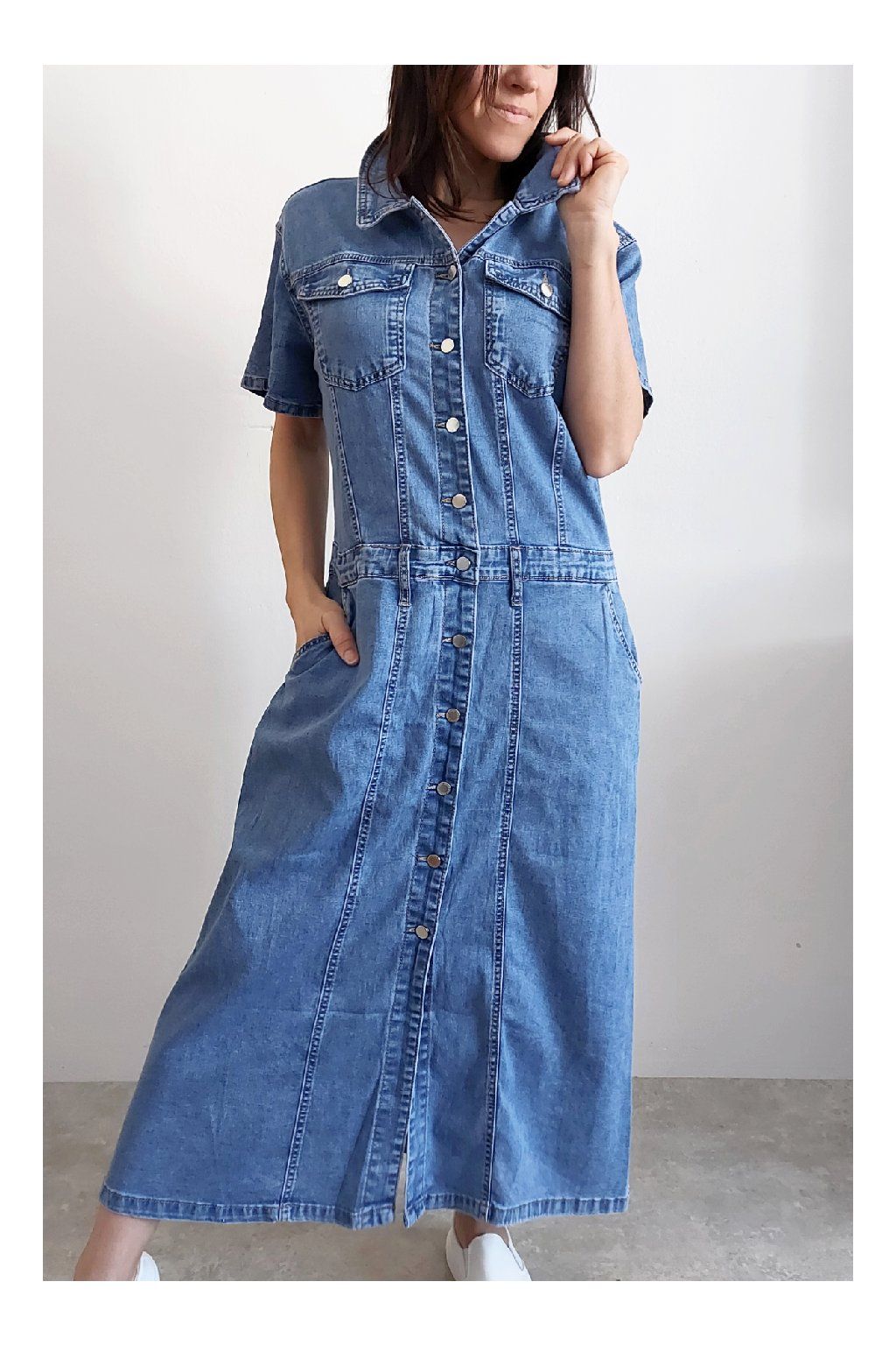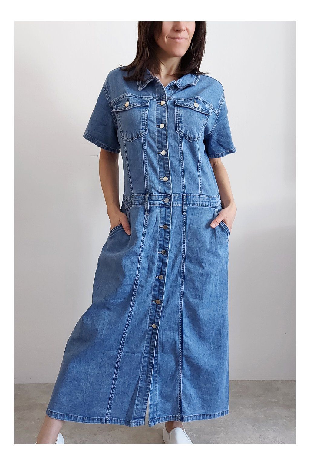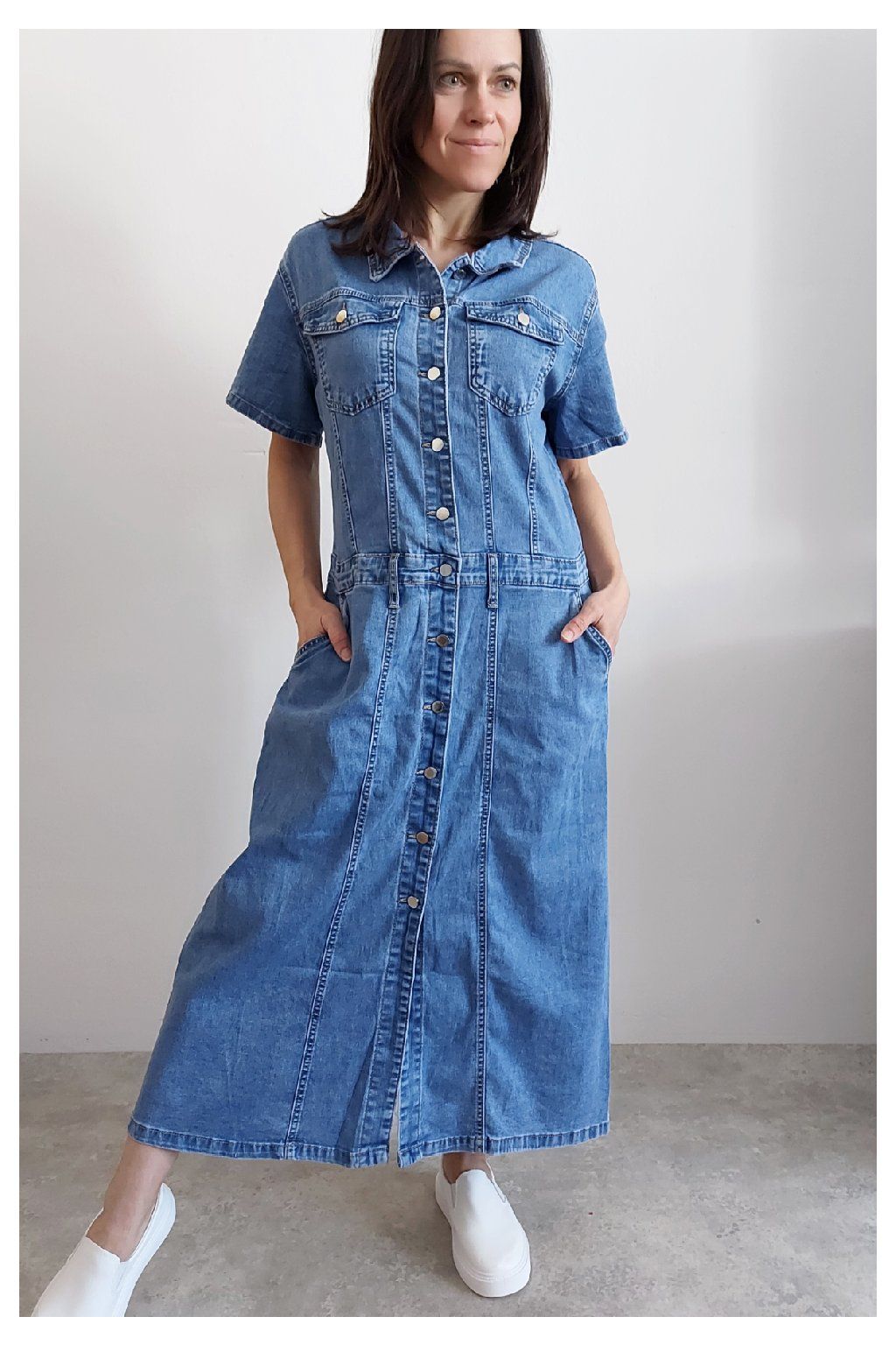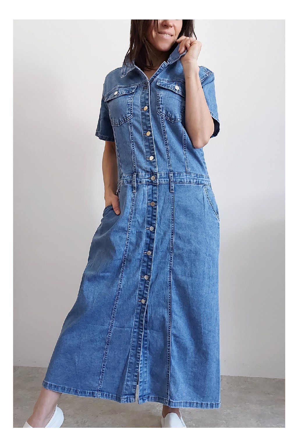 Dlouhé džínové šaty. Jsou propínací, na knoflíky, po celé délce. Rukávy krátké. Na prsou kapsičky. V pase jsou poutka a můžete si je ozdobit a nosit s páskem či uvázaným šátkem. Přední i zadní kapsy. Měkká, tenčí džínovina. Vysoce kvalitní a pružný materiál. Pozor - velikosti neodpovídají, jsou menší - řiďte se mírami. Odpovídají vel. M až 3XL. Vel. 2XL focena na vel. XS, výška 156cm a vel. 5XL focena na vel. 2XL (prsa 116cm, boky 121cm), výška 165cm.
