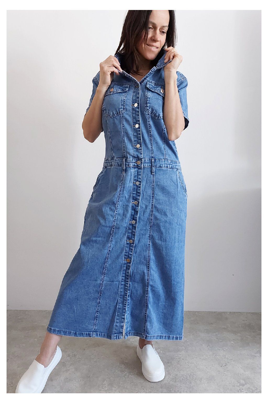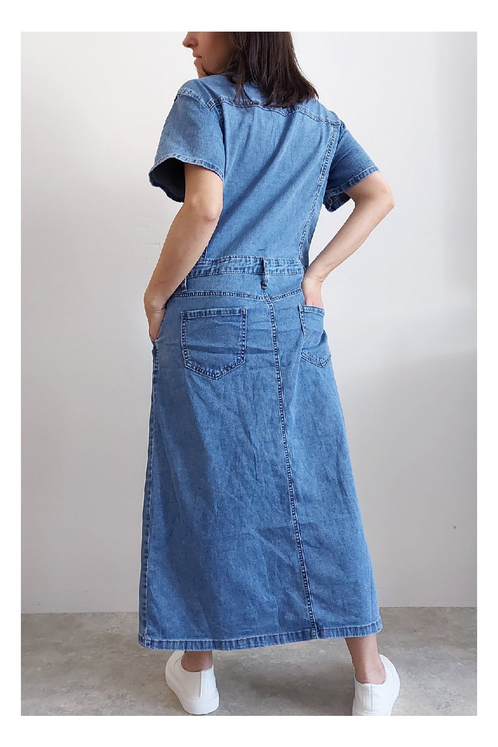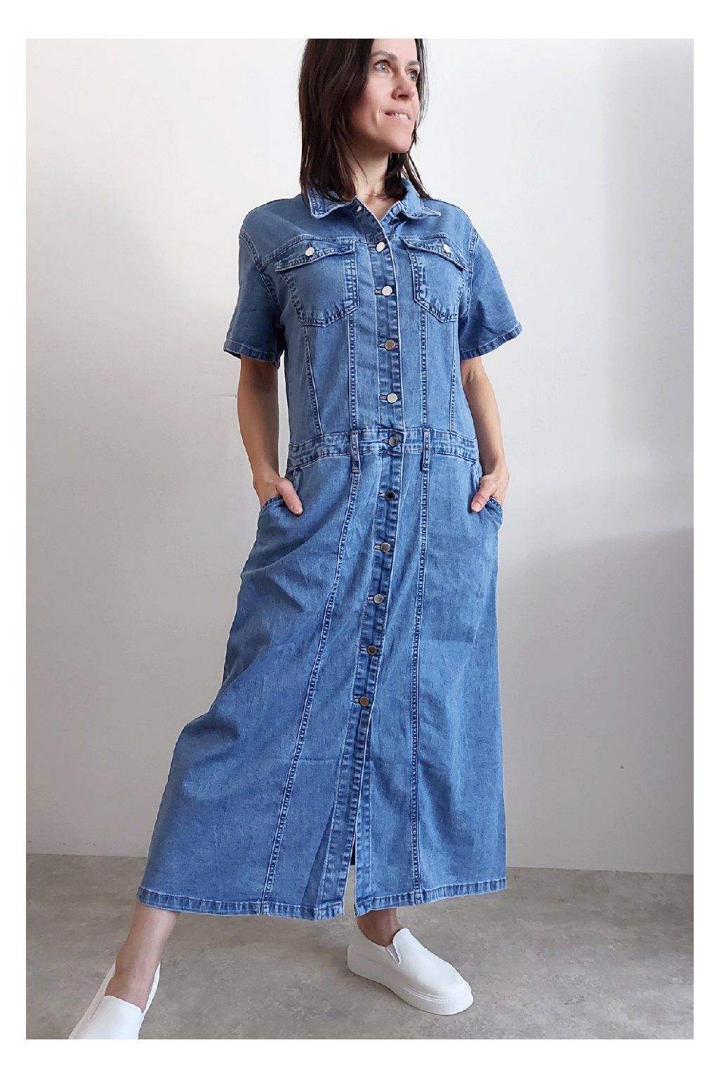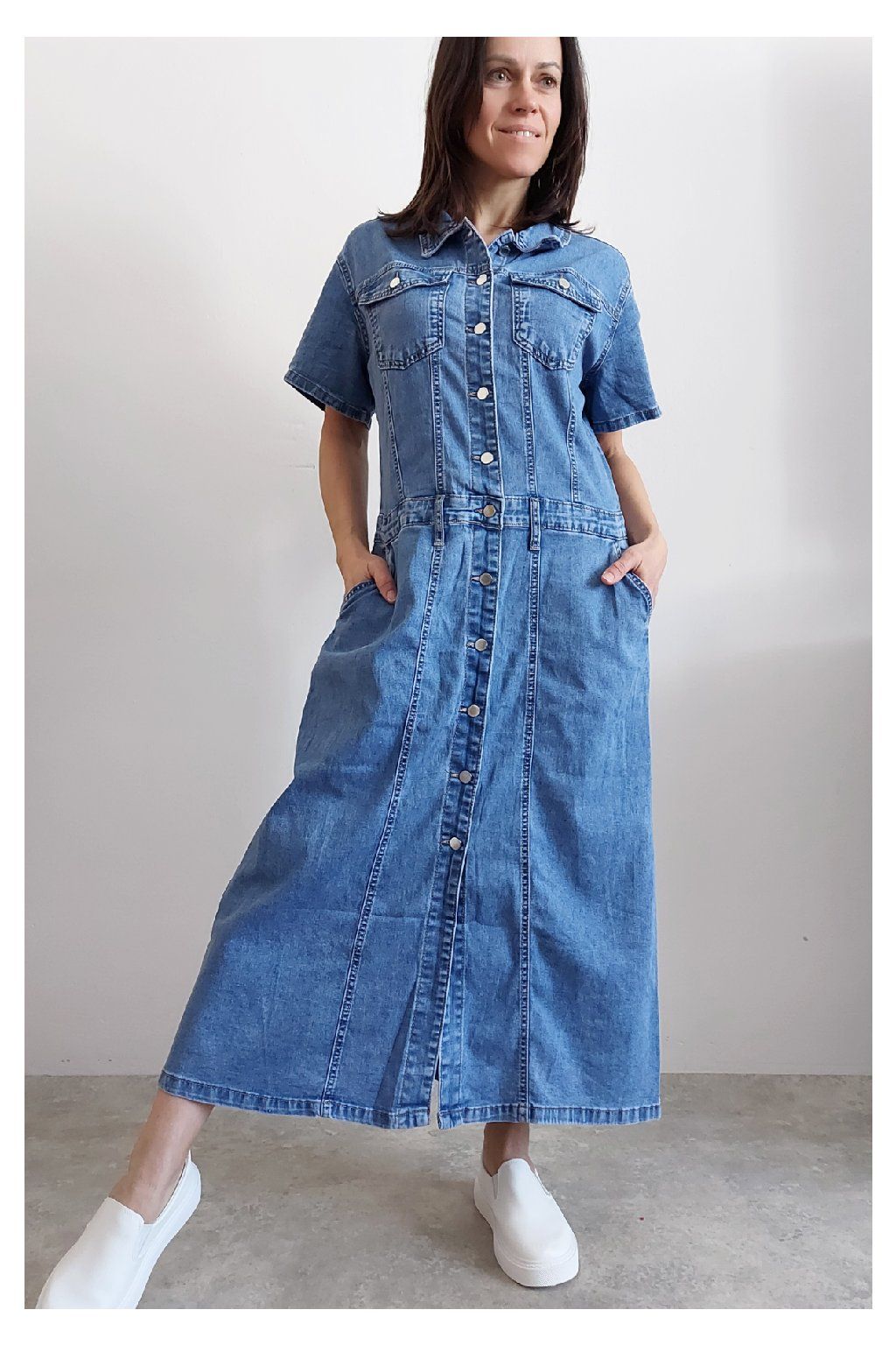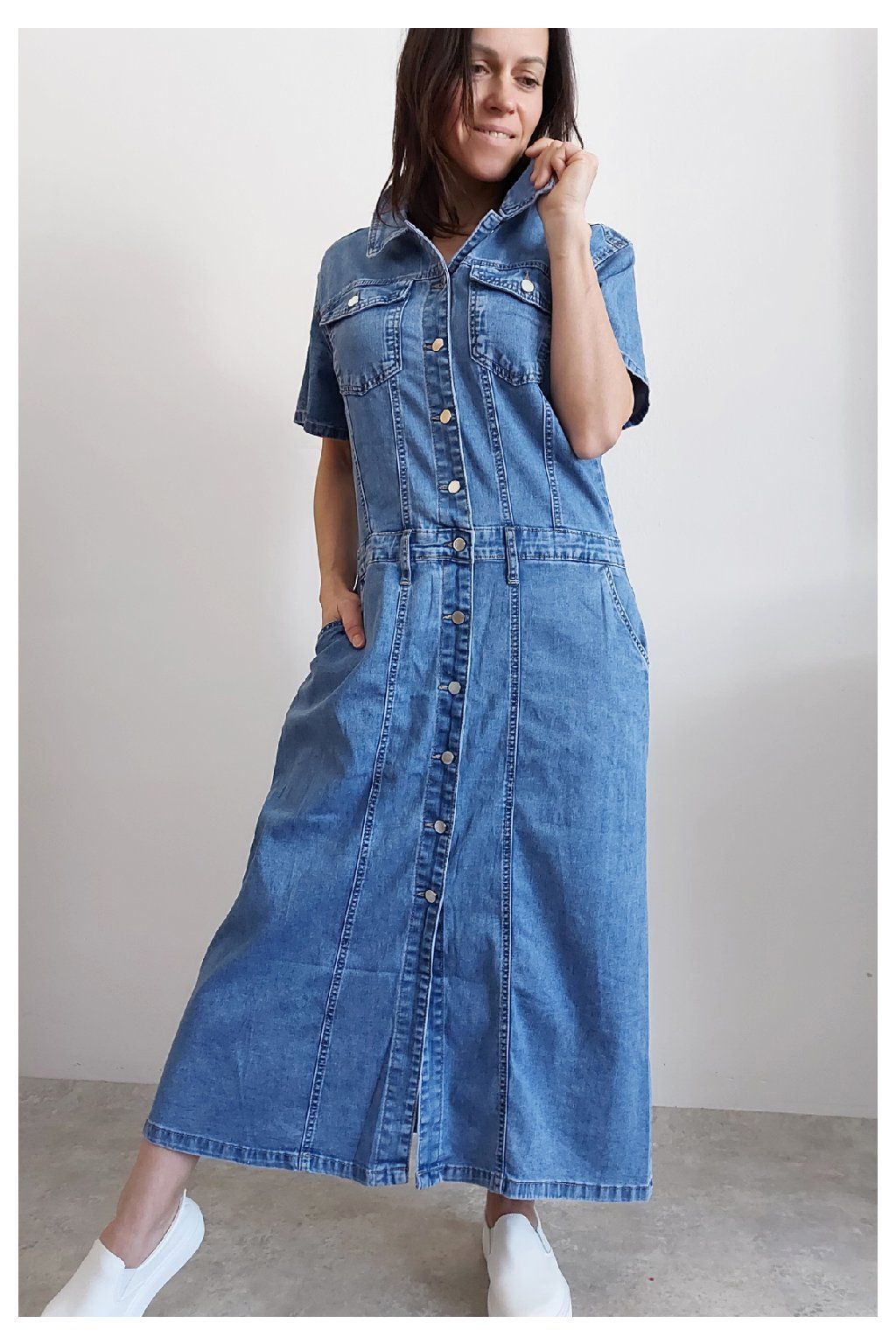 Dlouhé džínové šaty. Jsou propínací, na knoflíky, po celé délce. Rukávy krátké. Na prsou kapsičky. V pase jsou poutka a můžete si je ozdobit a nosit s páskem či uvázaným šátkem. Přední i zadní kapsy. Měkká, tenčí džínovina. Vysoce kvalitní a pružný materiál. Pozor - velikosti neodpovídají, jsou menší - řiďte se mírami. Odpovídají vel. M až 3XL. Vel. 2XL focena na vel. XS, výška 156cm a vel. 5XL focena na vel. 2XL (prsa 116cm, boky 121cm), výška 165cm.