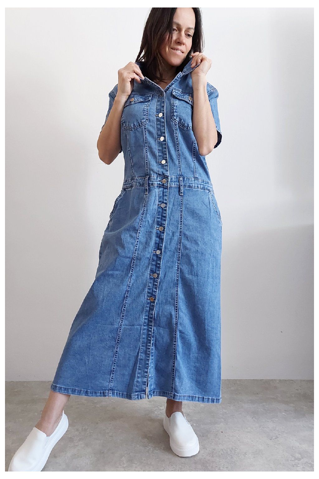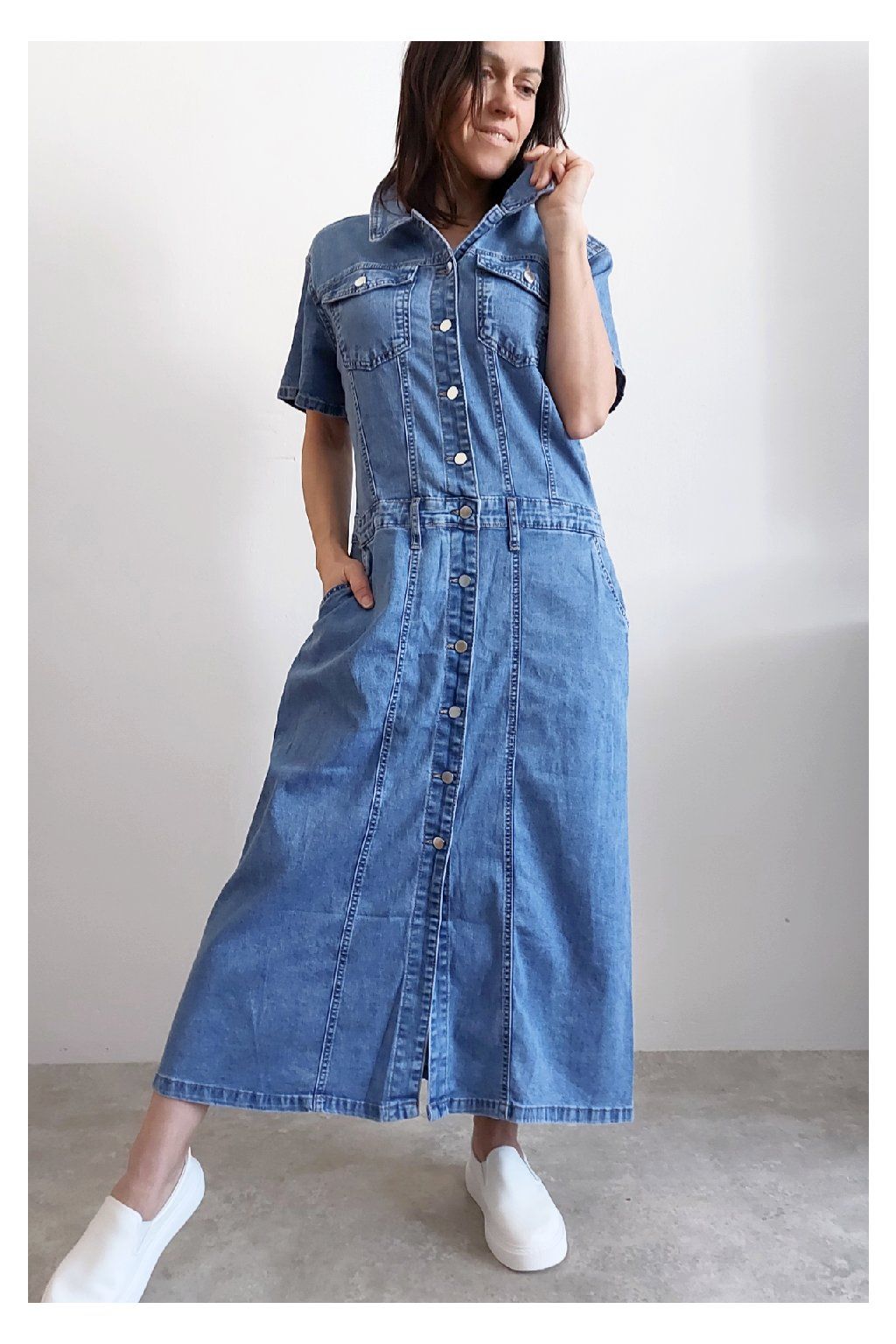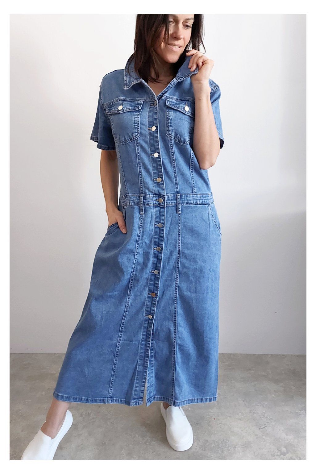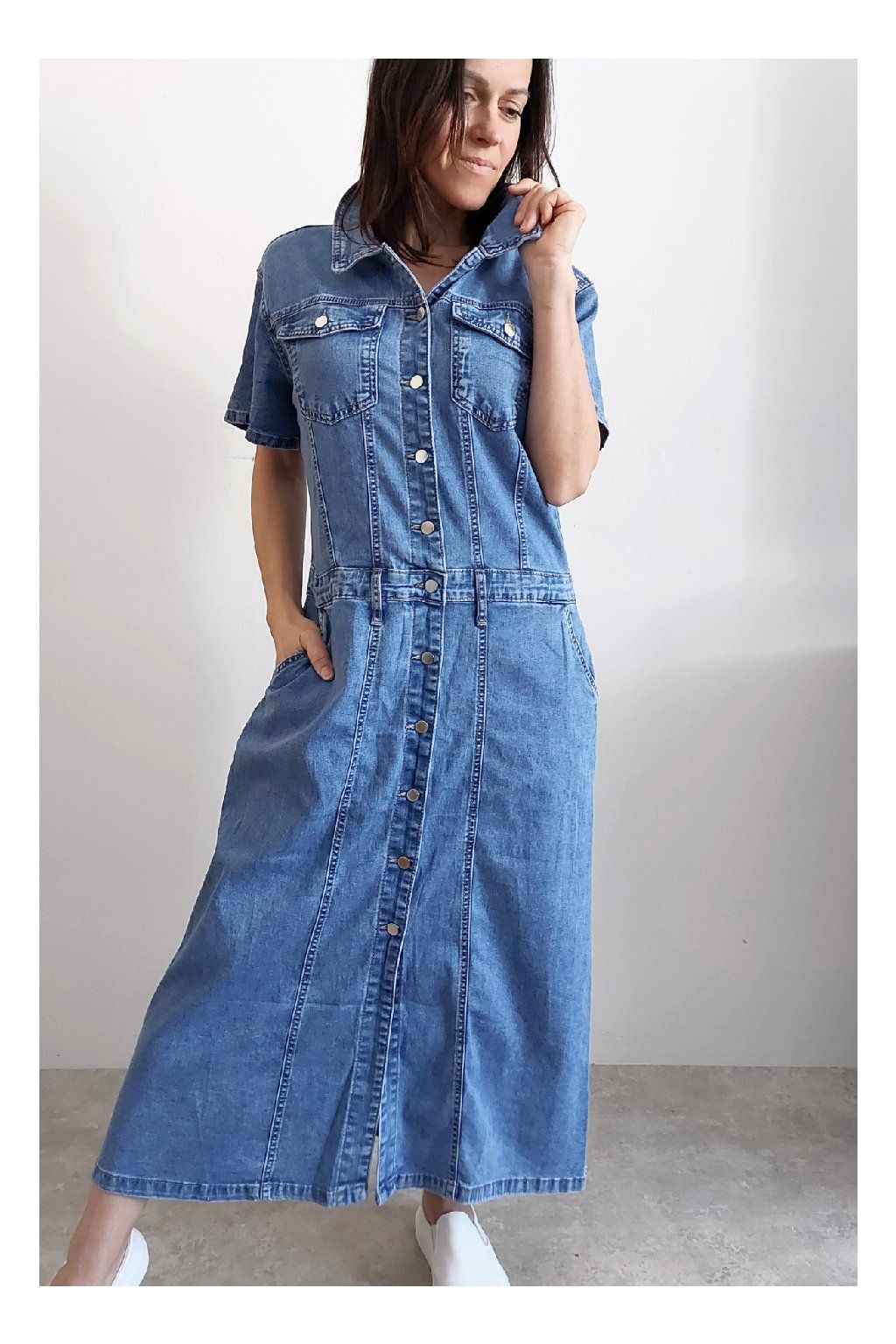 Dlouhé džínové šaty. Jsou propínací, na knoflíky, po celé délce. Rukávy krátké. Na prsou kapsičky. V pase jsou poutka a můžete si je ozdobit a nosit s páskem či uvázaným šátkem. Přední i zadní kapsy. Měkká, tenčí džínovina. Vysoce kvalitní a pružný materiál. Pozor - velikosti neodpovídají, jsou menší - řiďte se mírami. Odpovídají vel. M až 3XL. Vel. 2XL focena na vel. XS, výška 156cm a vel. 5XL focena na vel. 2XL (prsa 116cm, boky 121cm), výška 165cm.