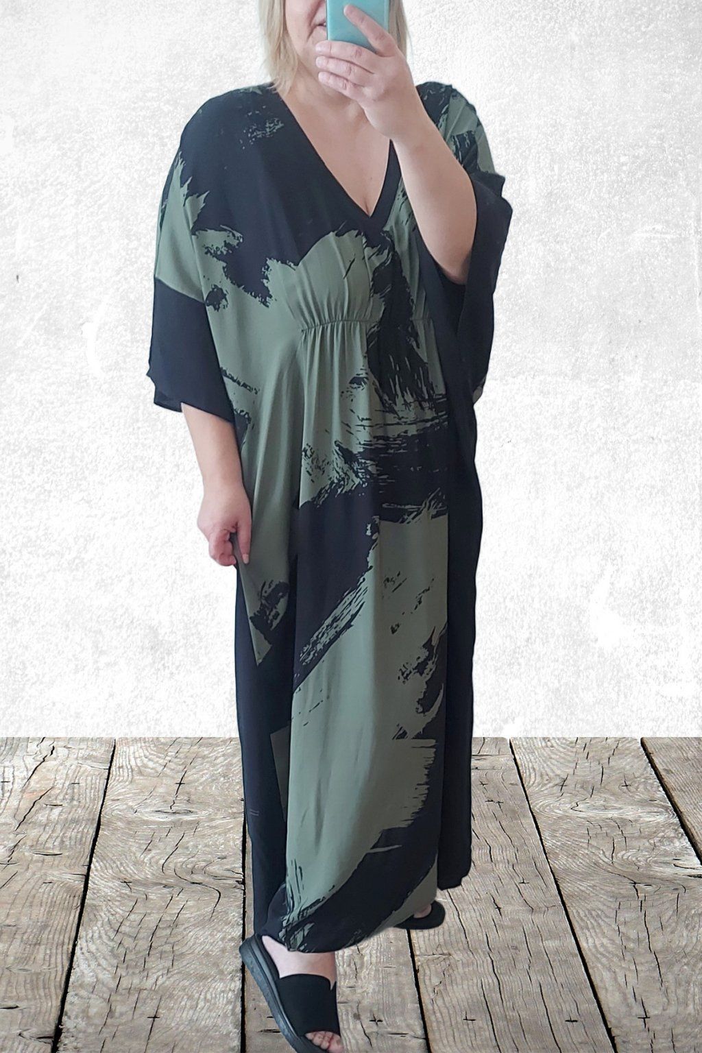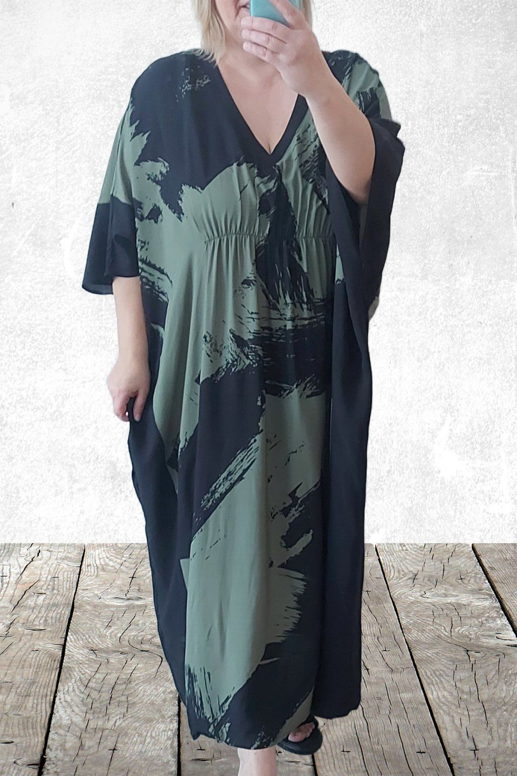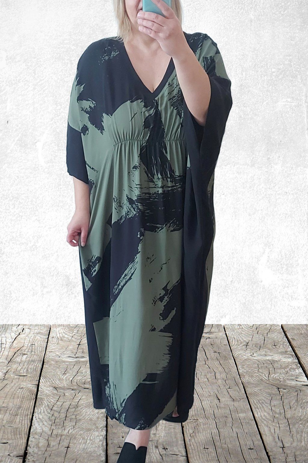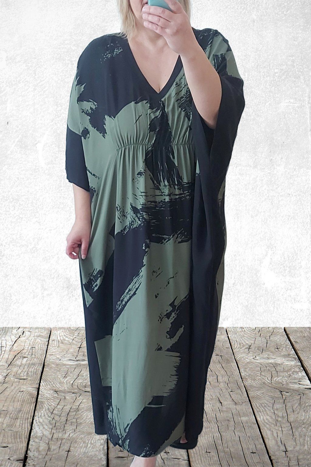 Dlouhé šaty oversize střihu. Véčkový výstřih. Rukávy krátké netopýřího střihu. V místě prsou gumka, která krásně zvýrazní siluetu. Bez kapes. Materiál kvalitní - lehoučký, na těle velmi příjemný, rychleschnoucí. Vhodné pro větší velikosti. Foceno na vel. 2XL (prsa 116cm, pas 104cm, boky 121cm), výška 165cm.