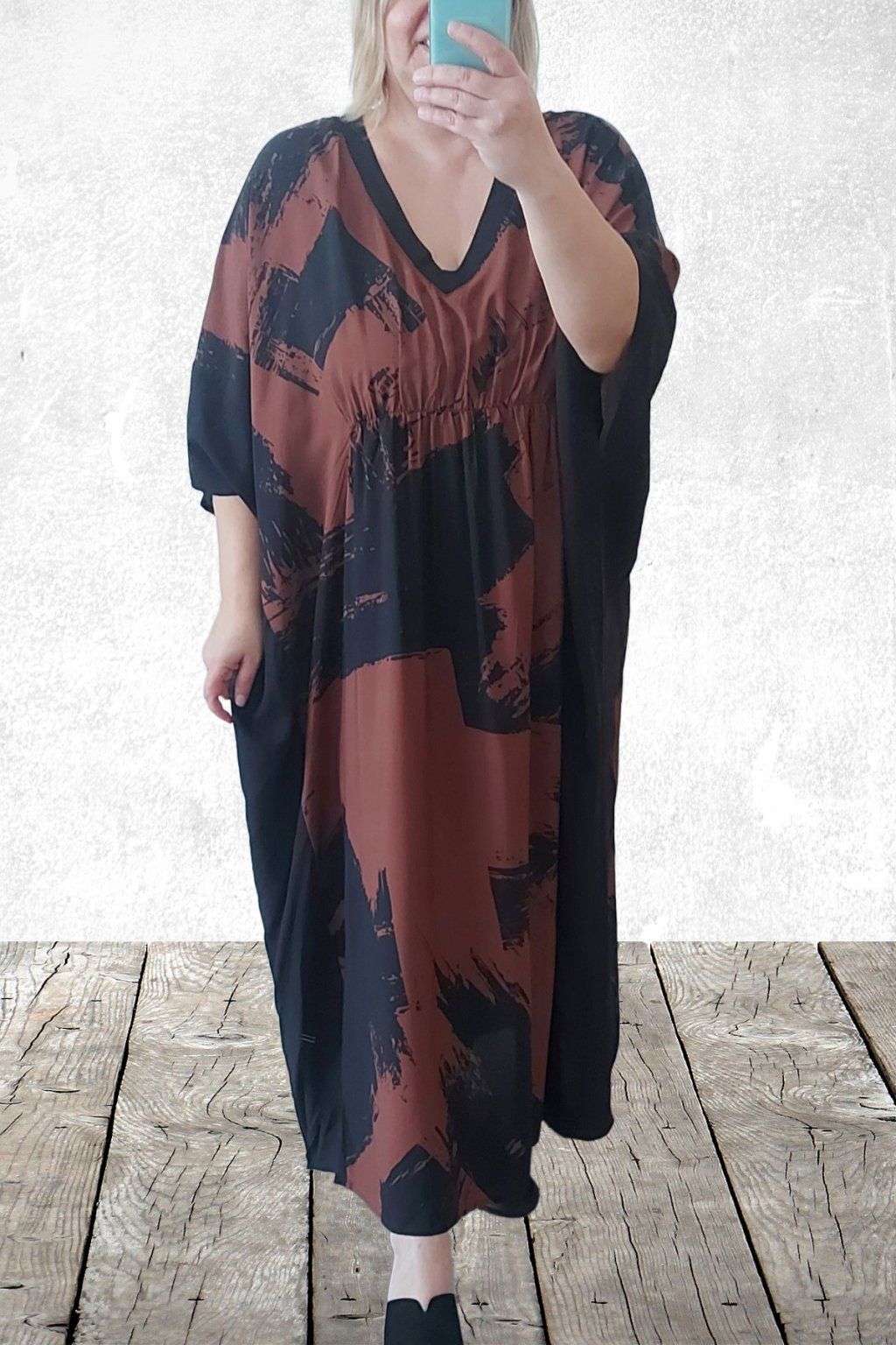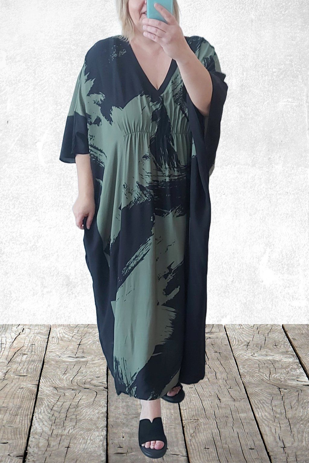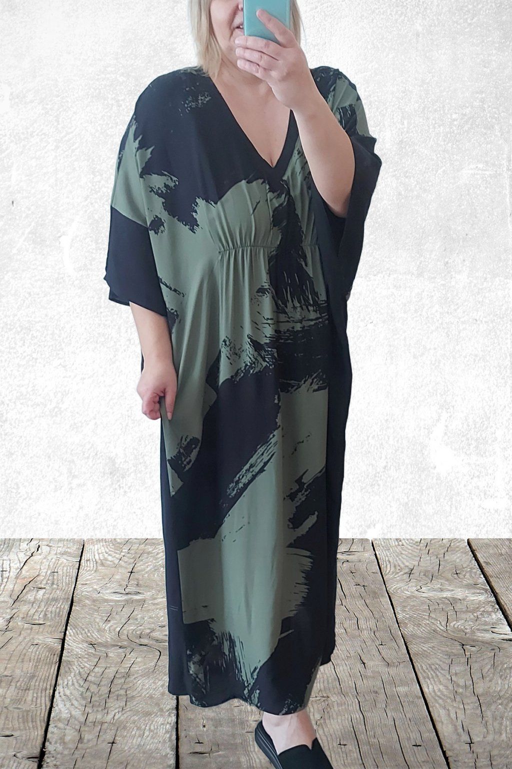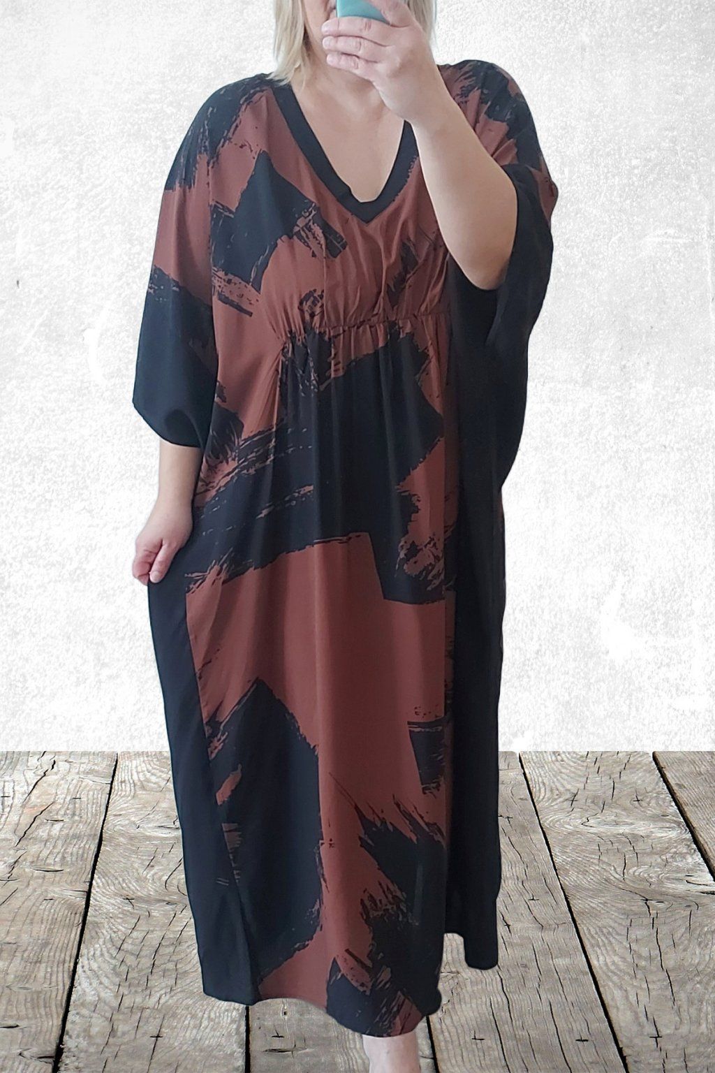 Dlouhé šaty oversize střihu. Véčkový výstřih. Rukávy krátké netopýřího střihu. V místě prsou gumka, která krásně zvýrazní siluetu. Bez kapes. Materiál kvalitní - lehoučký, na těle velmi příjemný, rychleschnoucí. Vhodné pro větší velikosti. Foceno na vel. 2XL (prsa 116cm, pas 104cm, boky 121cm), výška 165cm.