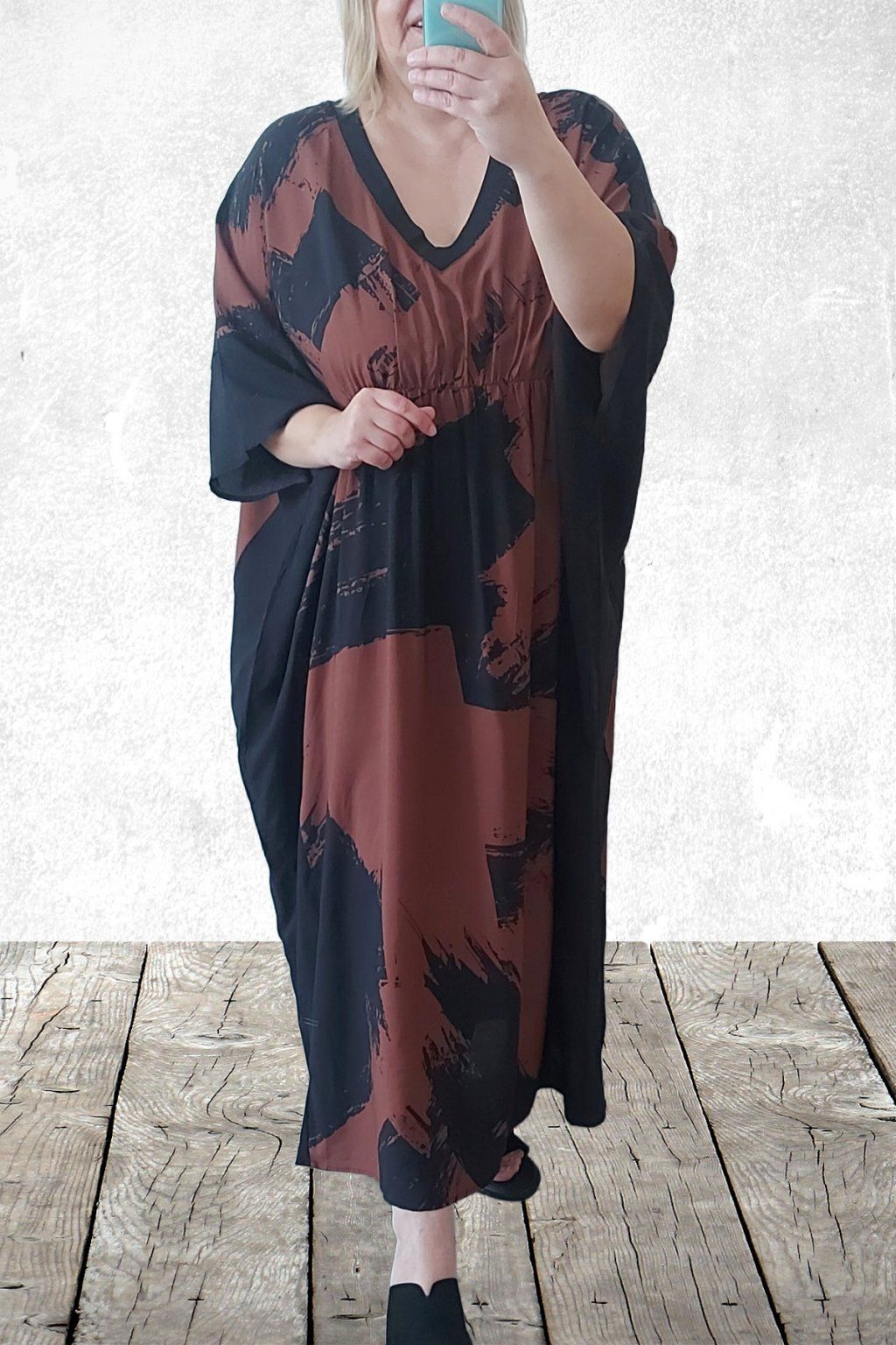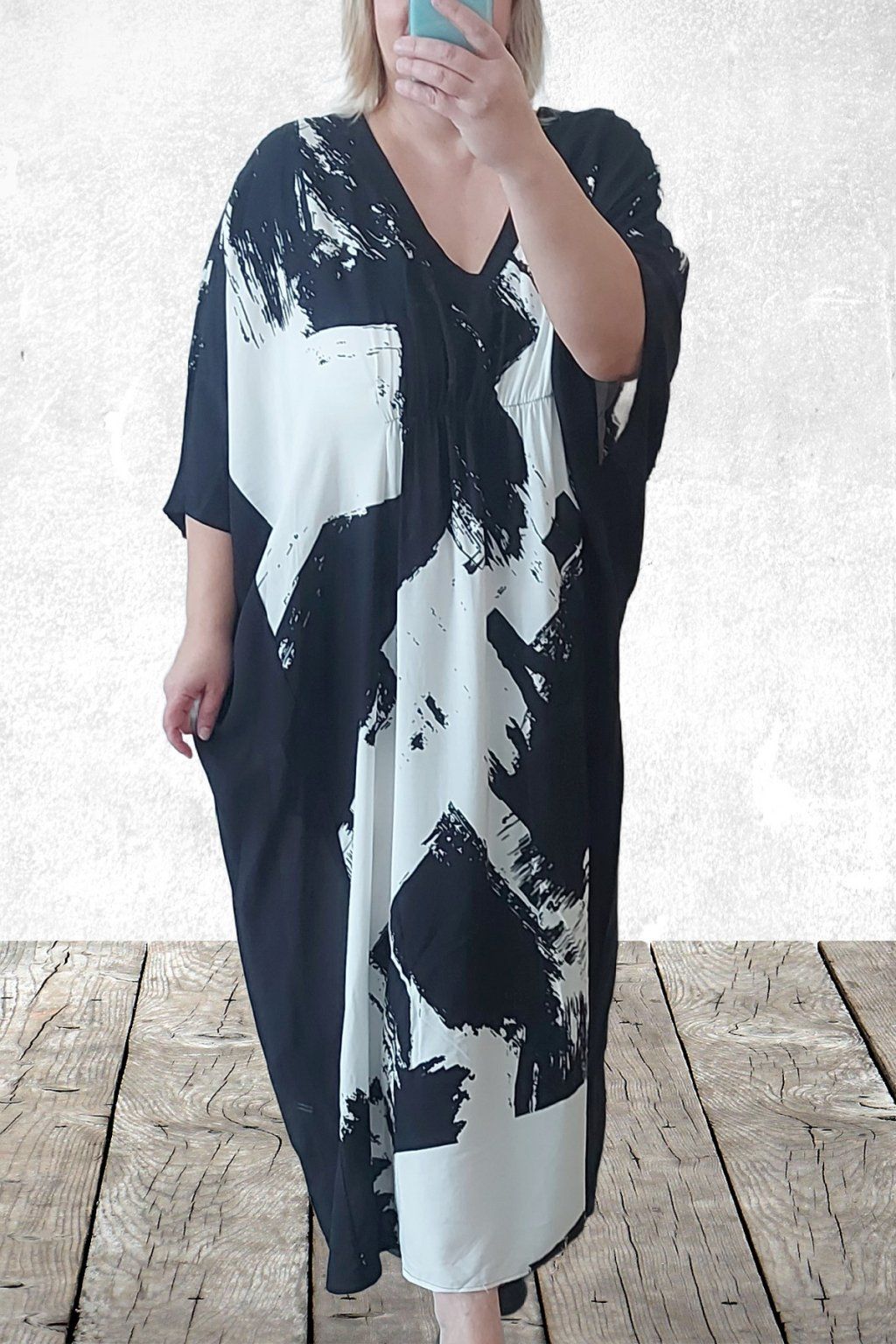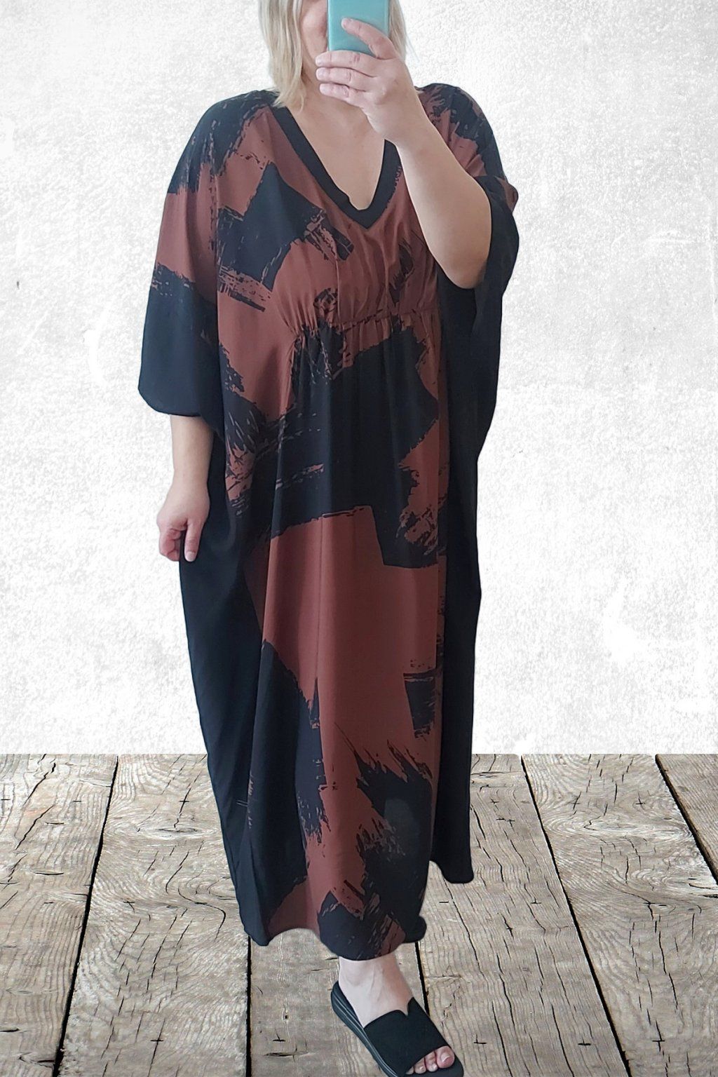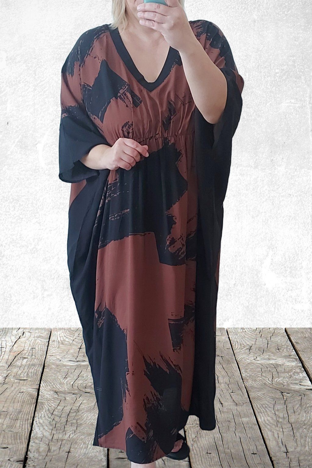 Dlouhé šaty oversize střihu. Véčkový výstřih. Rukávy krátké netopýřího střihu. V místě prsou gumka, která krásně zvýrazní siluetu. Bez kapes. Materiál kvalitní - lehoučký, na těle velmi příjemný, rychleschnoucí. Vhodné pro větší velikosti. Foceno na vel. 2XL (prsa 116cm, pas 104cm, boky 121cm), výška 165cm.