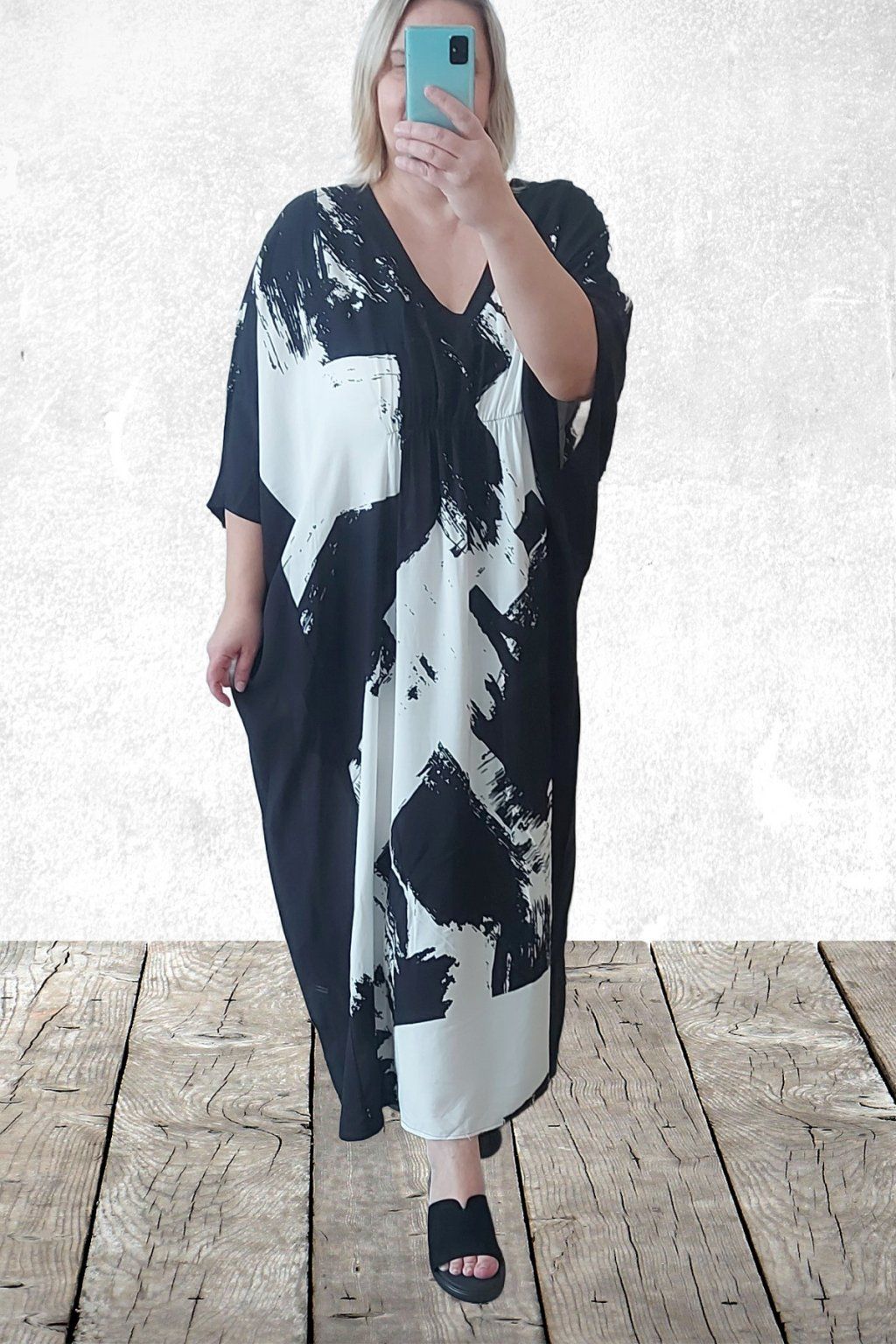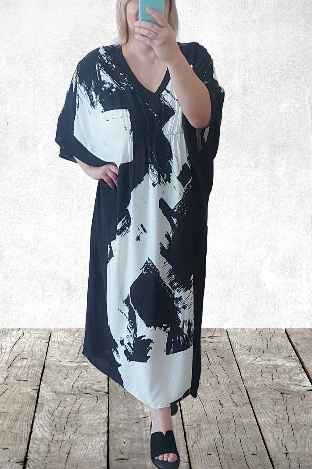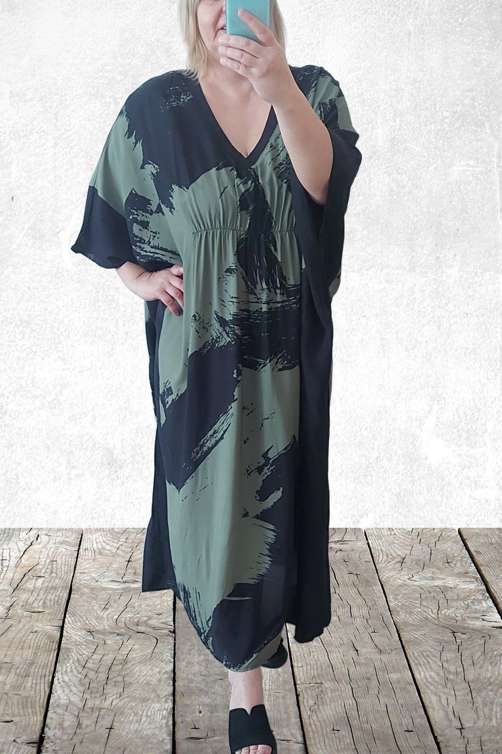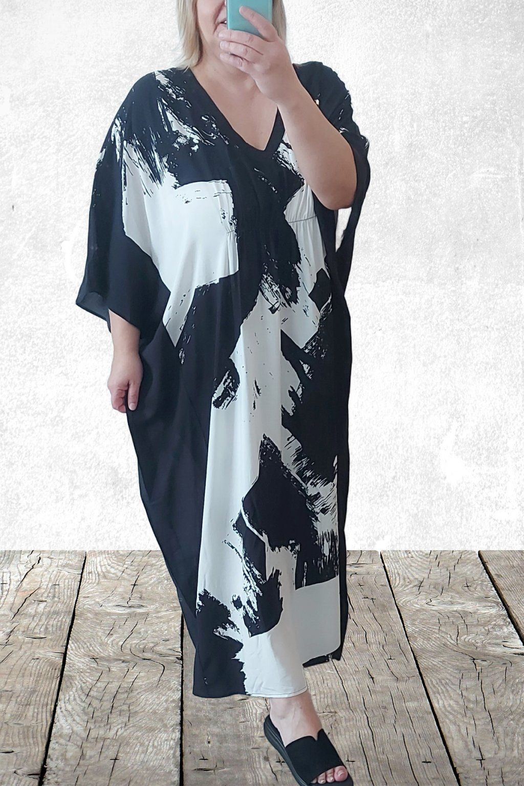 Dlouhé šaty oversize střihu. Véčkový výstřih. Rukávy krátké netopýřího střihu. V místě prsou gumka, která krásně zvýrazní siluetu. Bez kapes. Materiál kvalitní - lehoučký, na těle velmi příjemný, rychleschnoucí. Vhodné pro větší velikosti. Foceno na vel. 2XL (prsa 116cm, pas 104cm, boky 121cm), výška 165cm.