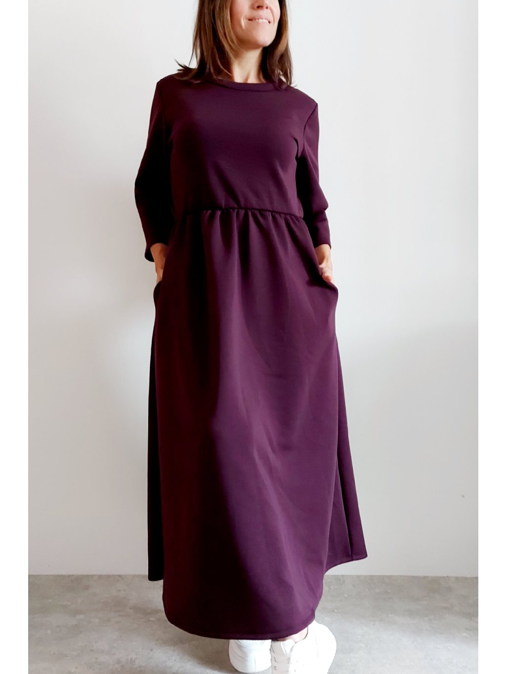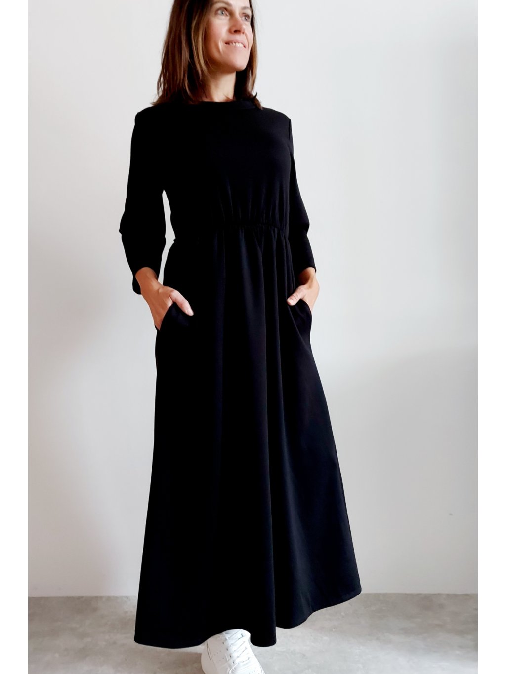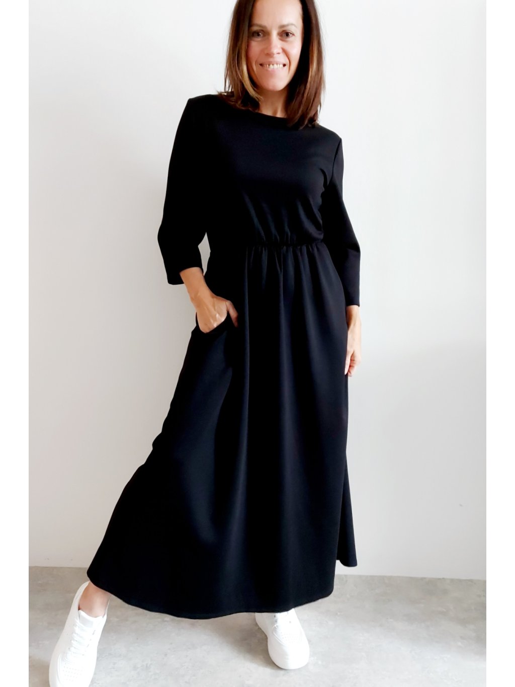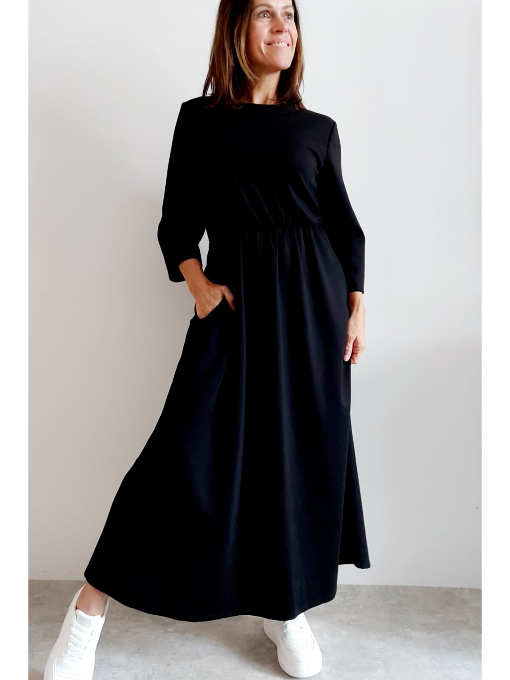 Dlouhé šaty s 3/4 rukávem. Oblékání přes hlavu, boční kapsy. Šaty jsou v pase řešené gumkou. Materiál silnější - vhodný na chladnější dny, hebký - na těle velmi příjemný. Foceno na vel. XS, výška 156cm.