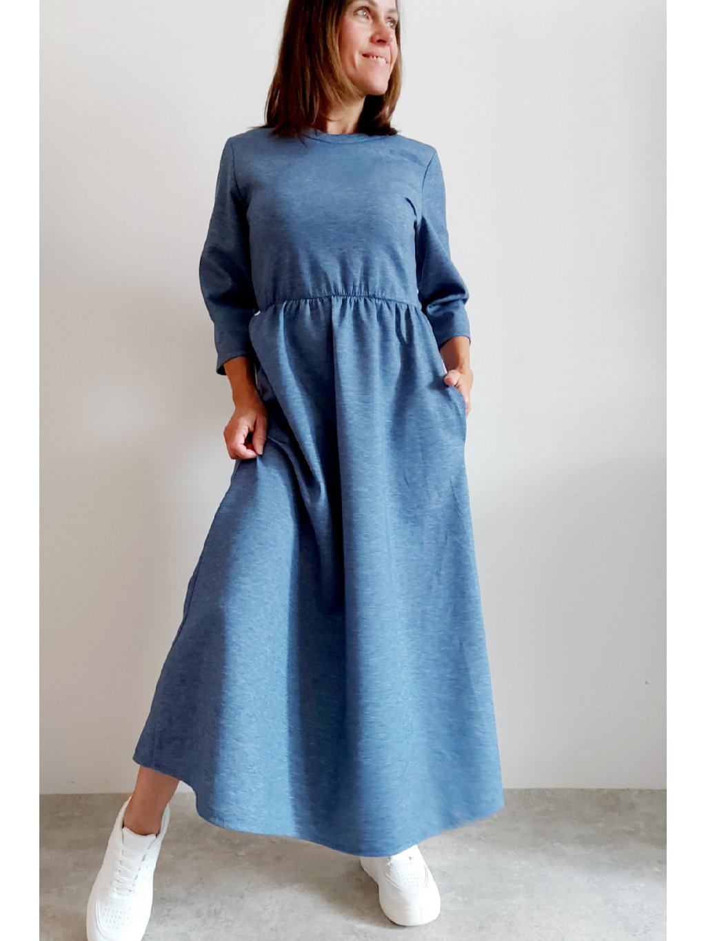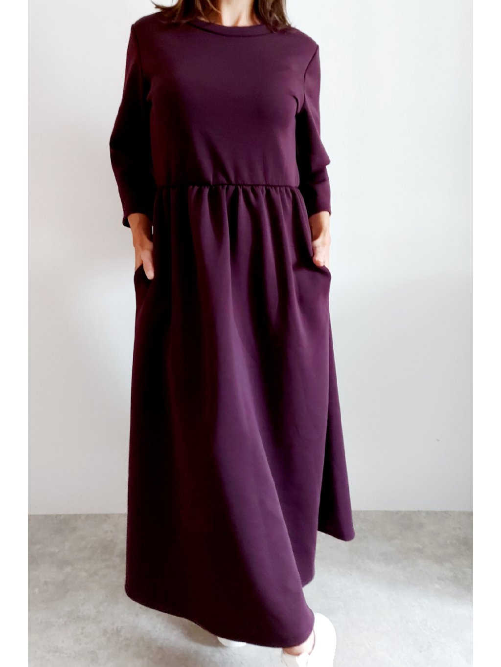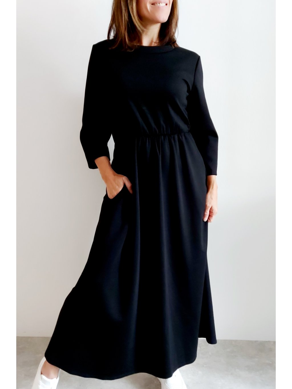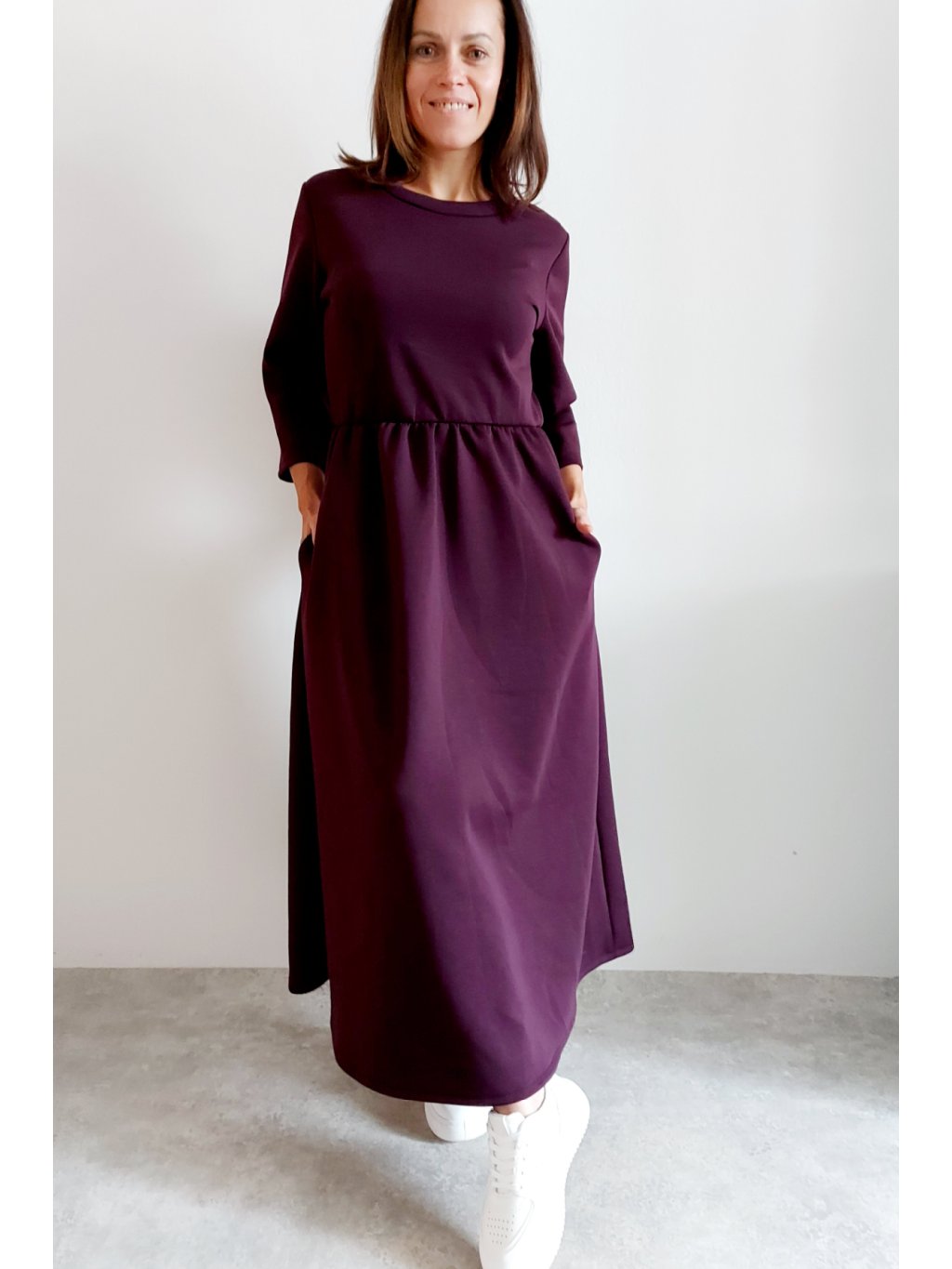 Dlouhé šaty s 3/4 rukávem. Oblékání přes hlavu, boční kapsy. Šaty jsou v pase řešené gumkou. Materiál silnější - vhodný na chladnější dny, hebký - na těle velmi příjemný. Foceno na vel. XS, výška 156cm.