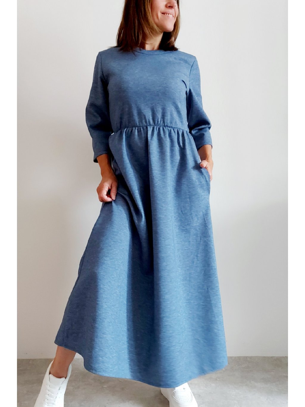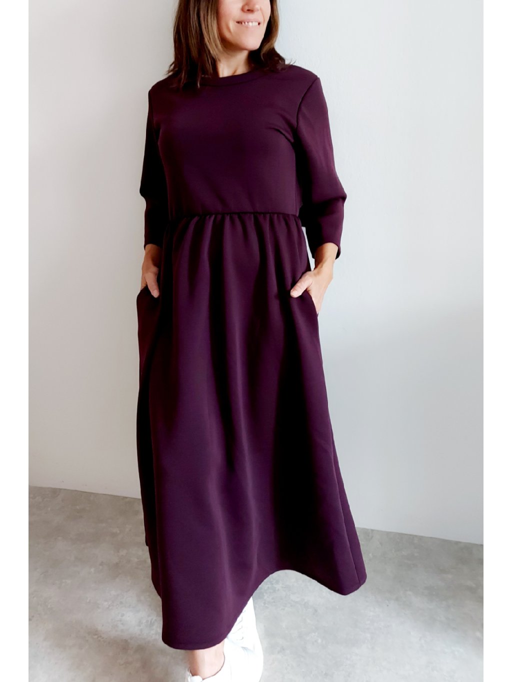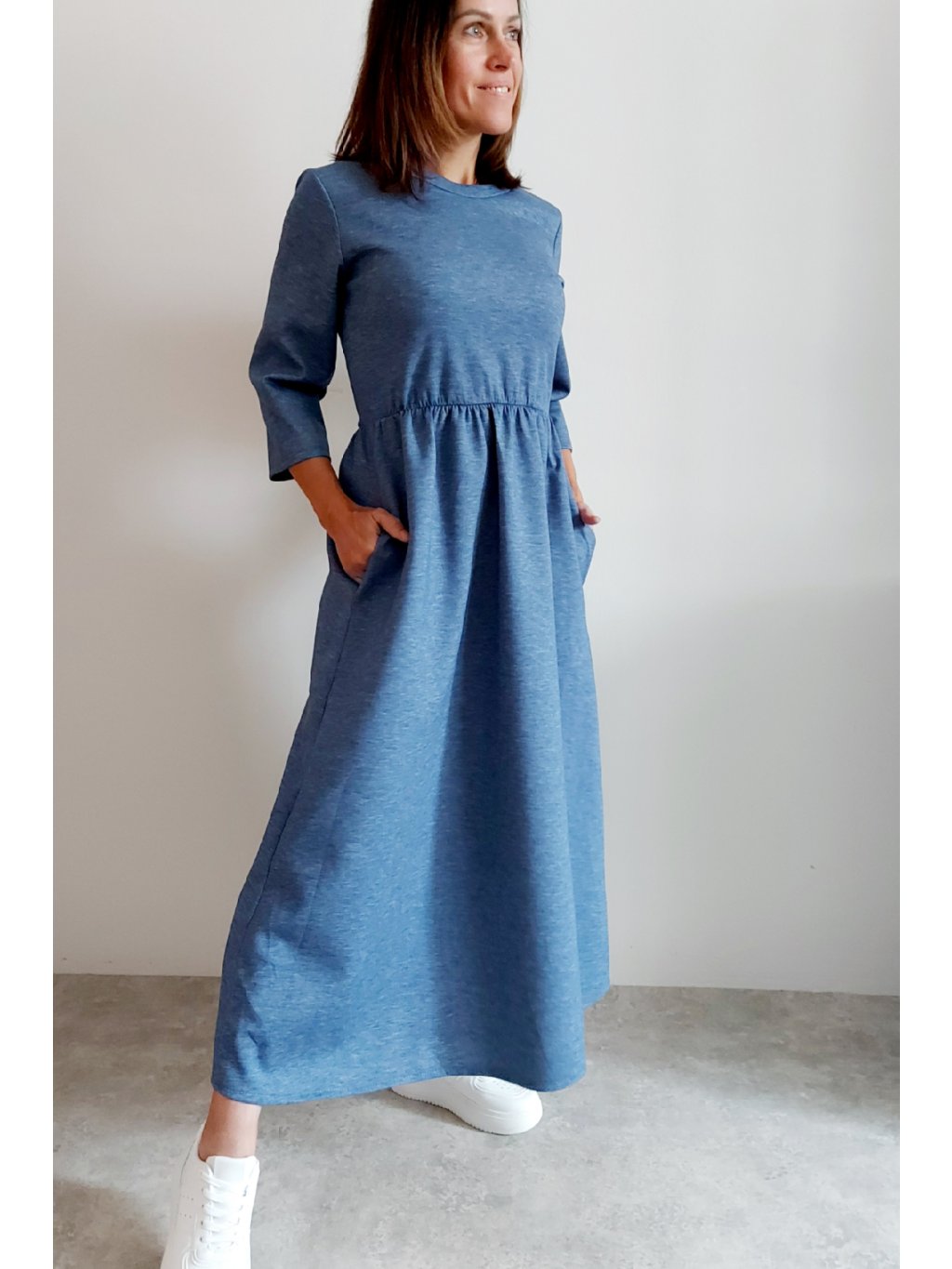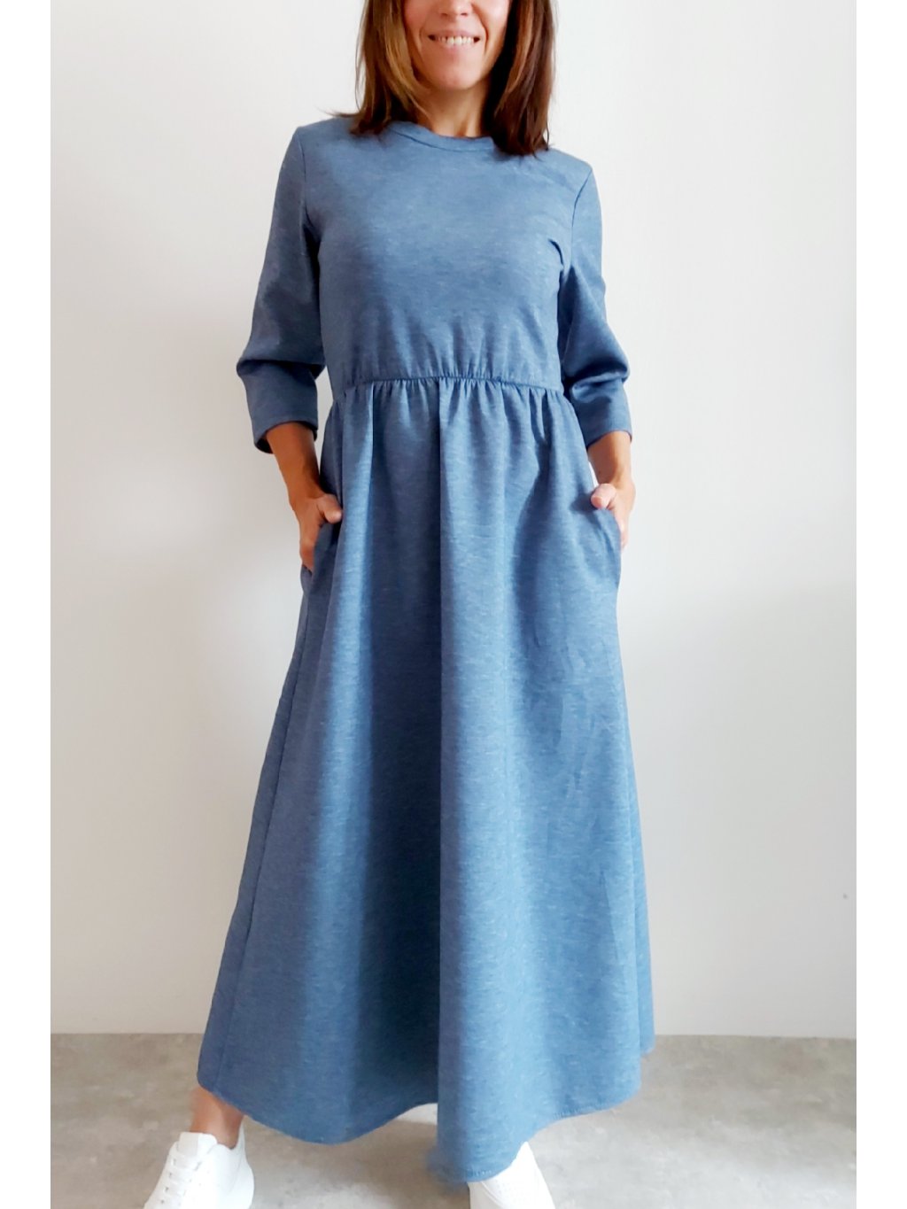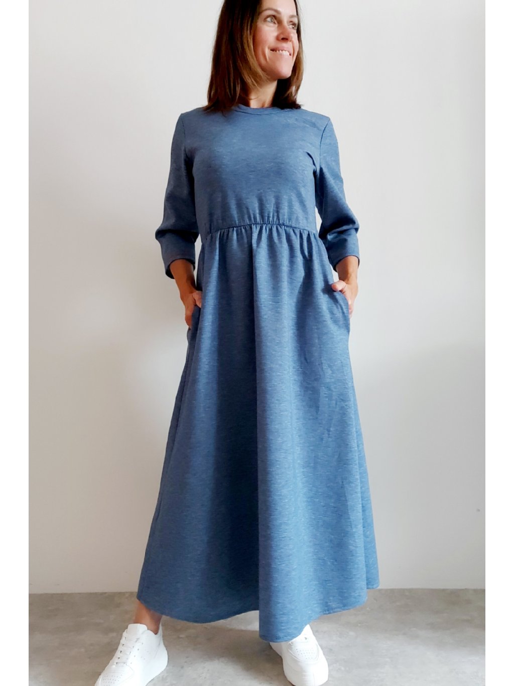 Dlouhé šaty s 3/4 rukávem. Oblékání přes hlavu, boční kapsy. Šaty jsou v pase řešené gumkou. Materiál silnější - vhodný na chladnější dny, hebký - na těle velmi příjemný. Foceno na vel. XS, výška 156cm.