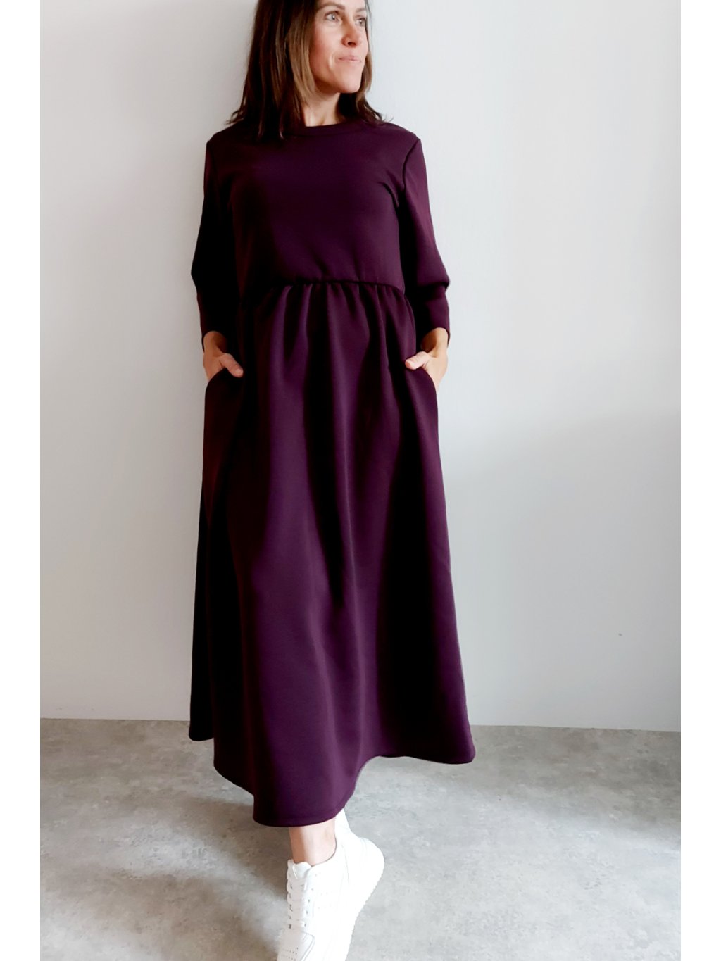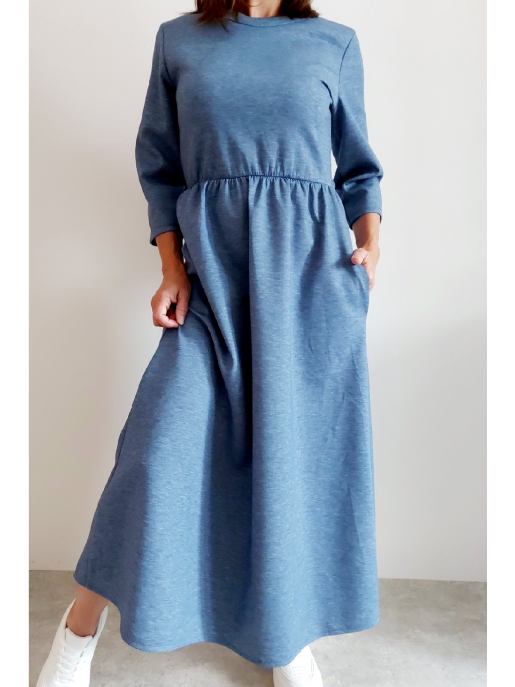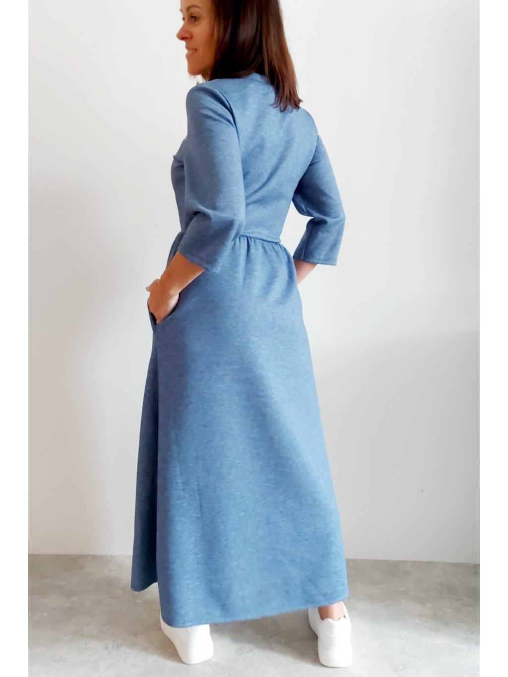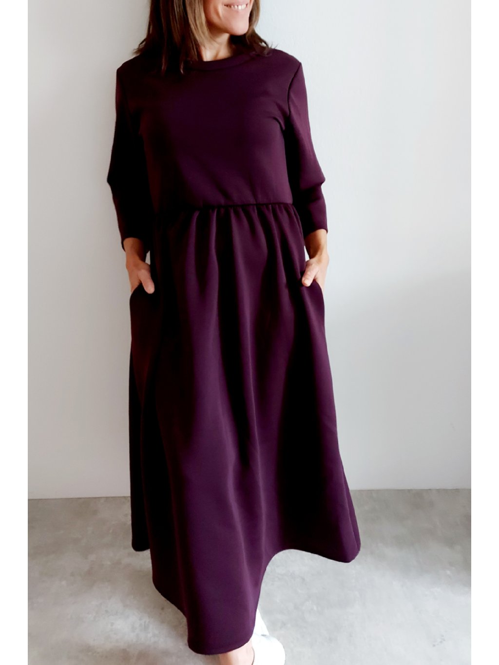 Dlouhé šaty s 3/4 rukávem. Oblékání přes hlavu, boční kapsy. Šaty jsou v pase řešené gumkou. Materiál silnější - vhodný na chladnější dny, hebký - na těle velmi příjemný. Foceno na vel. XS, výška 156cm.