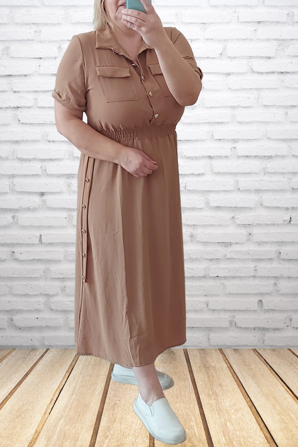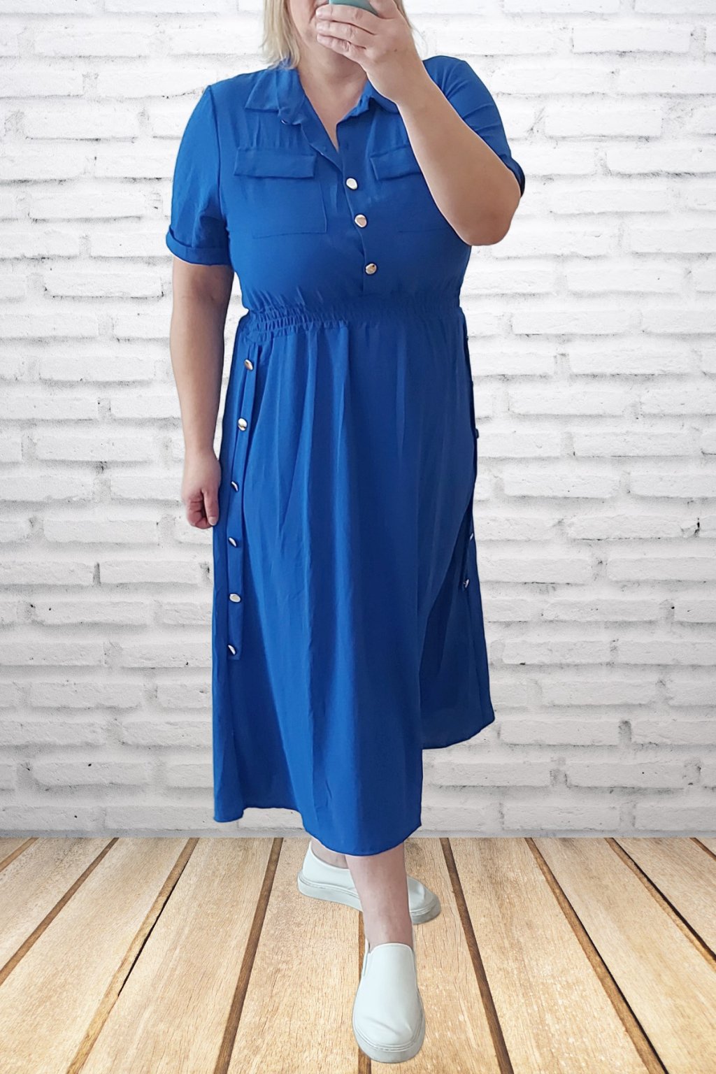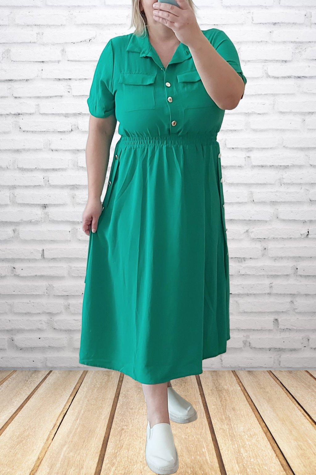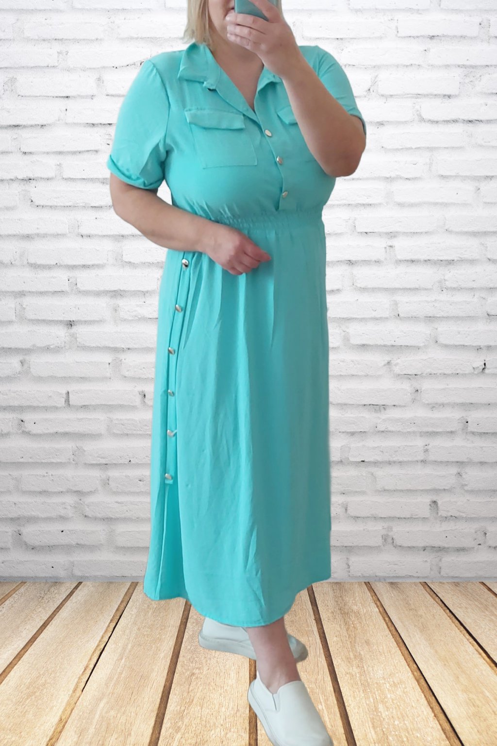 Delší šaty s krátkým rukávem. V pase žabičkování (guma), která při větším poprsí je pod prsy. Výstřih je na knoflíčky zlaté barvy, na prsou kapsičky. Těmi jsou zdobeny i boční švy ve spodní délce. Materiál lehoučký, vzdušný, pružný a na těle velmi příjemný. Vel. L/XL focena na vel. 2XL (prsa 116cm, boky 120cm), výška 165cm.