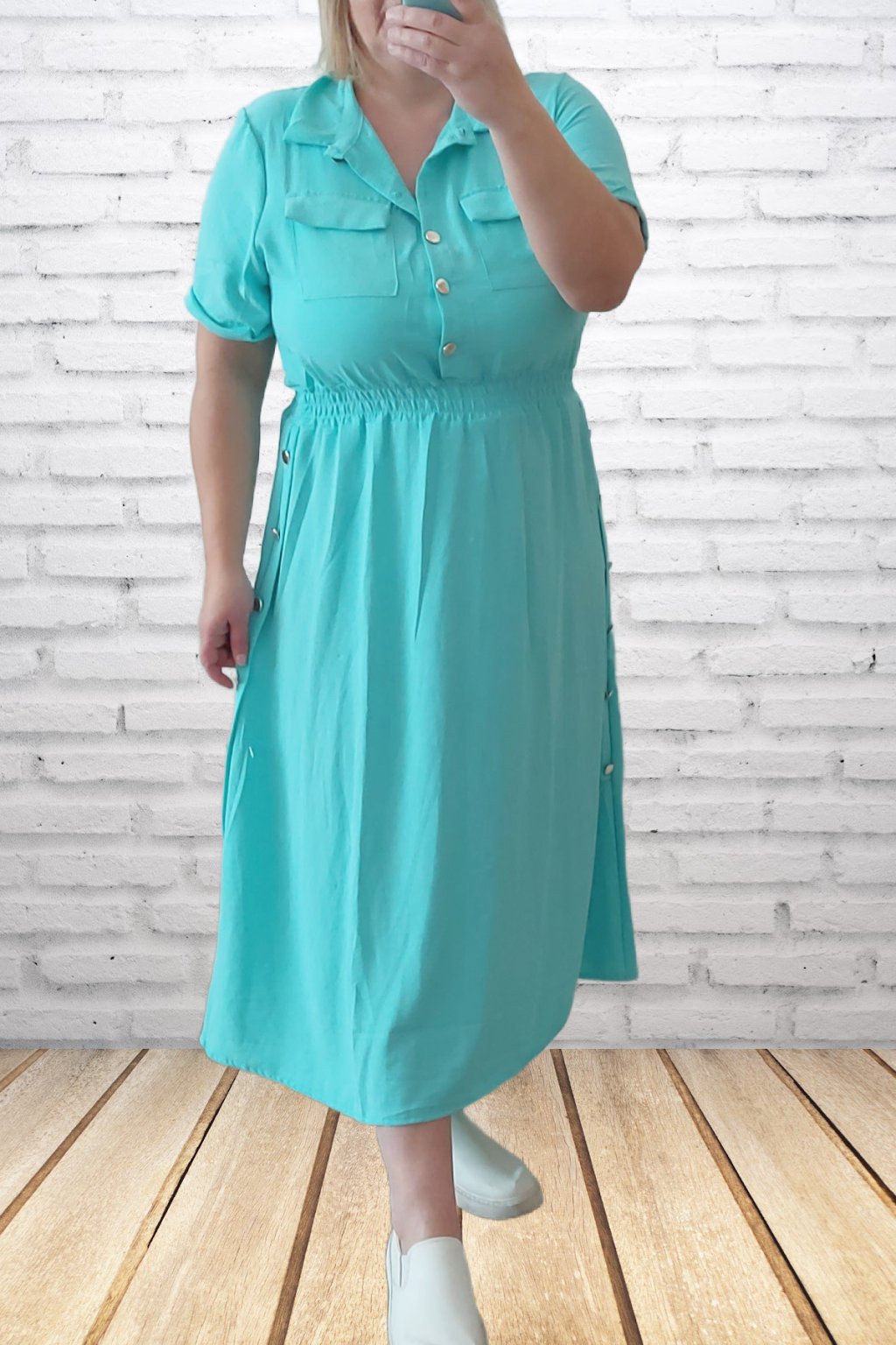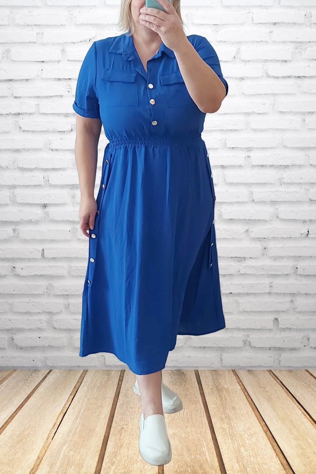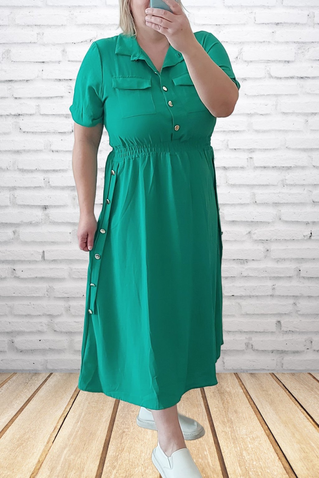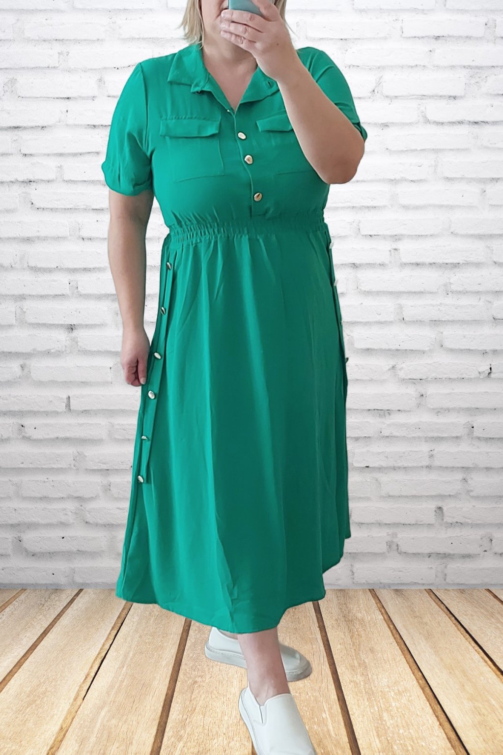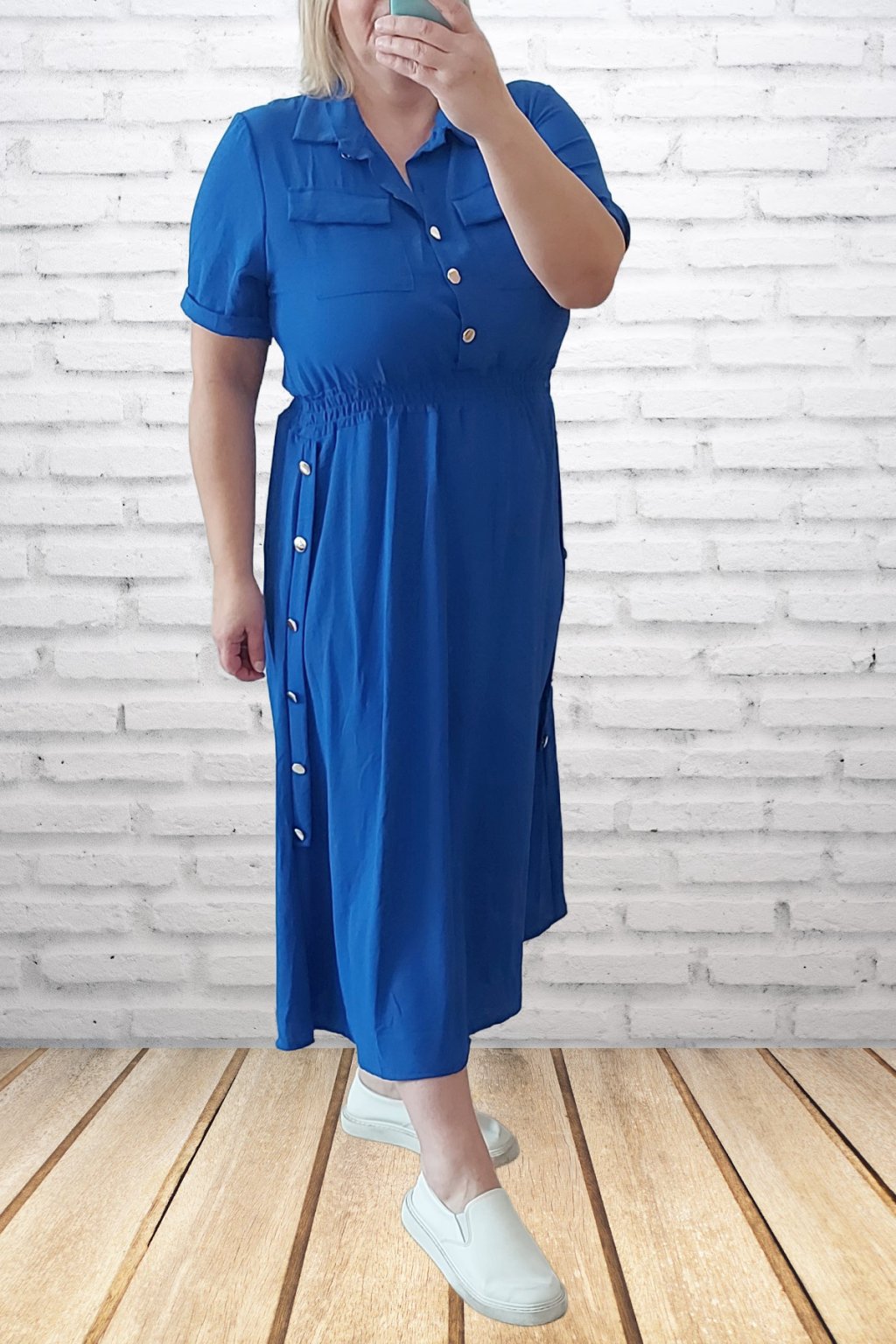 Delší šaty s krátkým rukávem. V pase žabičkování (guma), která při větším poprsí je pod prsy. Výstřih je na knoflíčky zlaté barvy, na prsou kapsičky. Těmi jsou zdobeny i boční švy ve spodní délce. Materiál lehoučký, vzdušný, pružný a na těle velmi příjemný. Vel. L/XL focena na vel. 2XL (prsa 116cm, boky 120cm), výška 165cm.