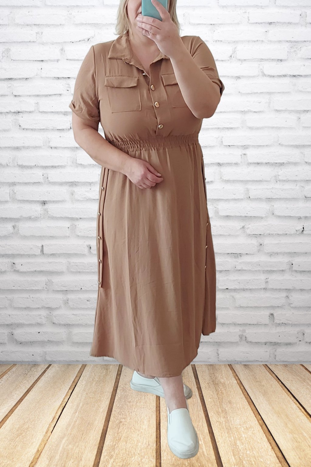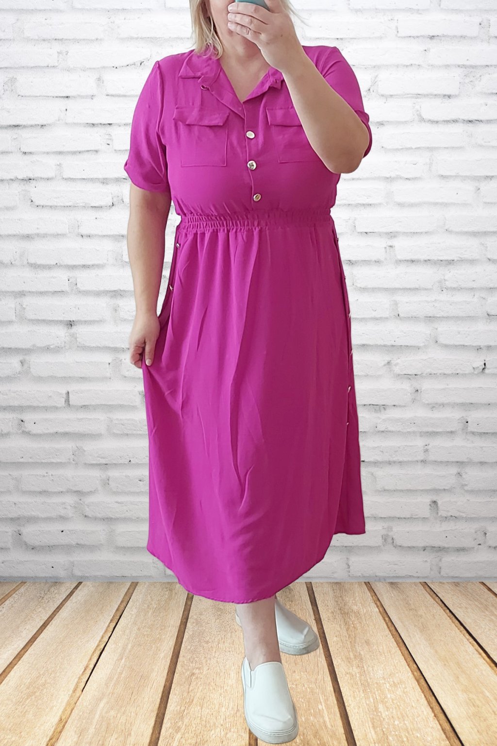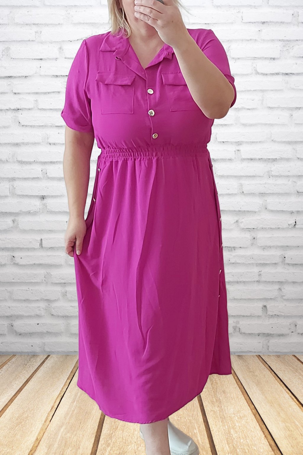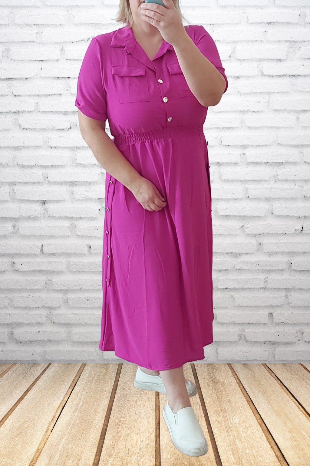 Delší šaty s krátkým rukávem. V pase žabičkování (guma), která při větším poprsí je pod prsy. Výstřih je na knoflíčky zlaté barvy, na prsou kapsičky. Těmi jsou zdobeny i boční švy ve spodní délce. Materiál lehoučký, vzdušný, pružný a na těle velmi příjemný. Vel. L/XL focena na vel. 2XL (prsa 116cm, boky 120cm), výška 165cm.
