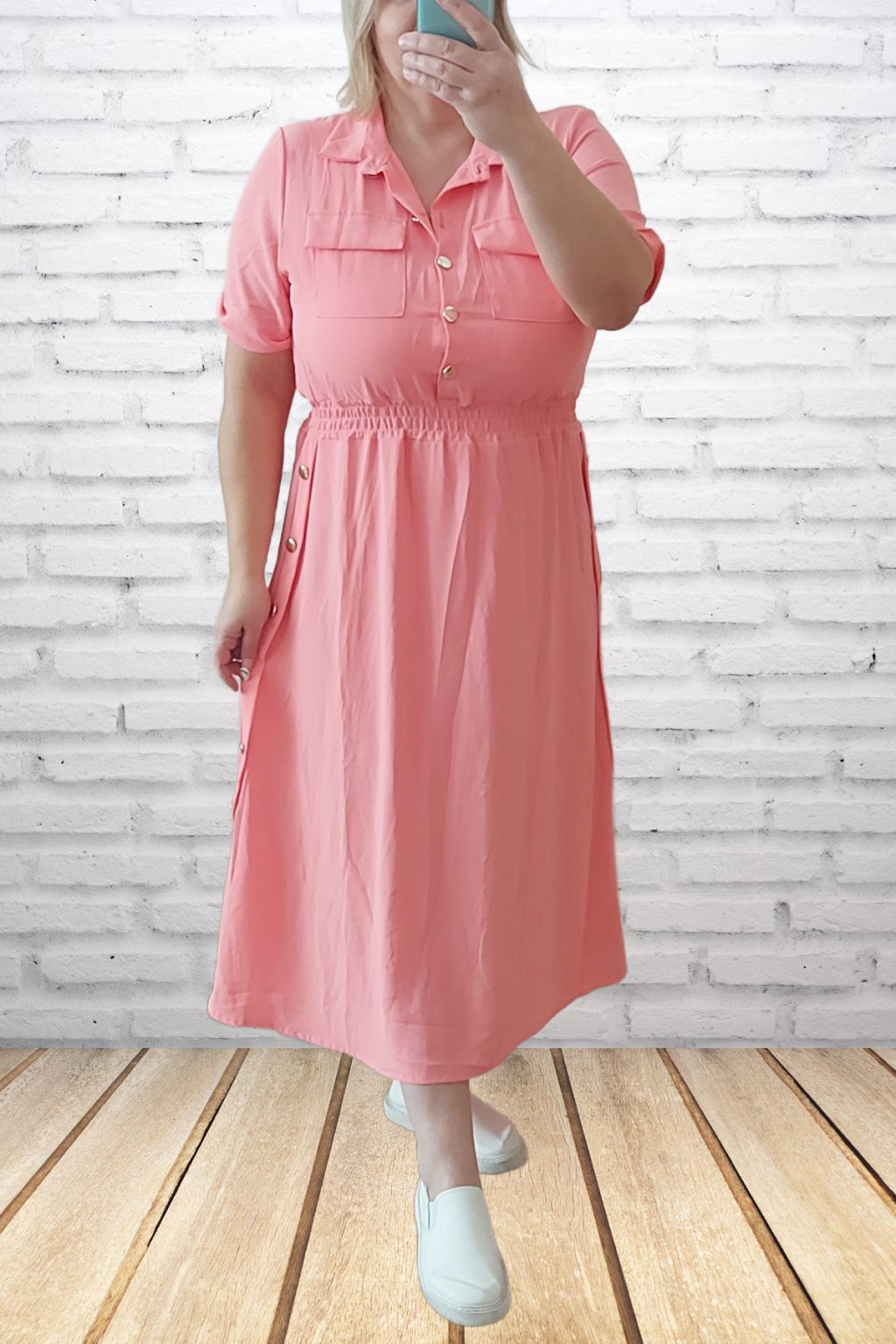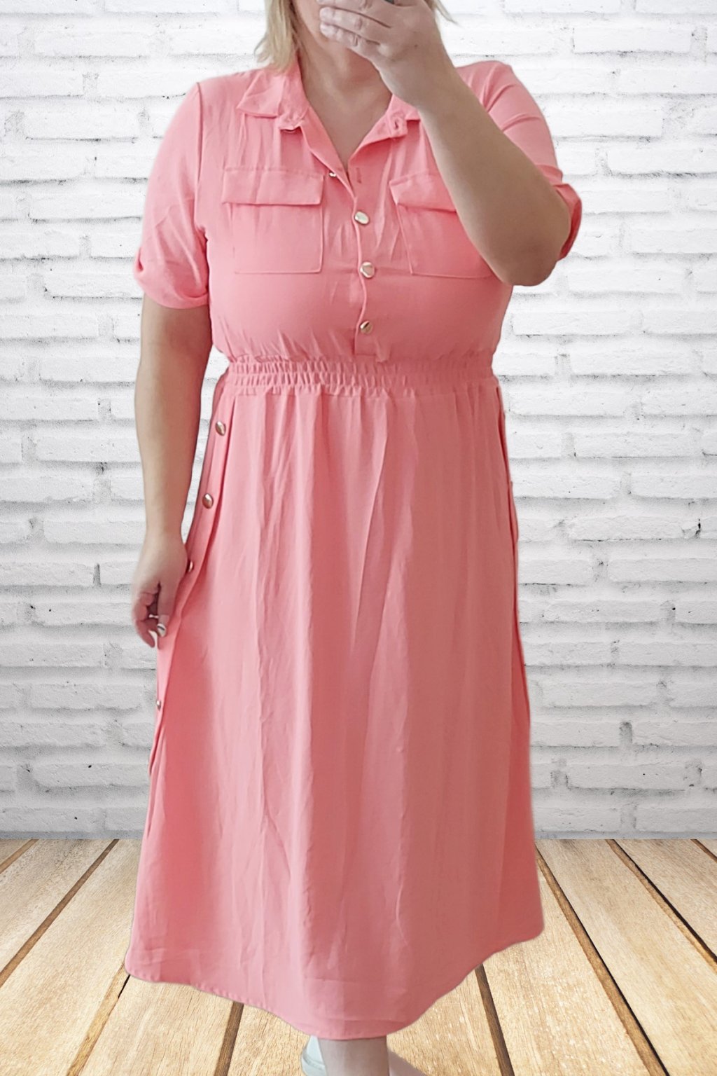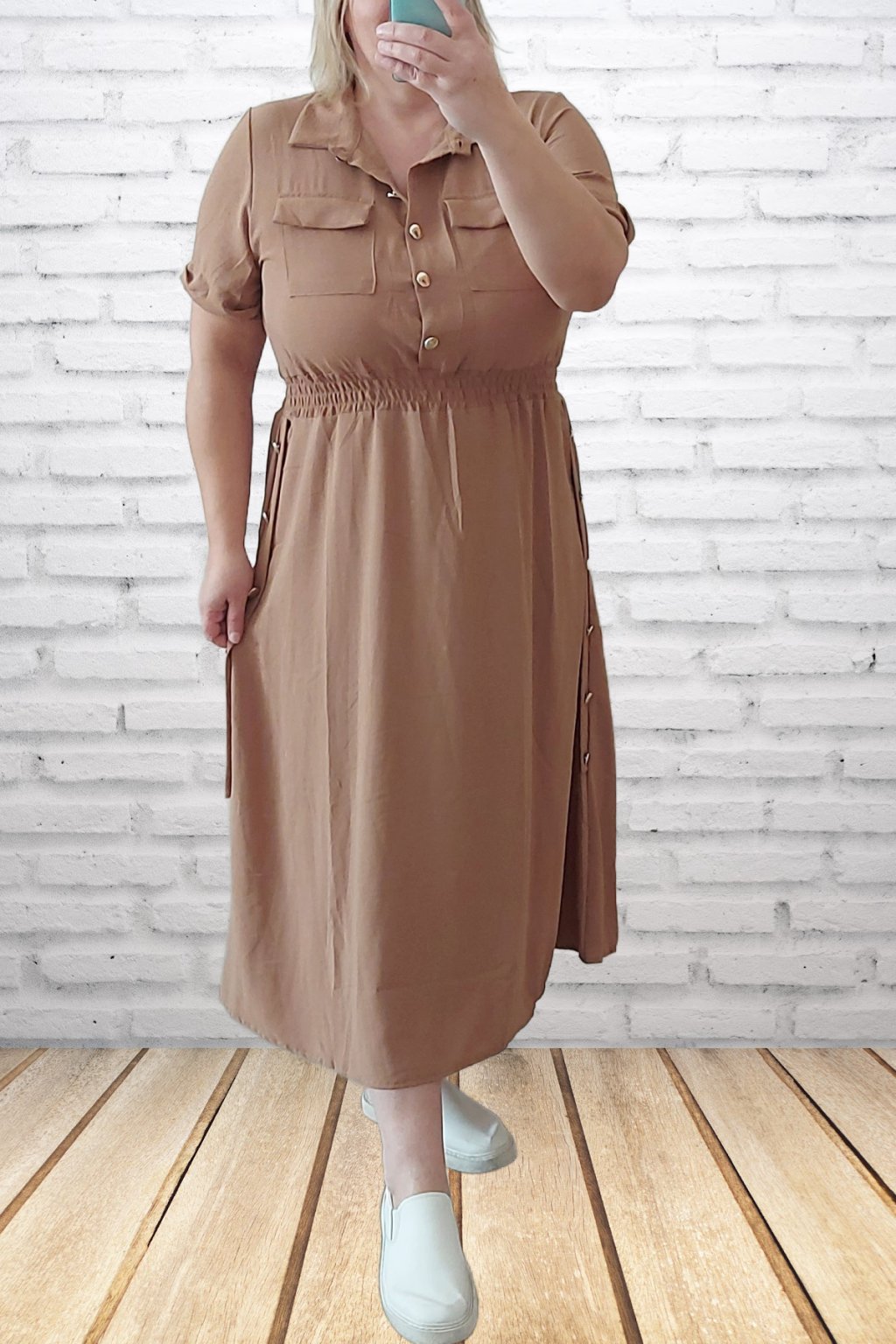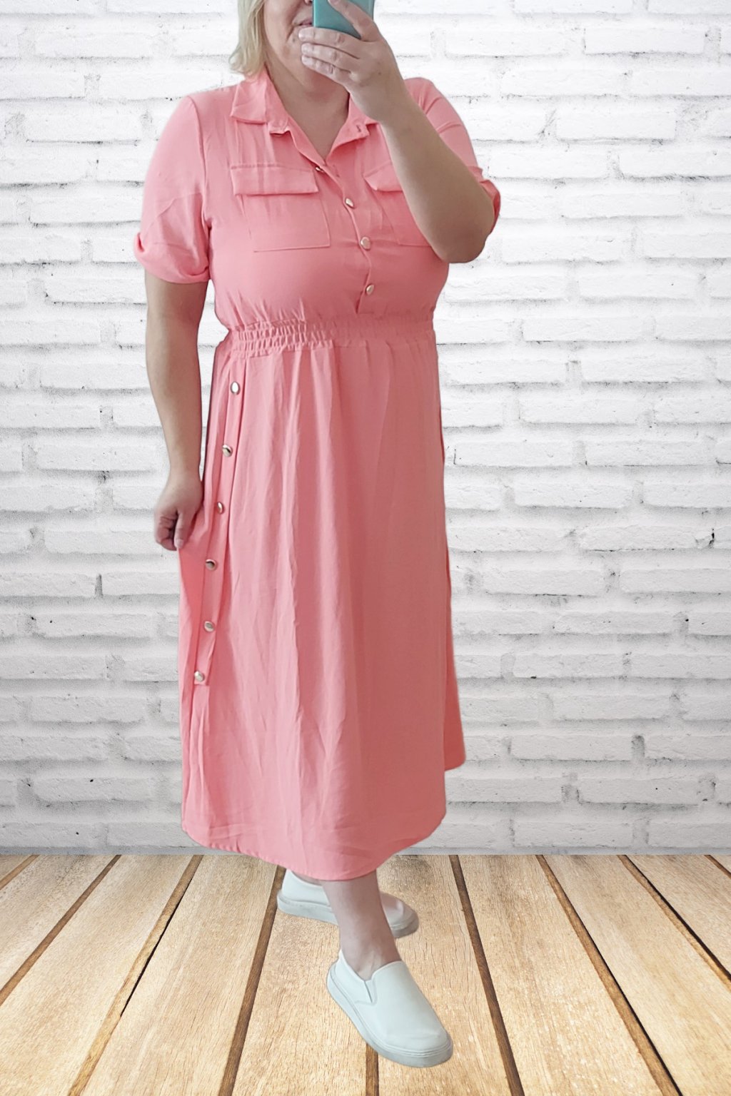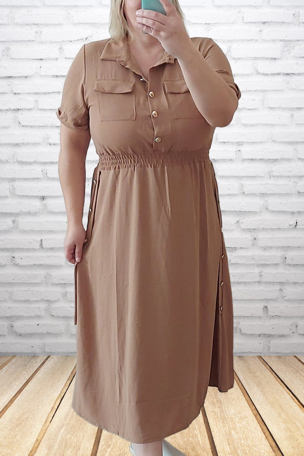 Delší šaty s krátkým rukávem. V pase žabičkování (guma), která při větším poprsí je pod prsy. Výstřih je na knoflíčky zlaté barvy, na prsou kapsičky. Těmi jsou zdobeny i boční švy ve spodní délce. Materiál lehoučký, vzdušný, pružný a na těle velmi příjemný. Vel. L/XL focena na vel. 2XL (prsa 116cm, boky 120cm), výška 165cm.