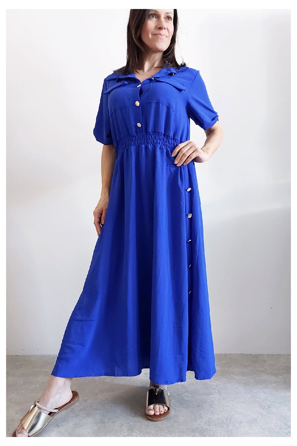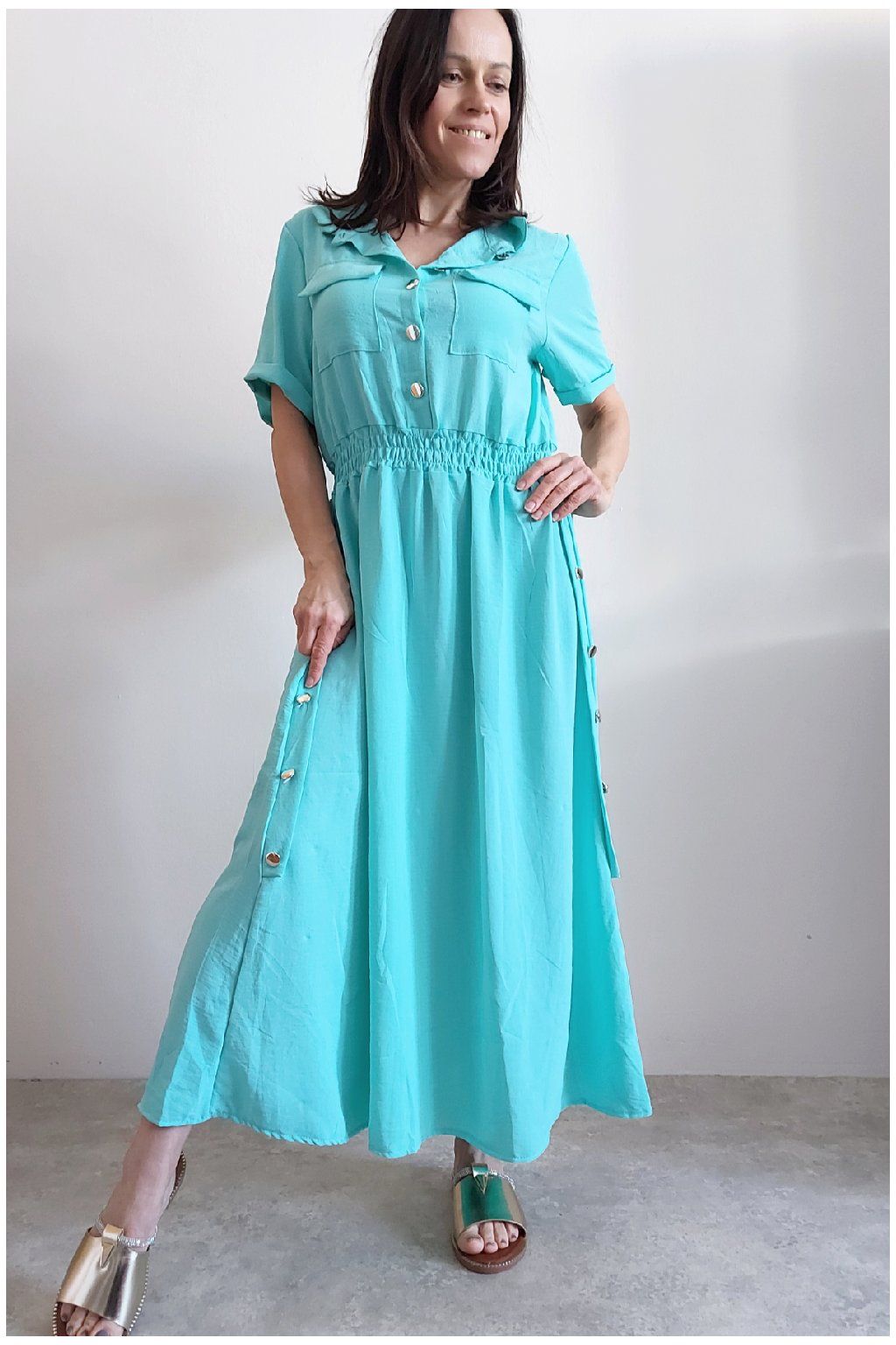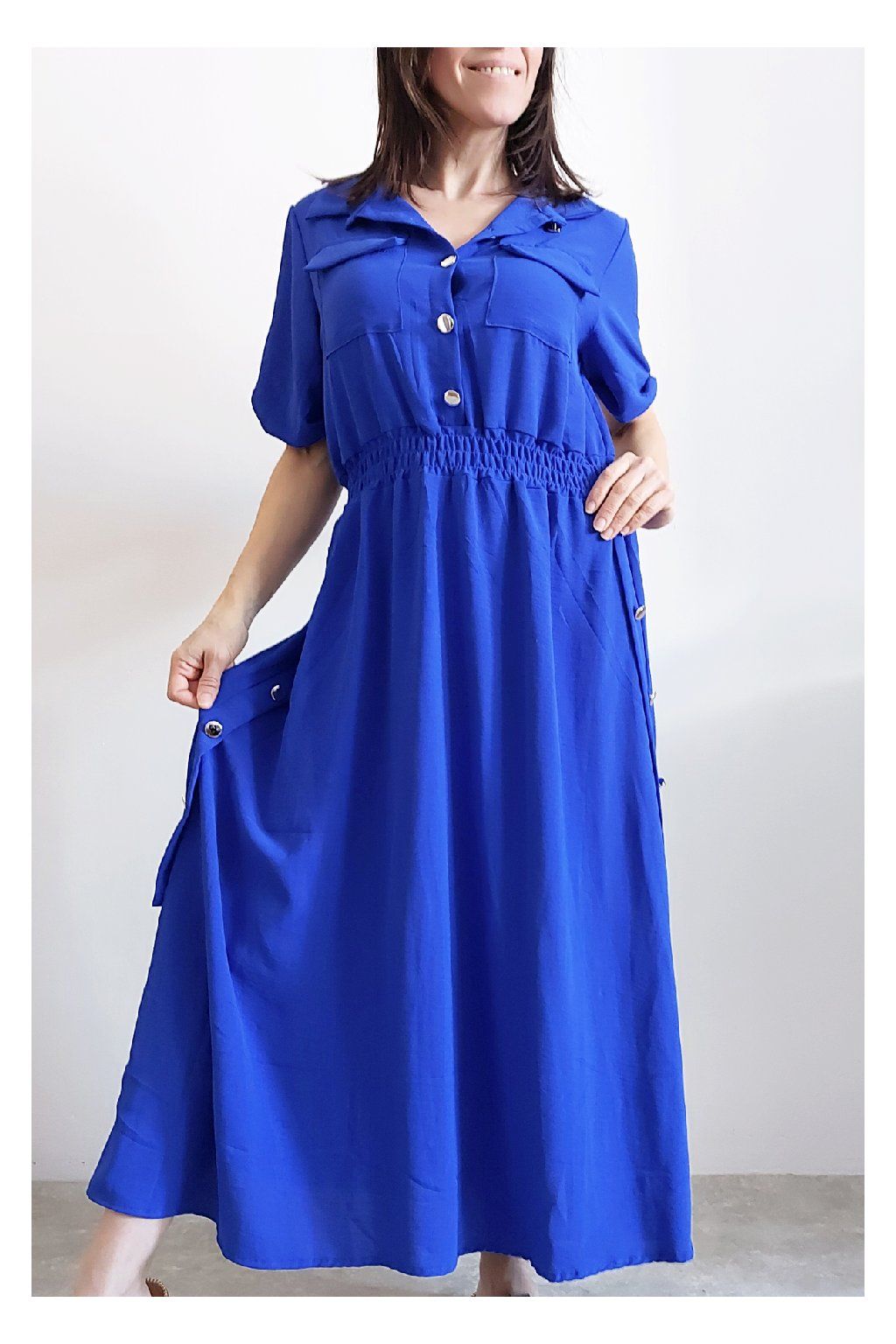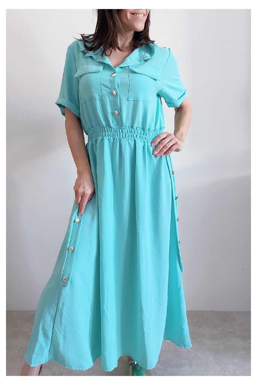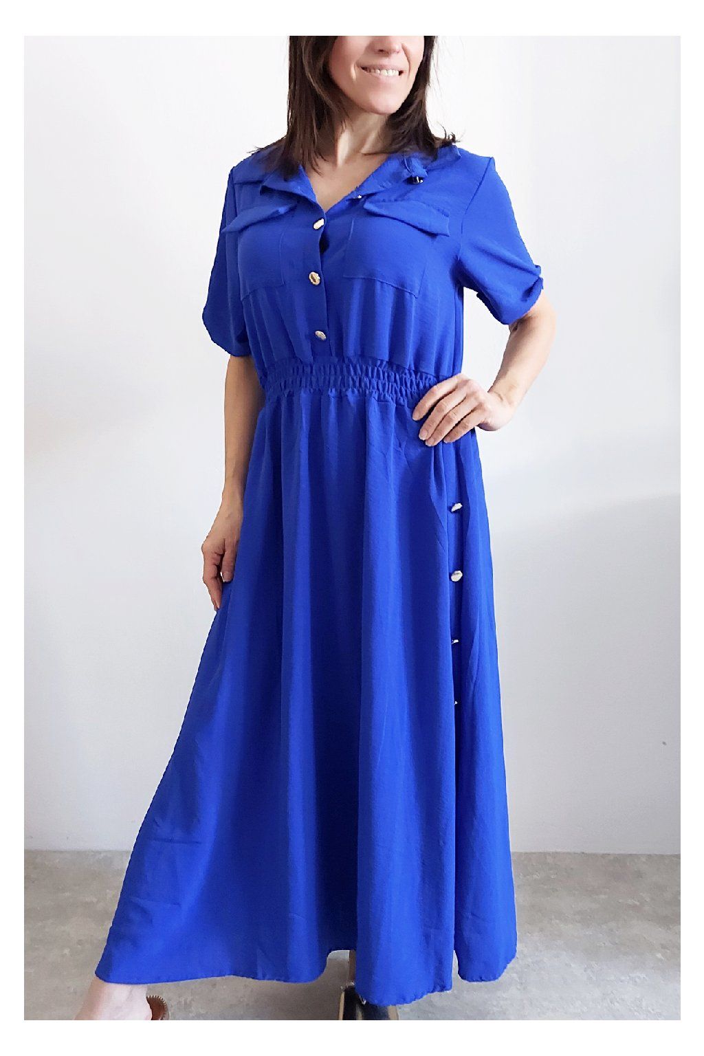 Delší šaty s krátkým rukávem. V pase žabičkování (guma), která při větším poprsí je pod prsy. Výstřih je na knoflíčky zlaté barvy, na prsou kapsičky. Těmi jsou zdobeny i boční švy ve spodní délce. Materiál lehoučký, vzdušný, pružný a na těle velmi příjemný. Vel. ¨S/M focena na vel. XS, výška 156cm a vel. L/XL focena na vel. 2XL (prsa 116cm, boky 120cm), výška 165cm.