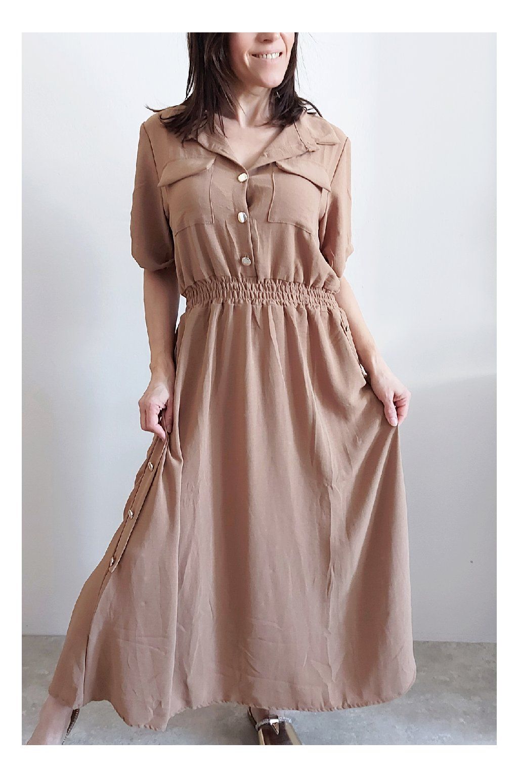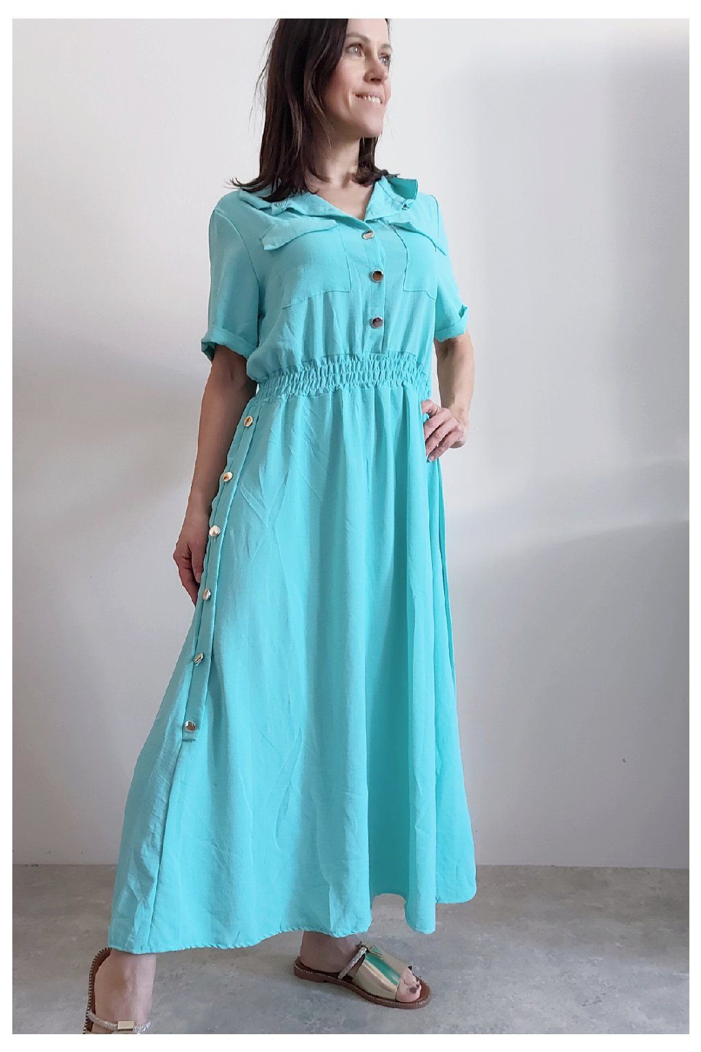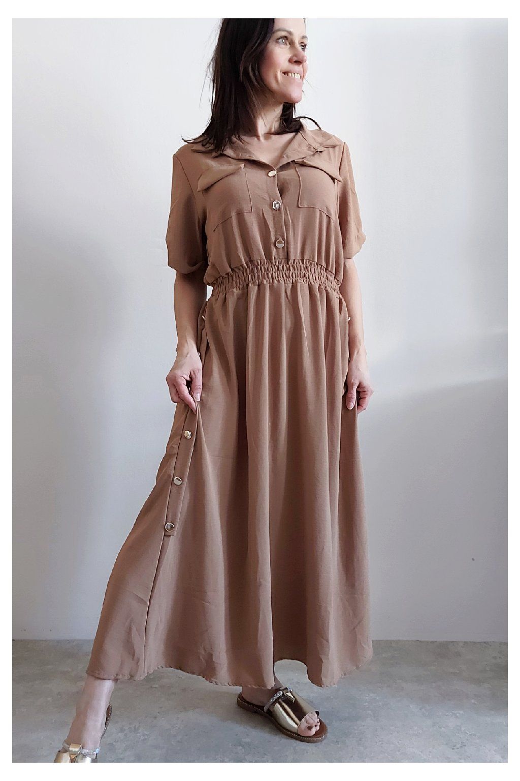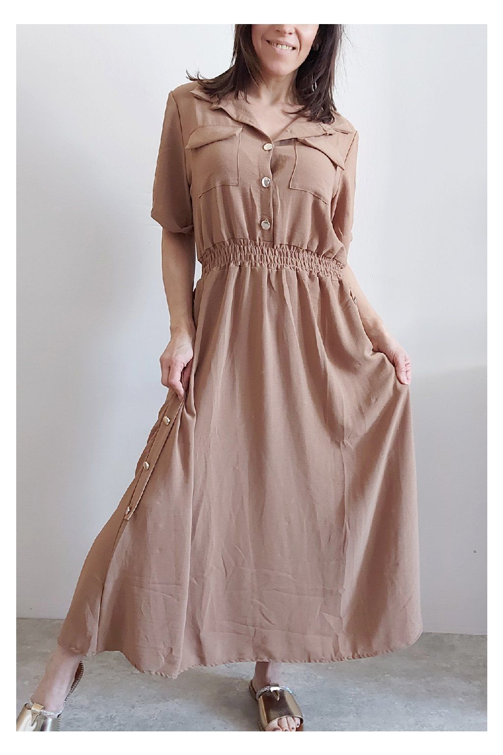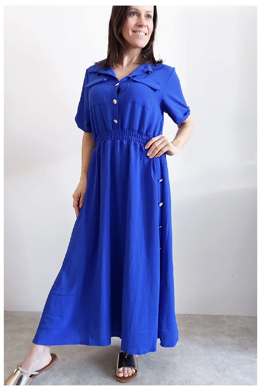 Delší šaty s krátkým rukávem. V pase žabičkování (guma), která při větším poprsí je pod prsy. Výstřih je na knoflíčky zlaté barvy, na prsou kapsičky. Těmi jsou zdobeny i boční švy ve spodní délce. Materiál lehoučký, vzdušný, pružný a na těle velmi příjemný. Vel. ¨S/M focena na vel. XS, výška 156cm a vel. L/XL focena na vel. 2XL (prsa 116cm, boky 120cm), výška 165cm.