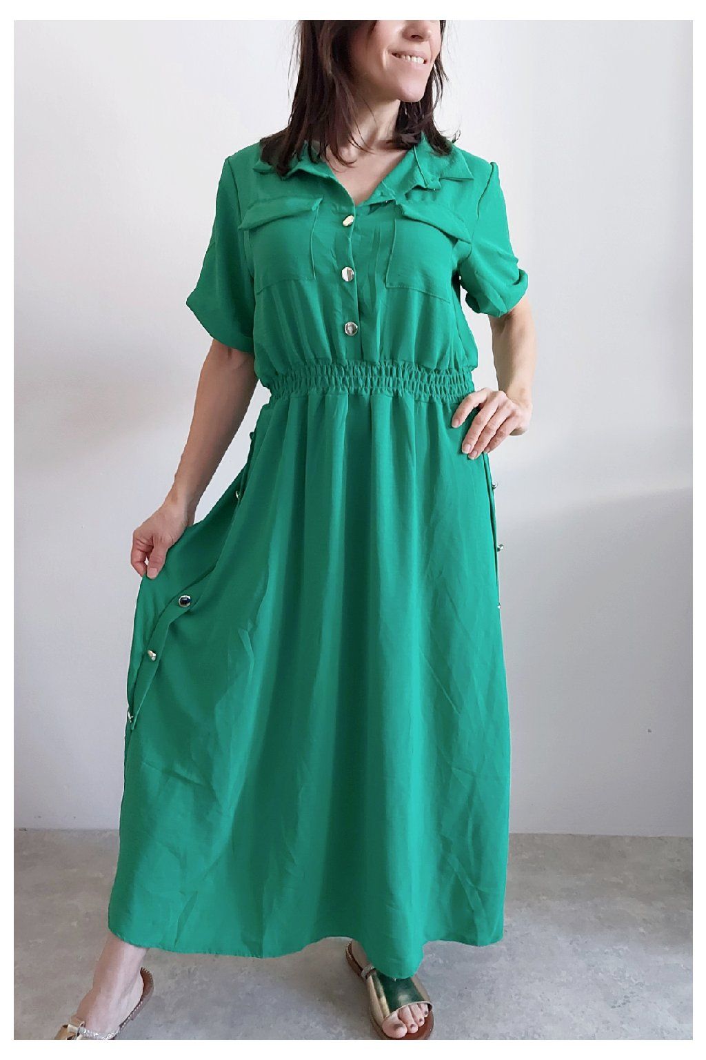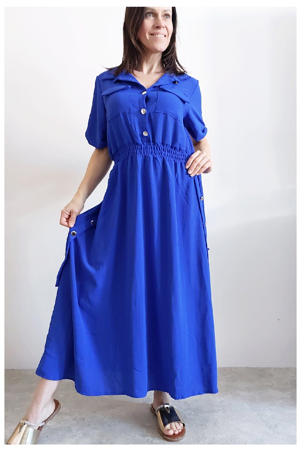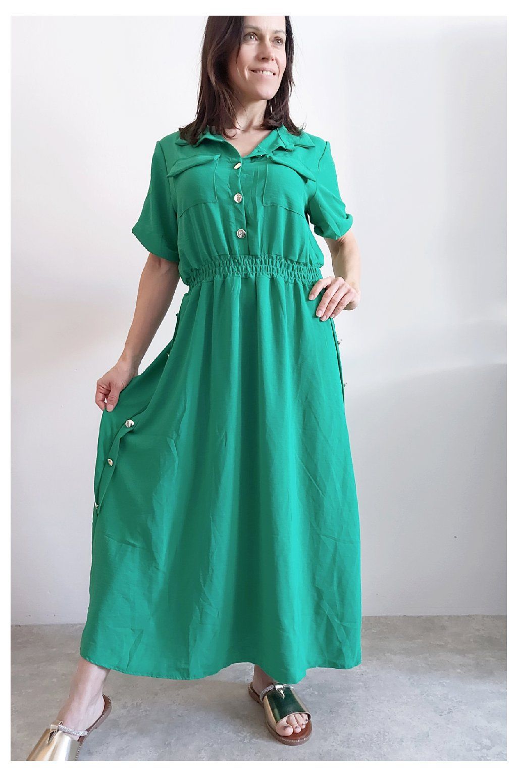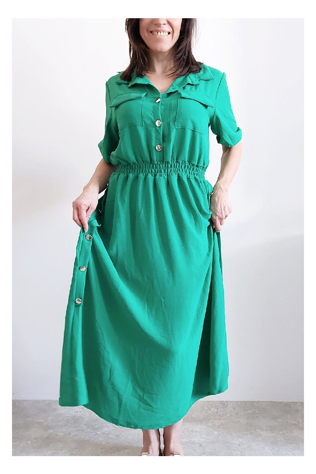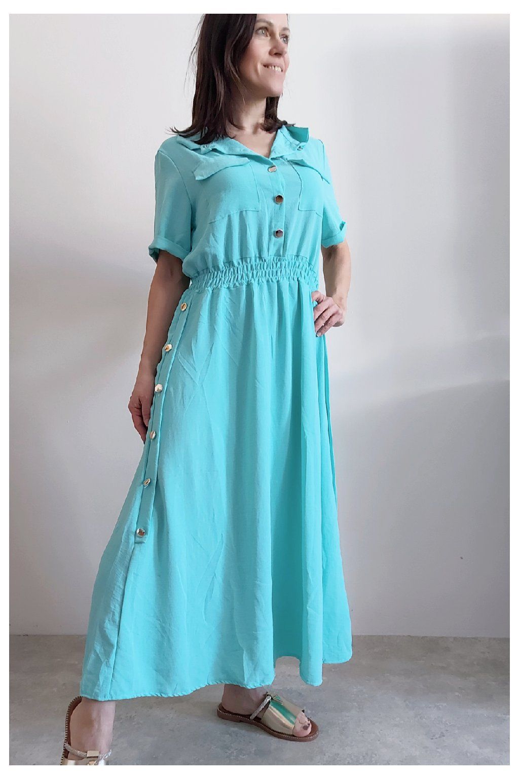 Delší šaty s krátkým rukávem. V pase žabičkování (guma), která při větším poprsí je pod prsy. Výstřih je na knoflíčky zlaté barvy, na prsou kapsičky. Těmi jsou zdobeny i boční švy ve spodní délce. Materiál lehoučký, vzdušný, pružný a na těle velmi příjemný. Vel. ¨S/M focena na vel. XS, výška 156cm a vel. L/XL focena na vel. 2XL (prsa 116cm, boky 120cm), výška 165cm.