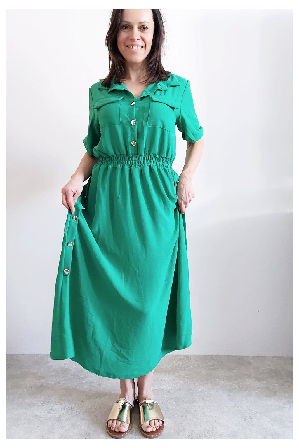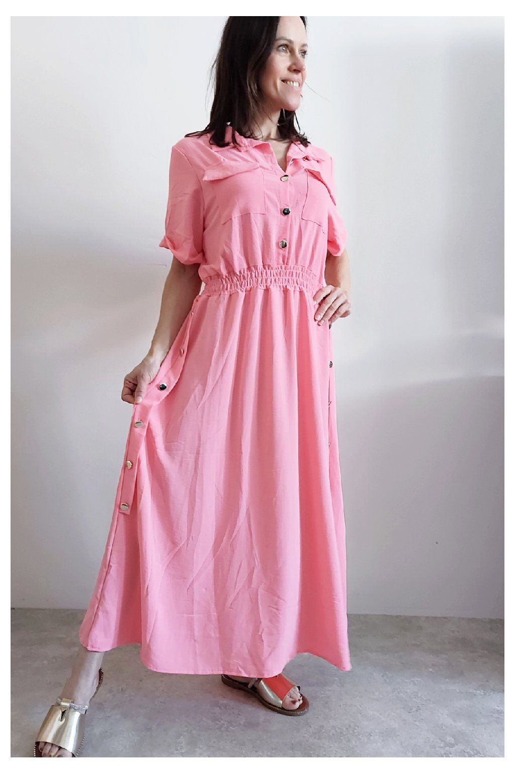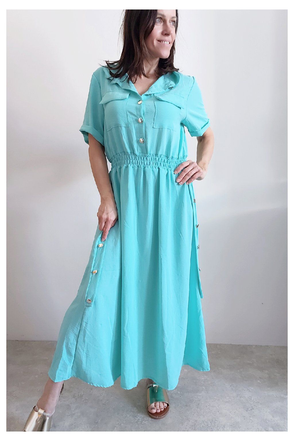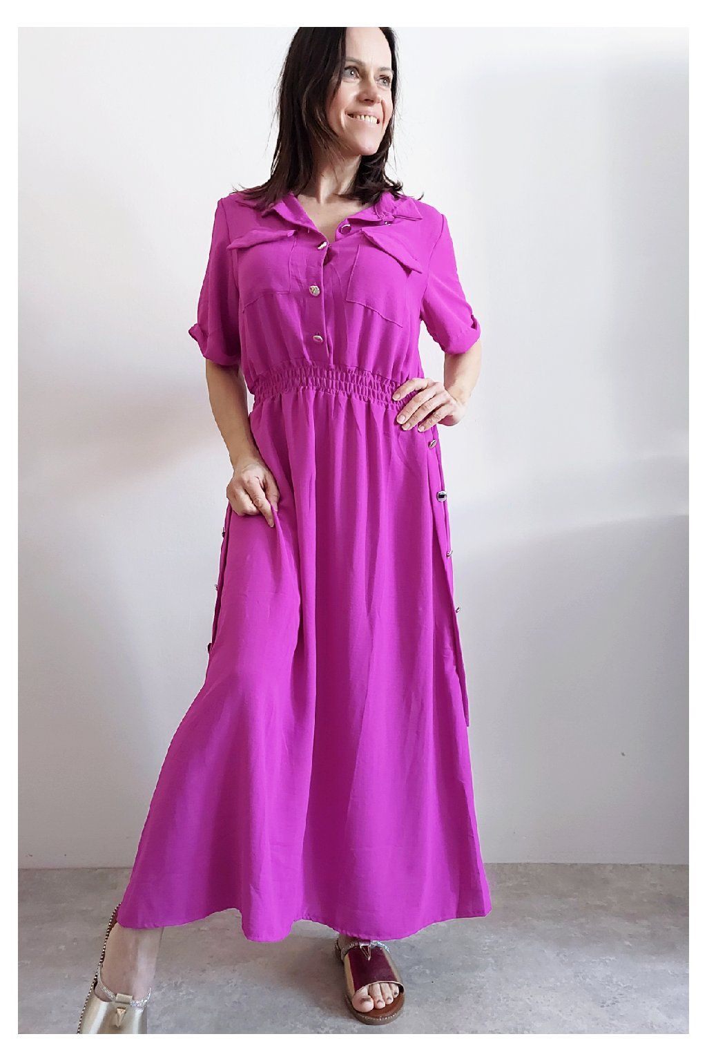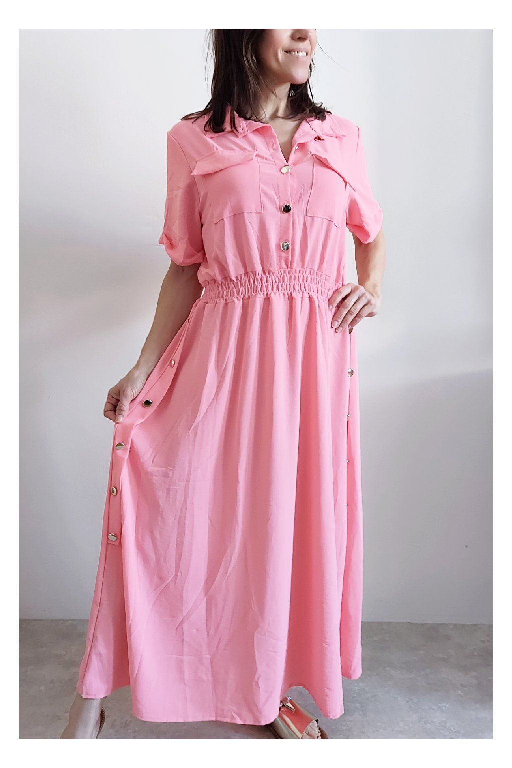 Delší šaty s krátkým rukávem. V pase žabičkování (guma), která při větším poprsí je pod prsy. Výstřih je na knoflíčky zlaté barvy, na prsou kapsičky. Těmi jsou zdobeny i boční švy ve spodní délce. Materiál lehoučký, vzdušný, pružný a na těle velmi příjemný. Vel. ¨S/M focena na vel. XS, výška 156cm a vel. L/XL focena na vel. 2XL (prsa 116cm, boky 120cm), výška 165cm.