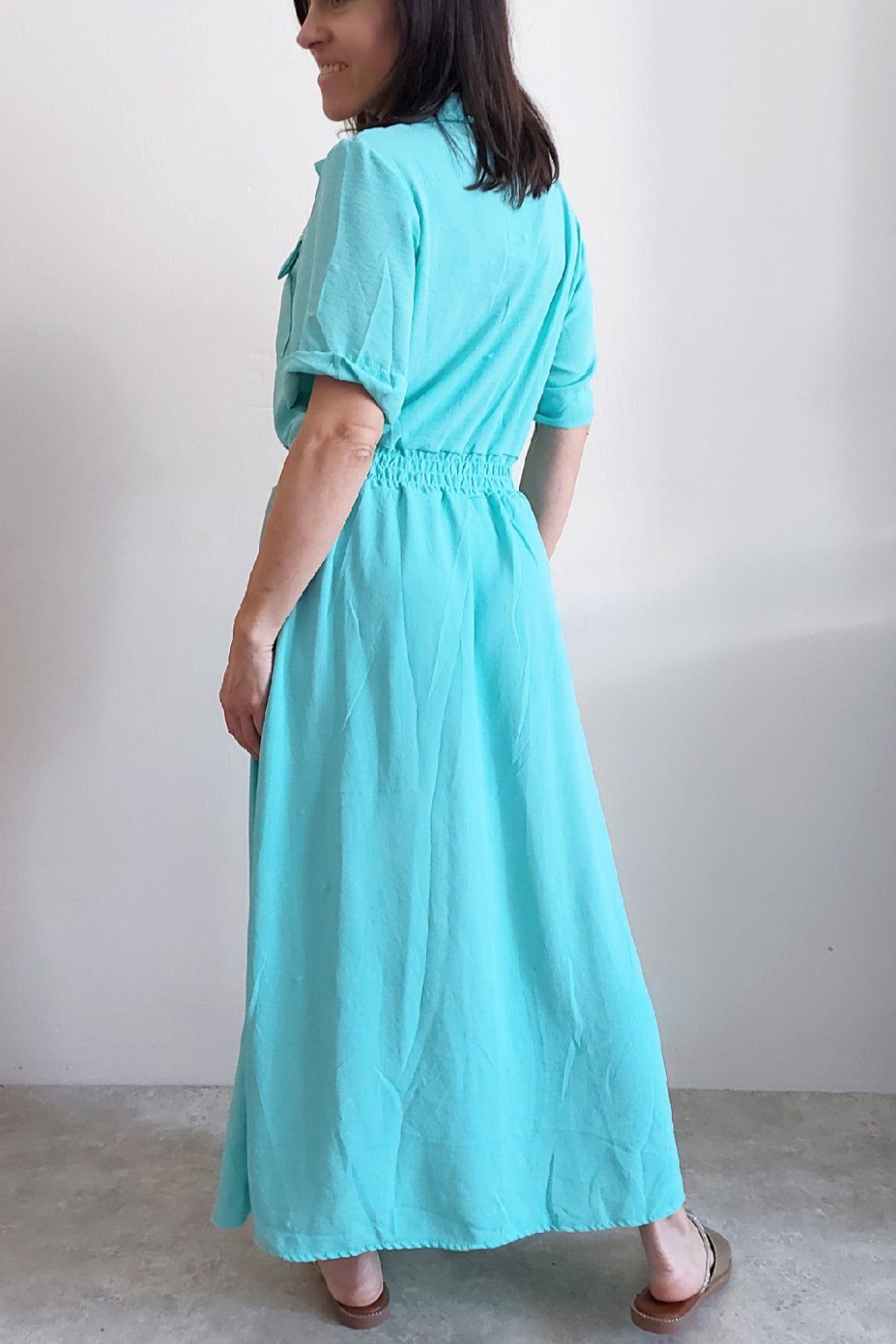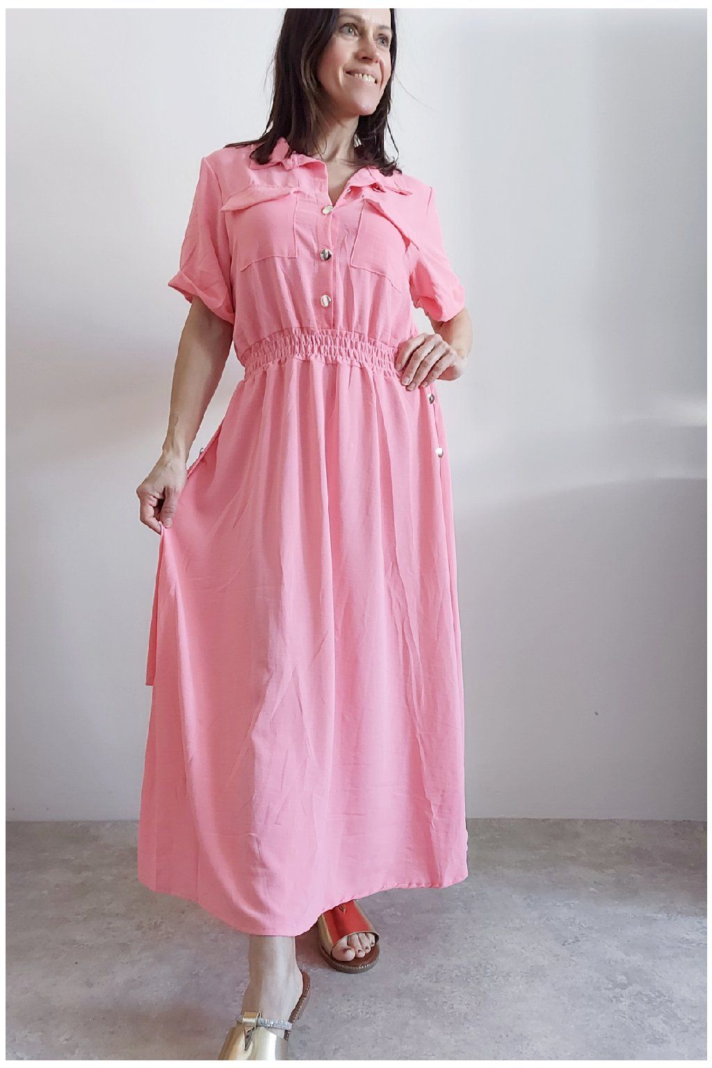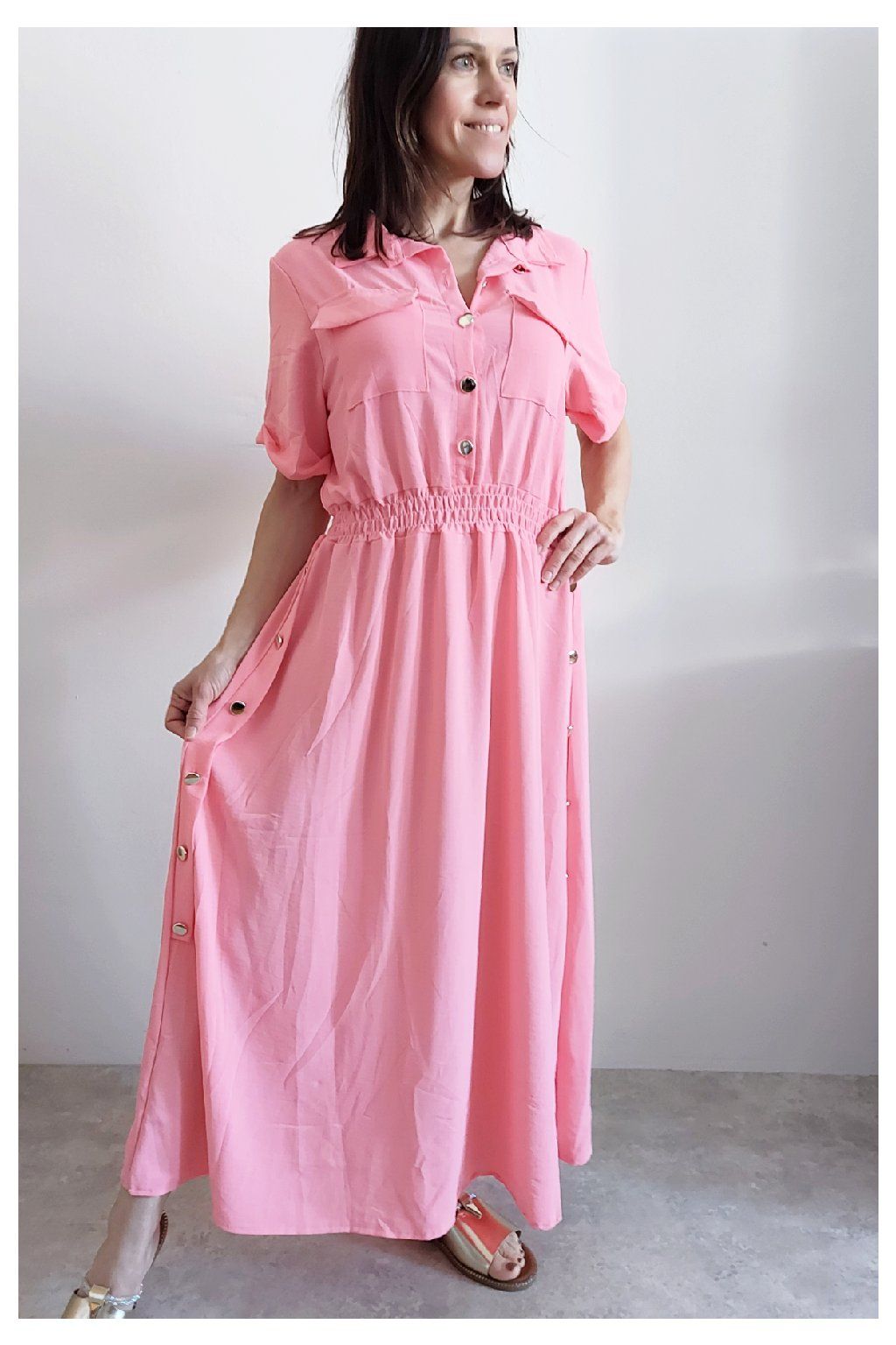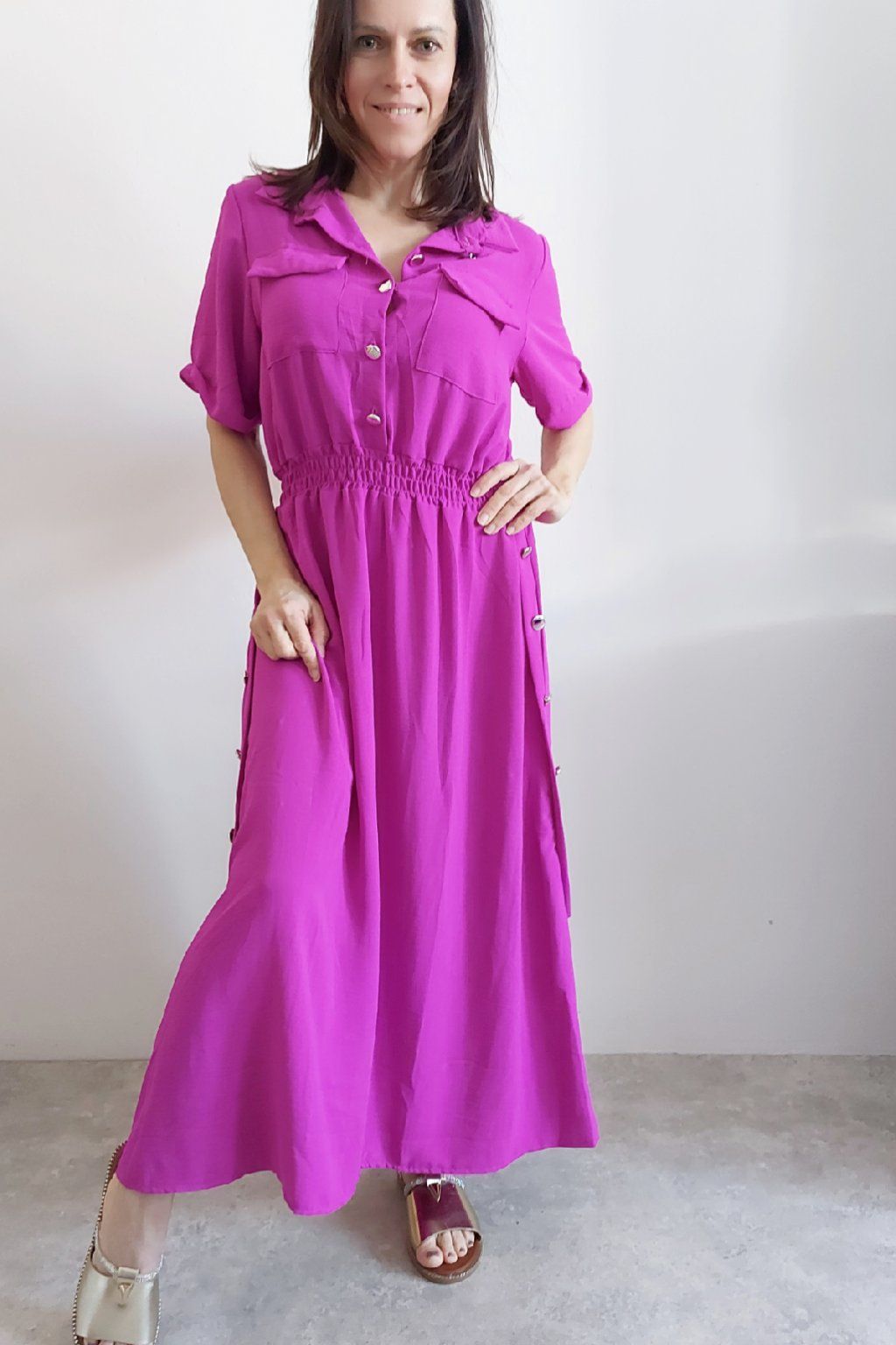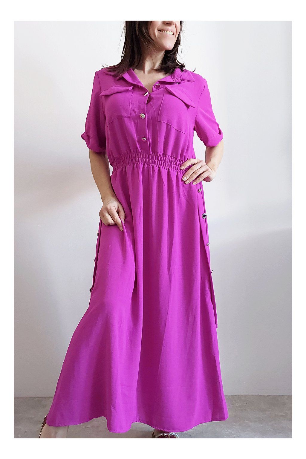 Delší šaty s krátkým rukávem. V pase žabičkování (guma), která při větším poprsí je pod prsy. Výstřih je na knoflíčky zlaté barvy, na prsou kapsičky. Těmi jsou zdobeny i boční švy ve spodní délce. Materiál lehoučký, vzdušný, pružný a na těle velmi příjemný. Vel. ¨S/M focena na vel. XS, výška 156cm a vel. L/XL focena na vel. 2XL (prsa 116cm, boky 120cm), výška 165cm.