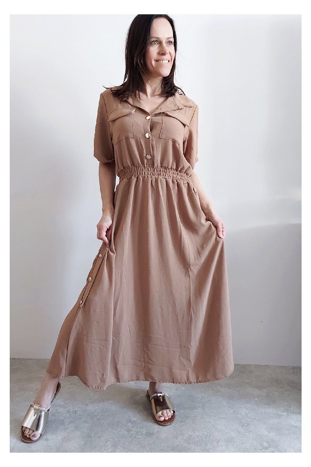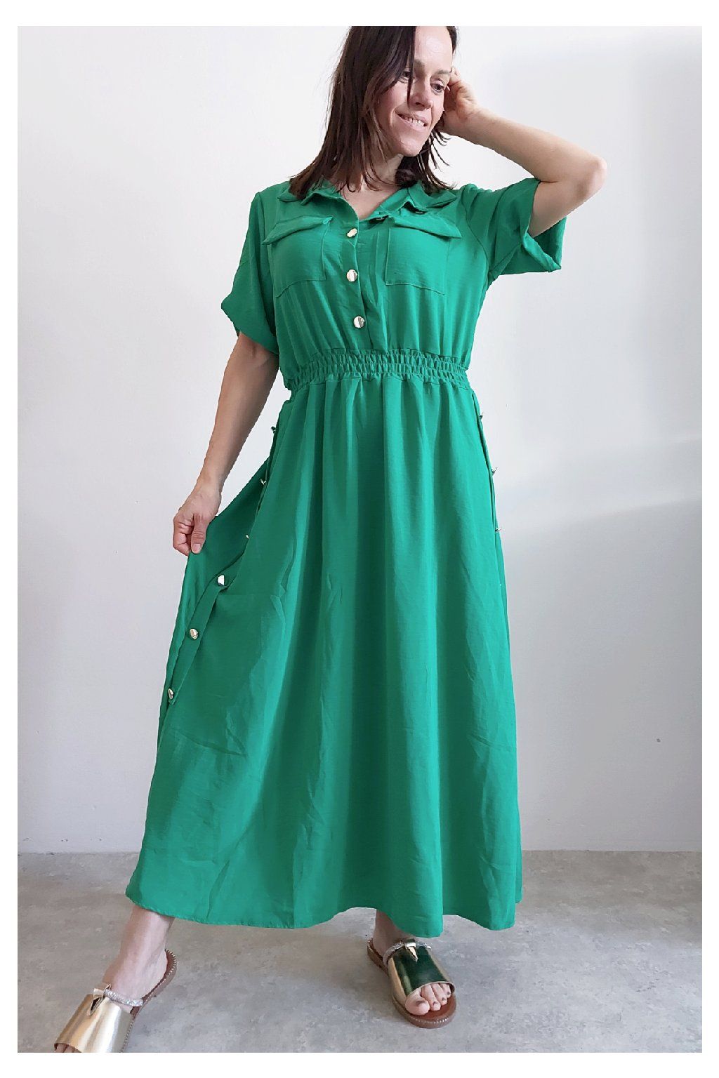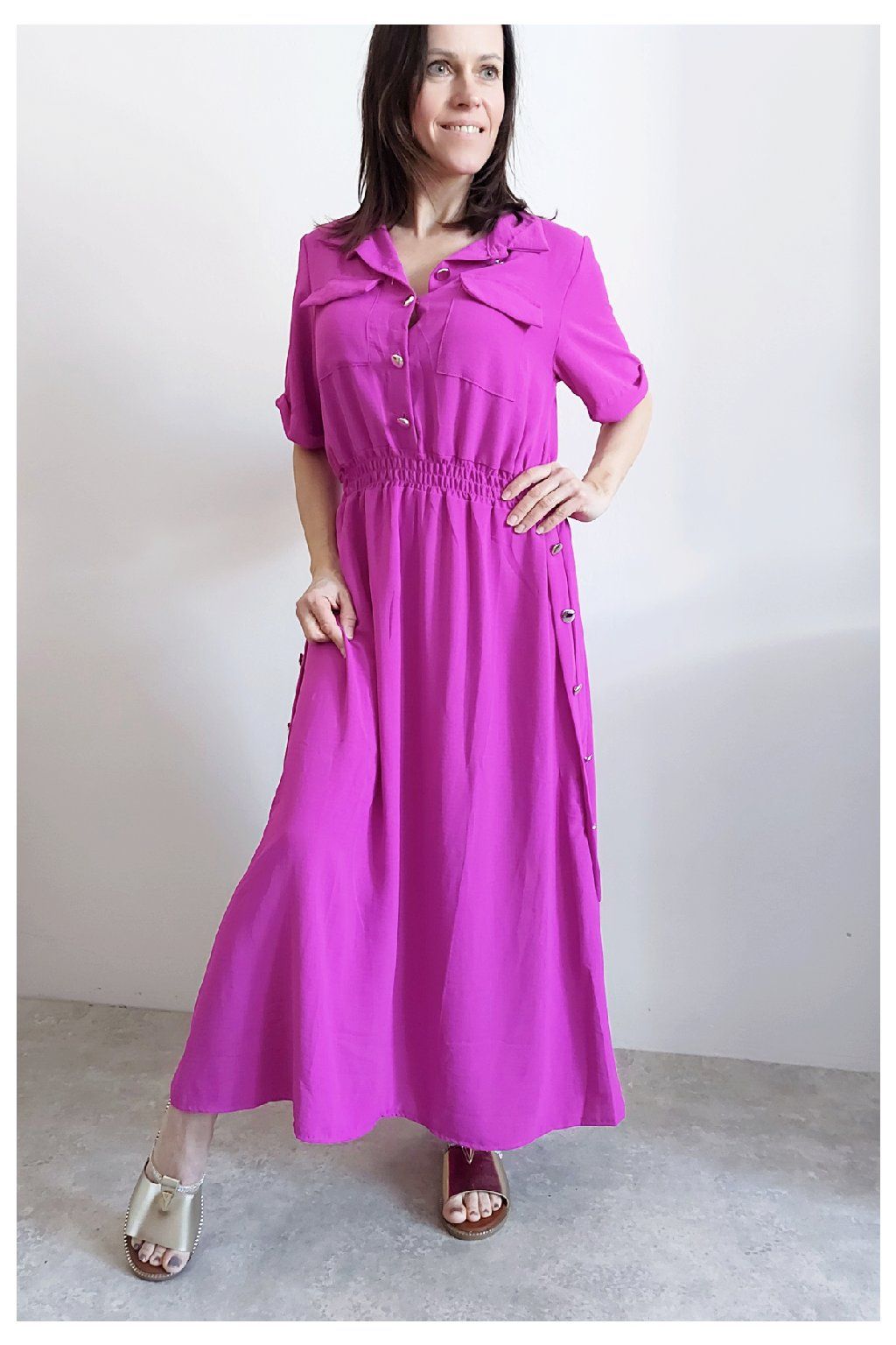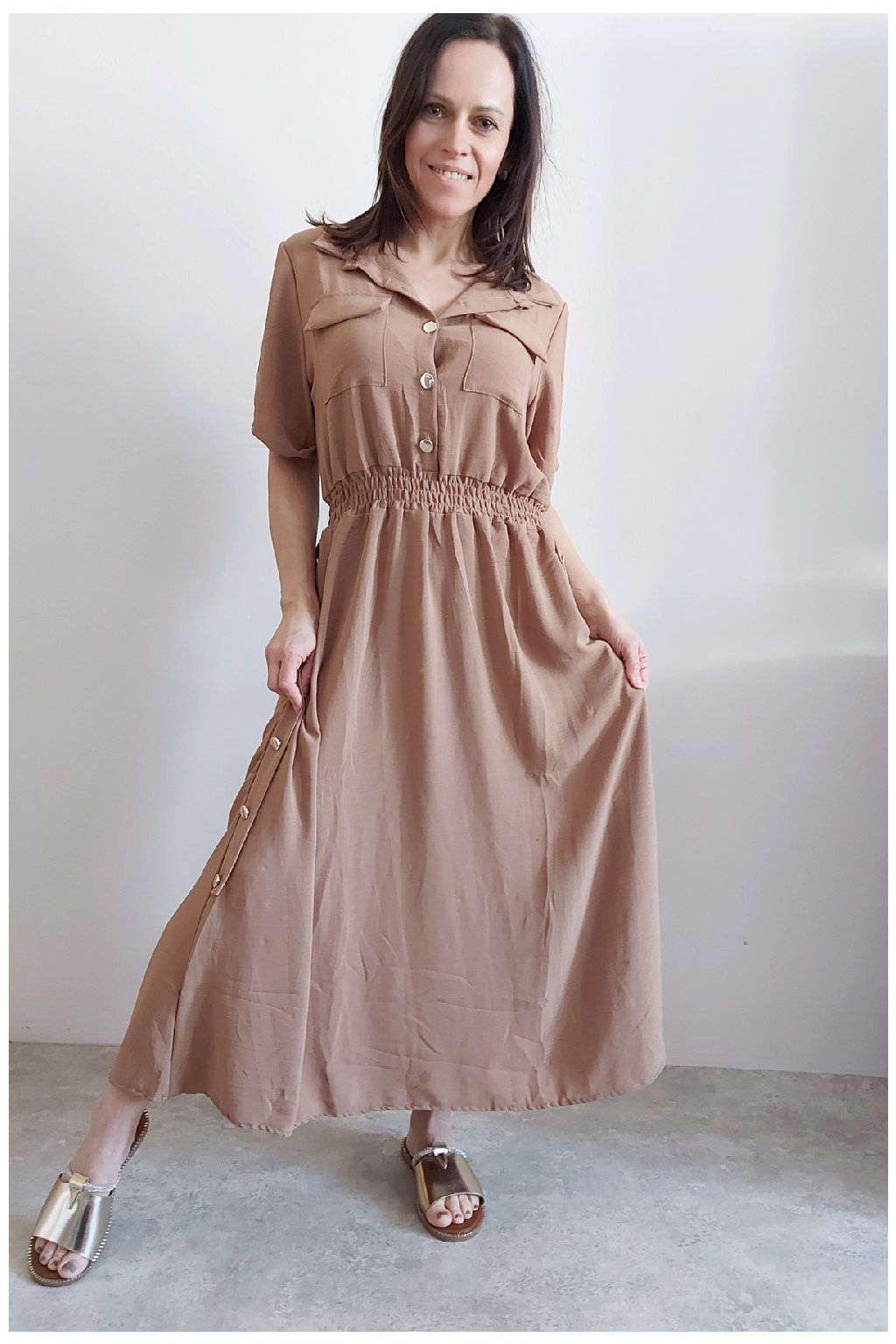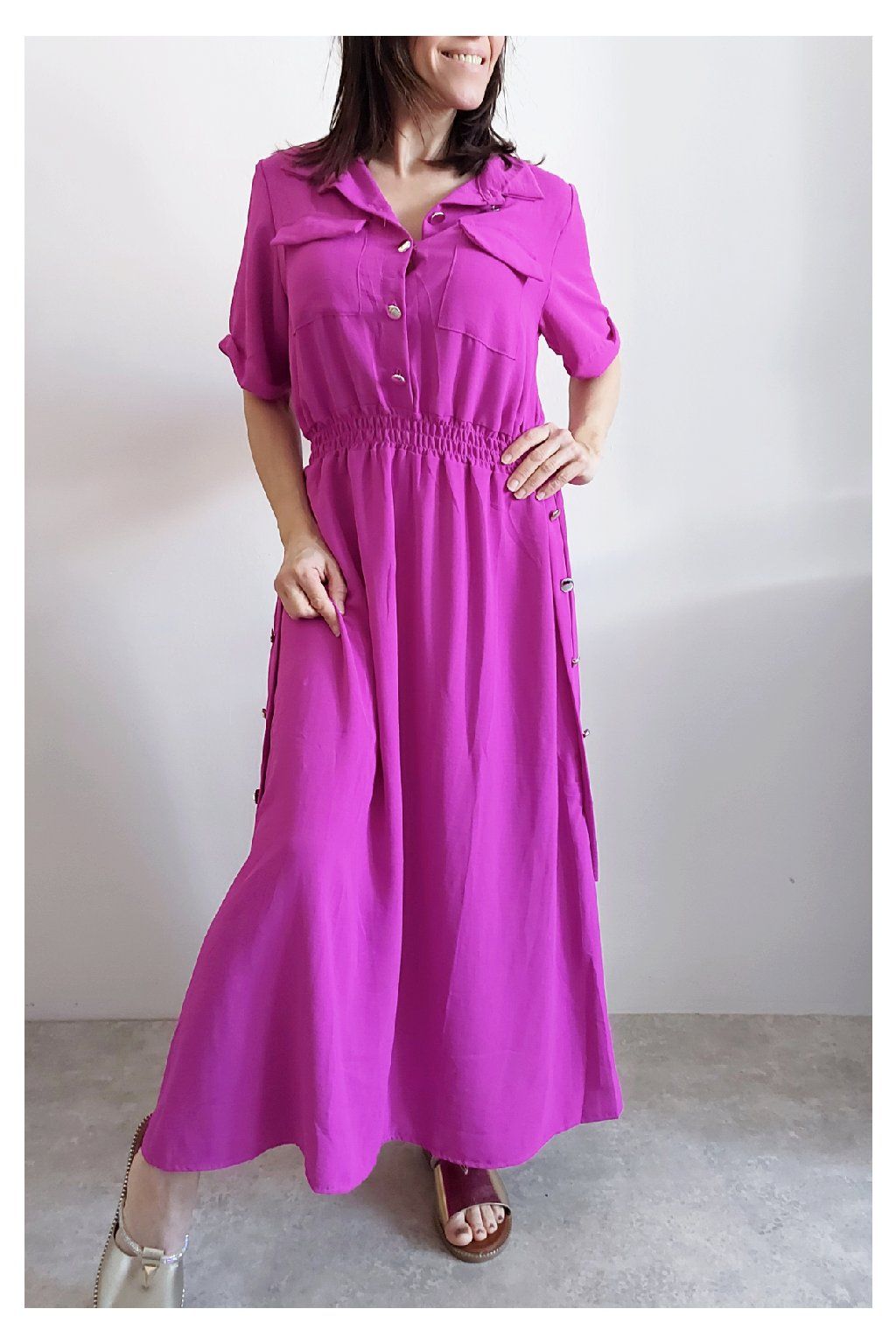 Delší šaty s krátkým rukávem. V pase žabičkování (guma), která při větším poprsí je pod prsy. Výstřih je na knoflíčky zlaté barvy, na prsou kapsičky. Těmi jsou zdobeny i boční švy ve spodní délce. Materiál lehoučký, vzdušný, pružný a na těle velmi příjemný. Vel. ¨S/M focena na vel. XS, výška 156cm a vel. L/XL focena na vel. 2XL (prsa 116cm, boky 120cm), výška 165cm.