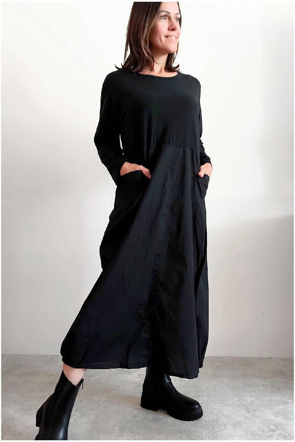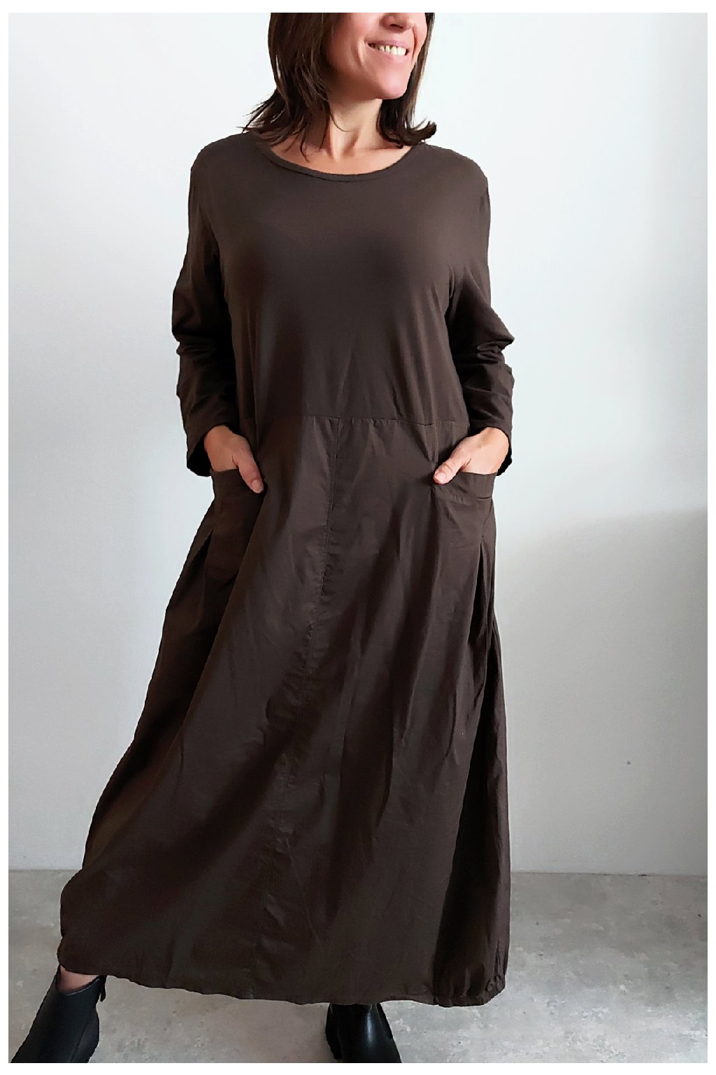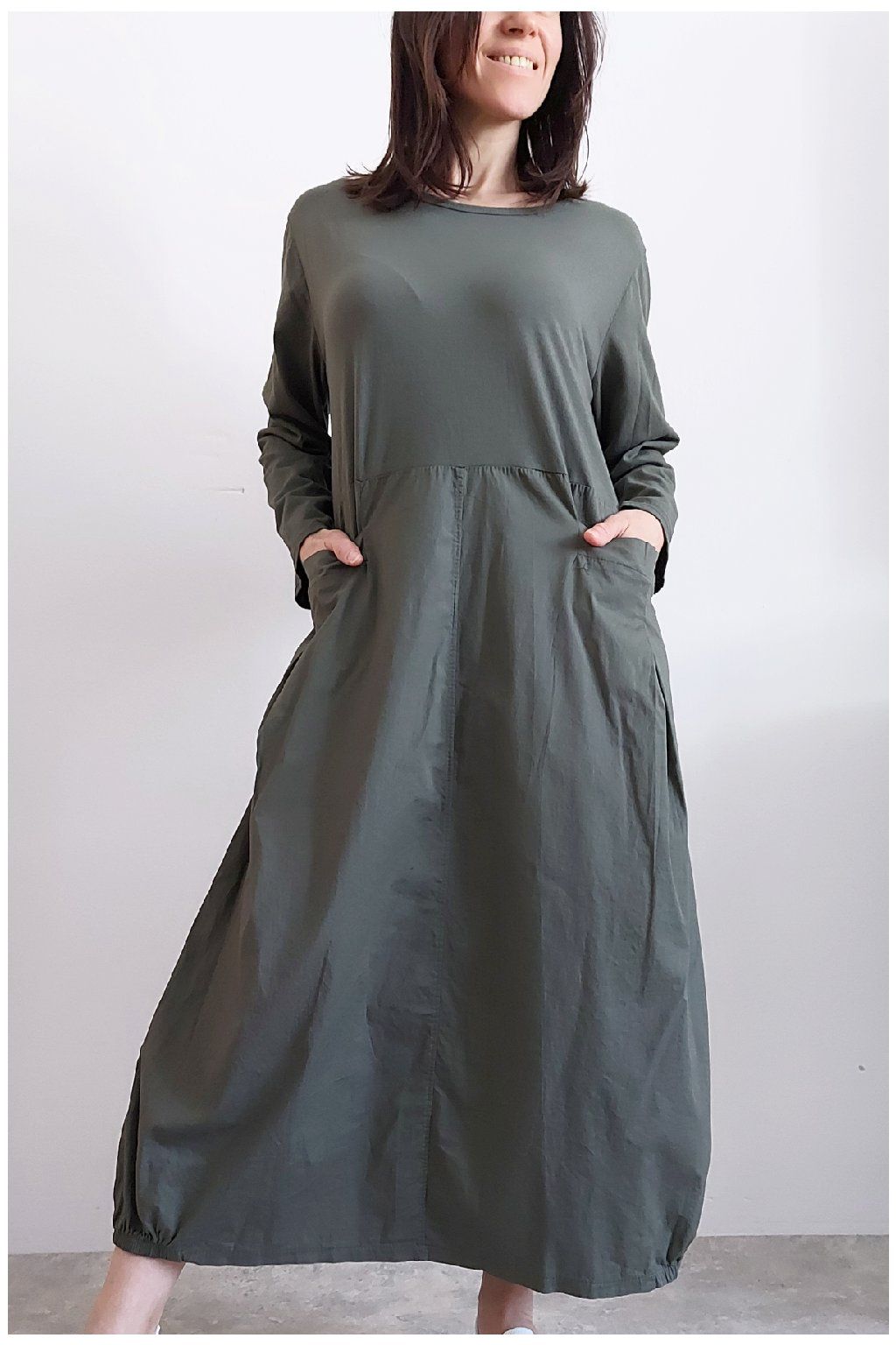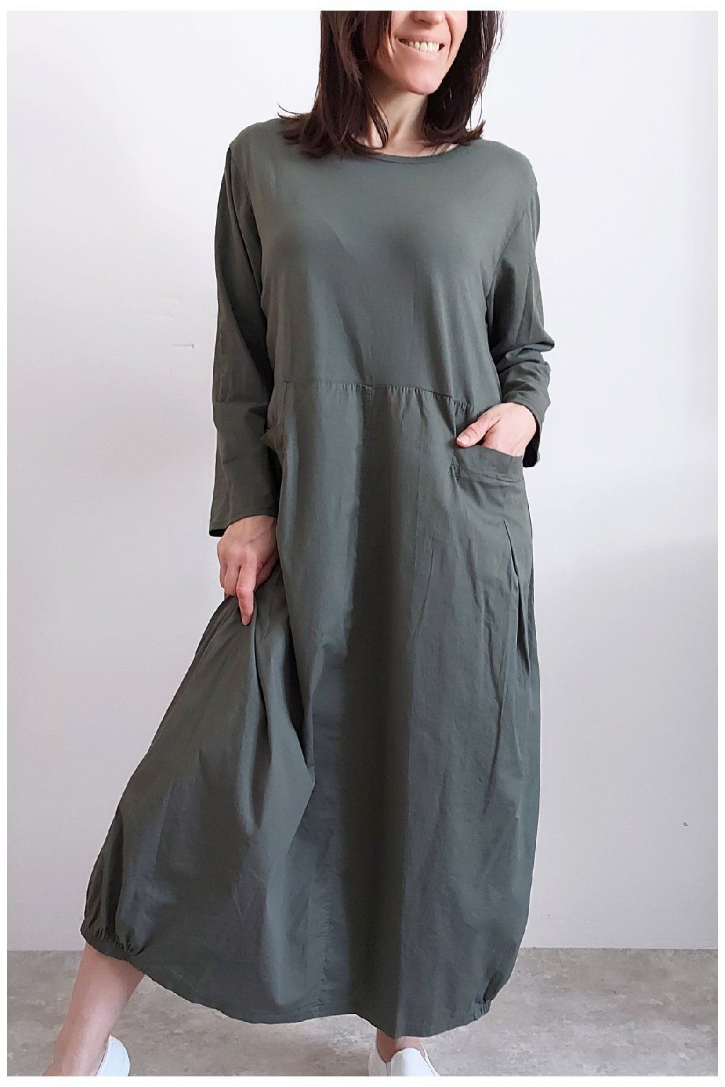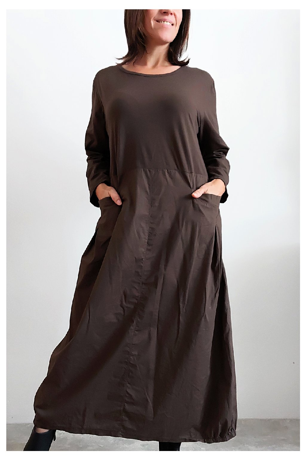 Dlouhé šaty s 3/4 rukávem. Vrchní díl z hodně pružného materiálu. Spodní díl (sukně) jakoby z lehčího plátěného materiálu. Přední hlubší kapsy, pod nimi sešité sámky. Spodní lem je po stranách řešený gumkou a tak drží tvar. Materiál kvalitní, pružný. Super kousek i pro větší velikost. Foceno na vel. XS, výška 156cm i na vel. 2XL (prsa 116cm, pas 110cm, boky 120cm), výška 165cm.