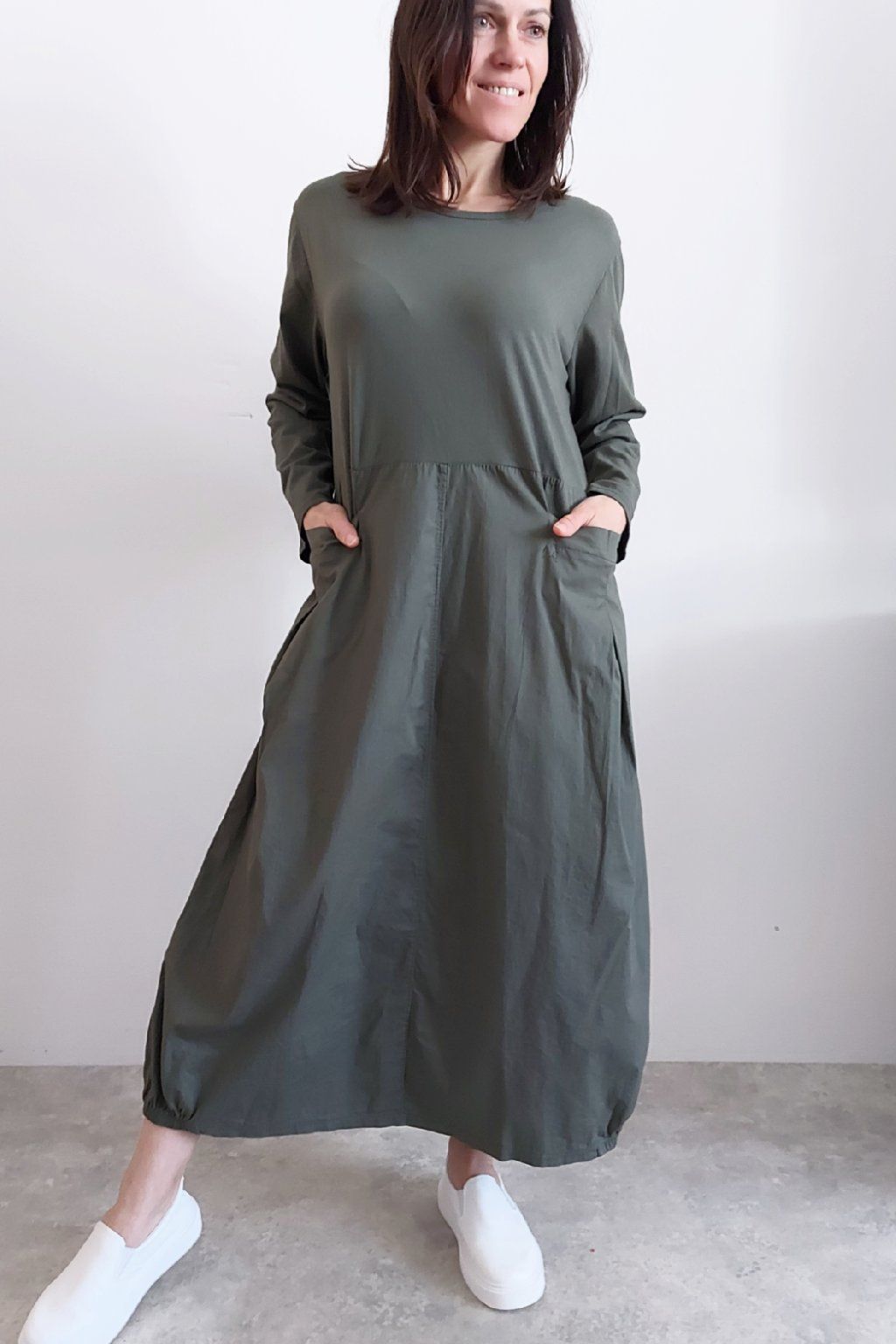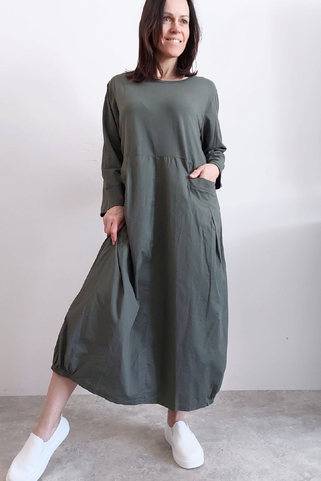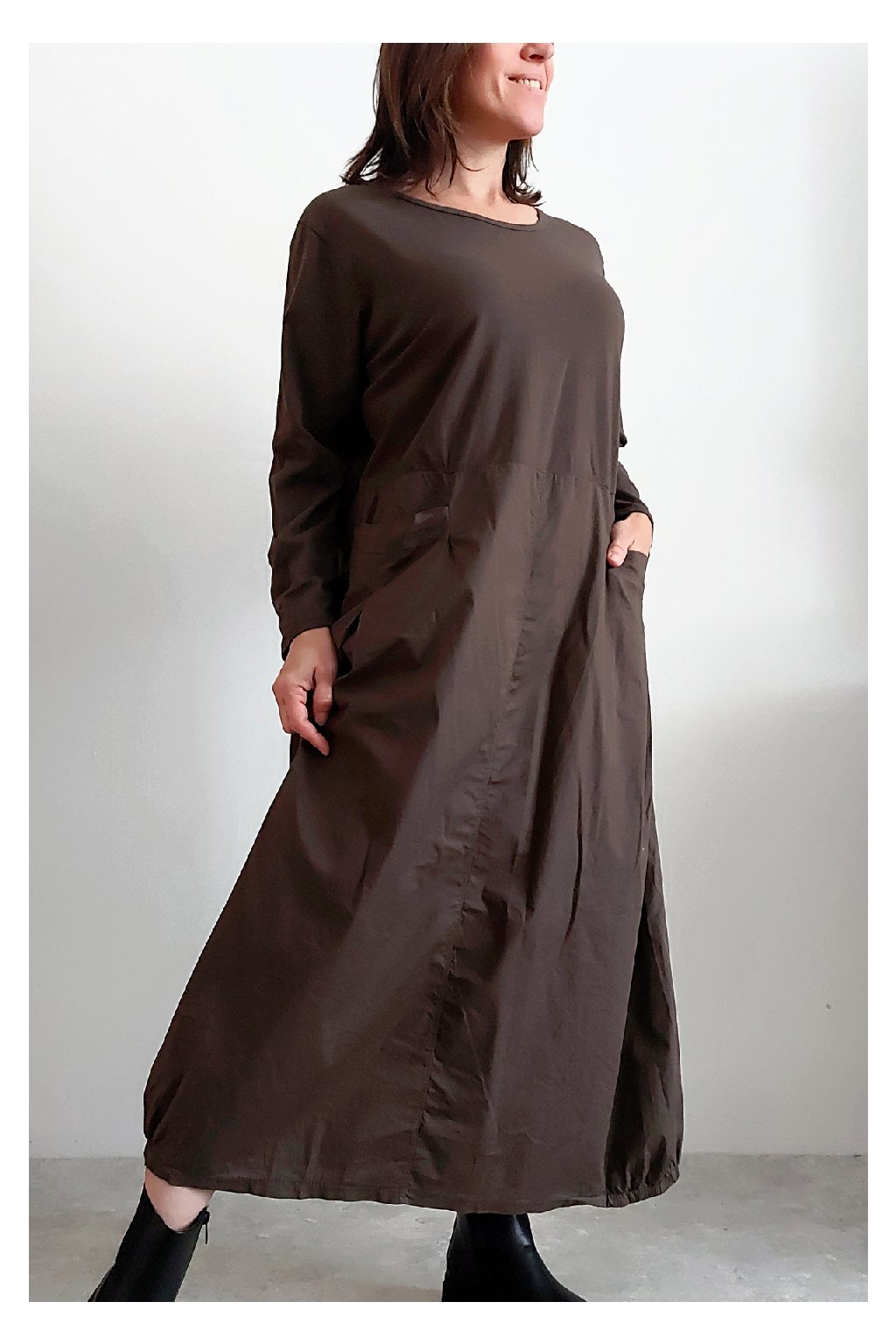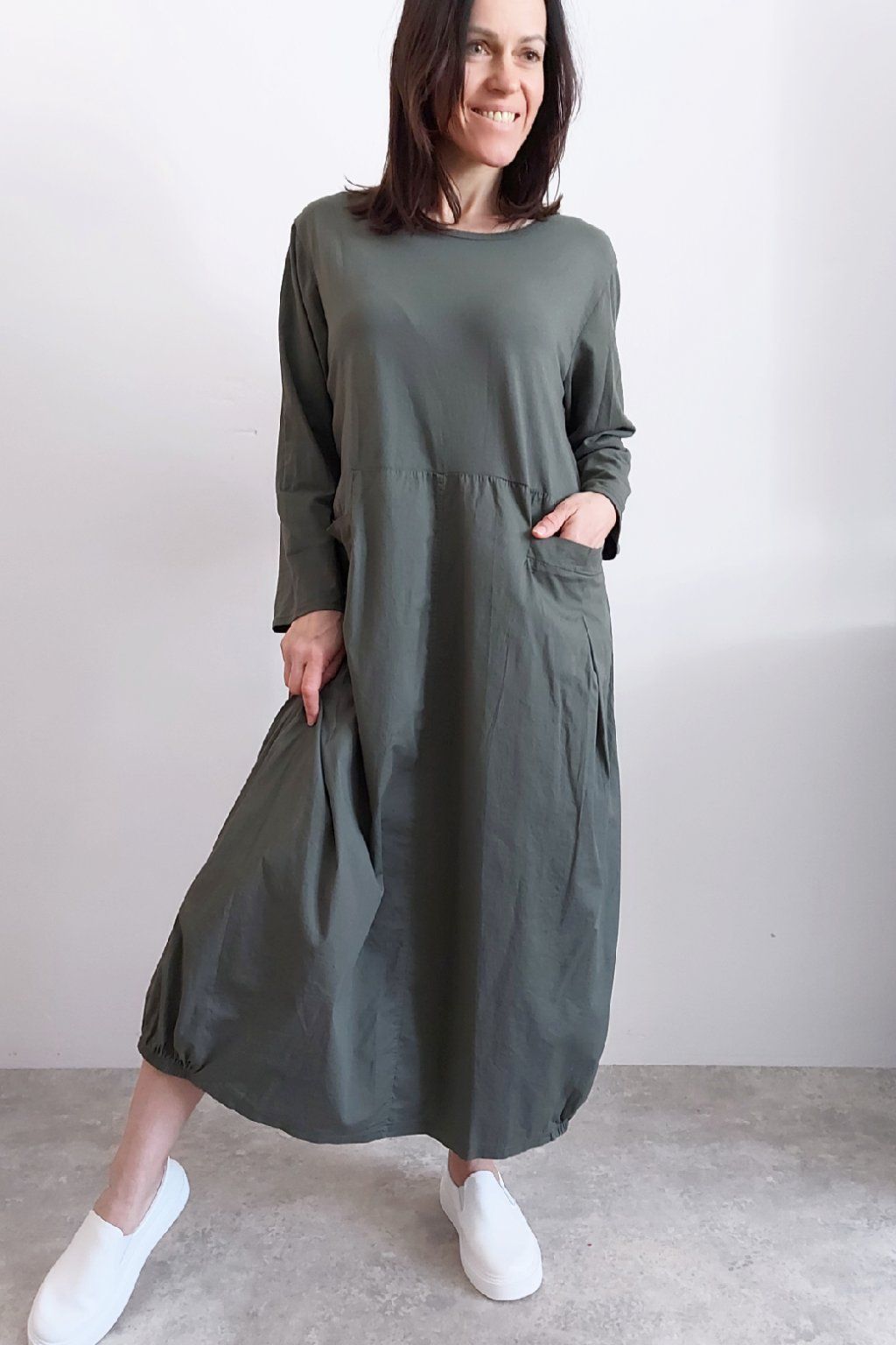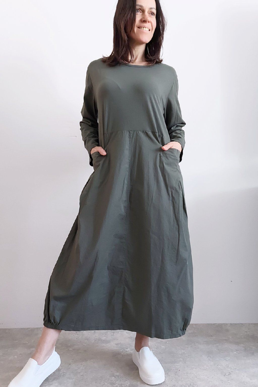 Dlouhé šaty s 3/4 rukávem. Vrchní díl z hodně pružného materiálu. Spodní díl (sukně) jakoby z lehčího plátěného materiálu. Přední hlubší kapsy, pod nimi sešité sámky. Spodní lem je po stranách řešený gumkou a tak drží tvar. Materiál kvalitní, pružný. Super kousek i pro větší velikost. Foceno na vel. XS, výška 156cm i na vel. 2XL (prsa 116cm, pas 110cm, boky 120cm), výška 165cm.