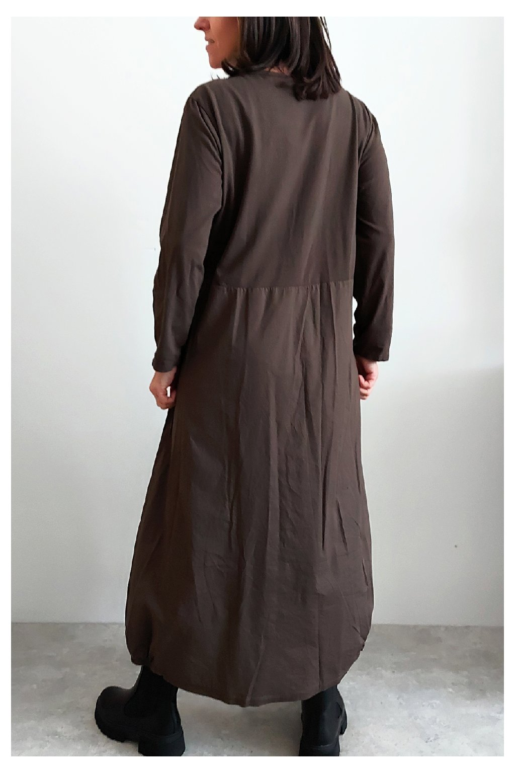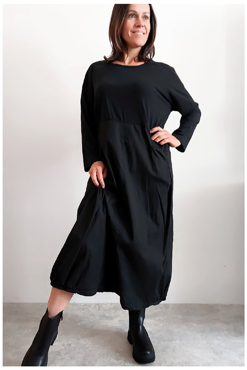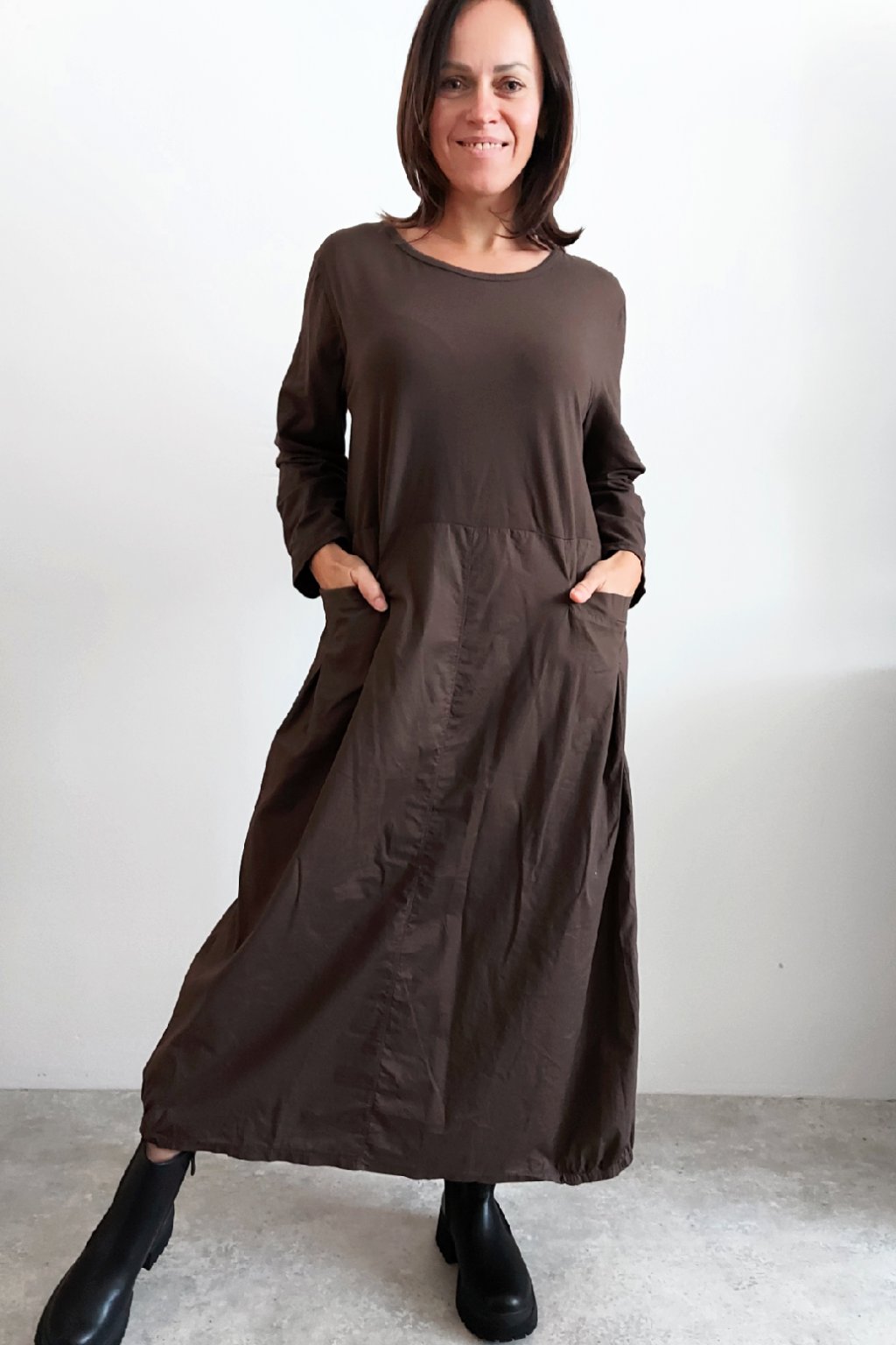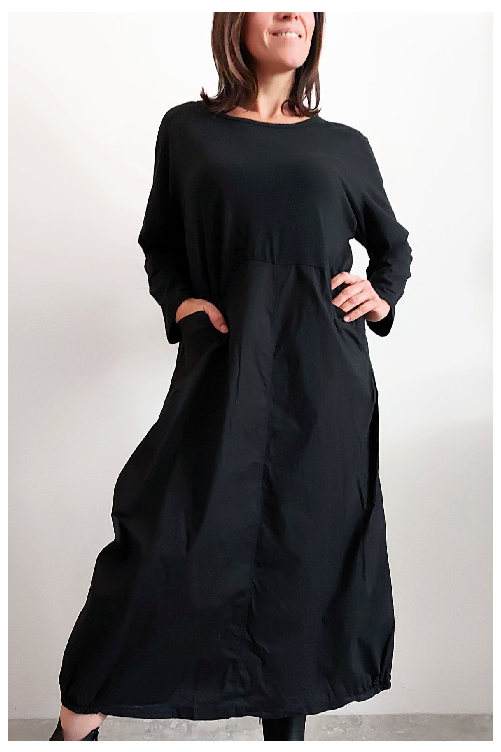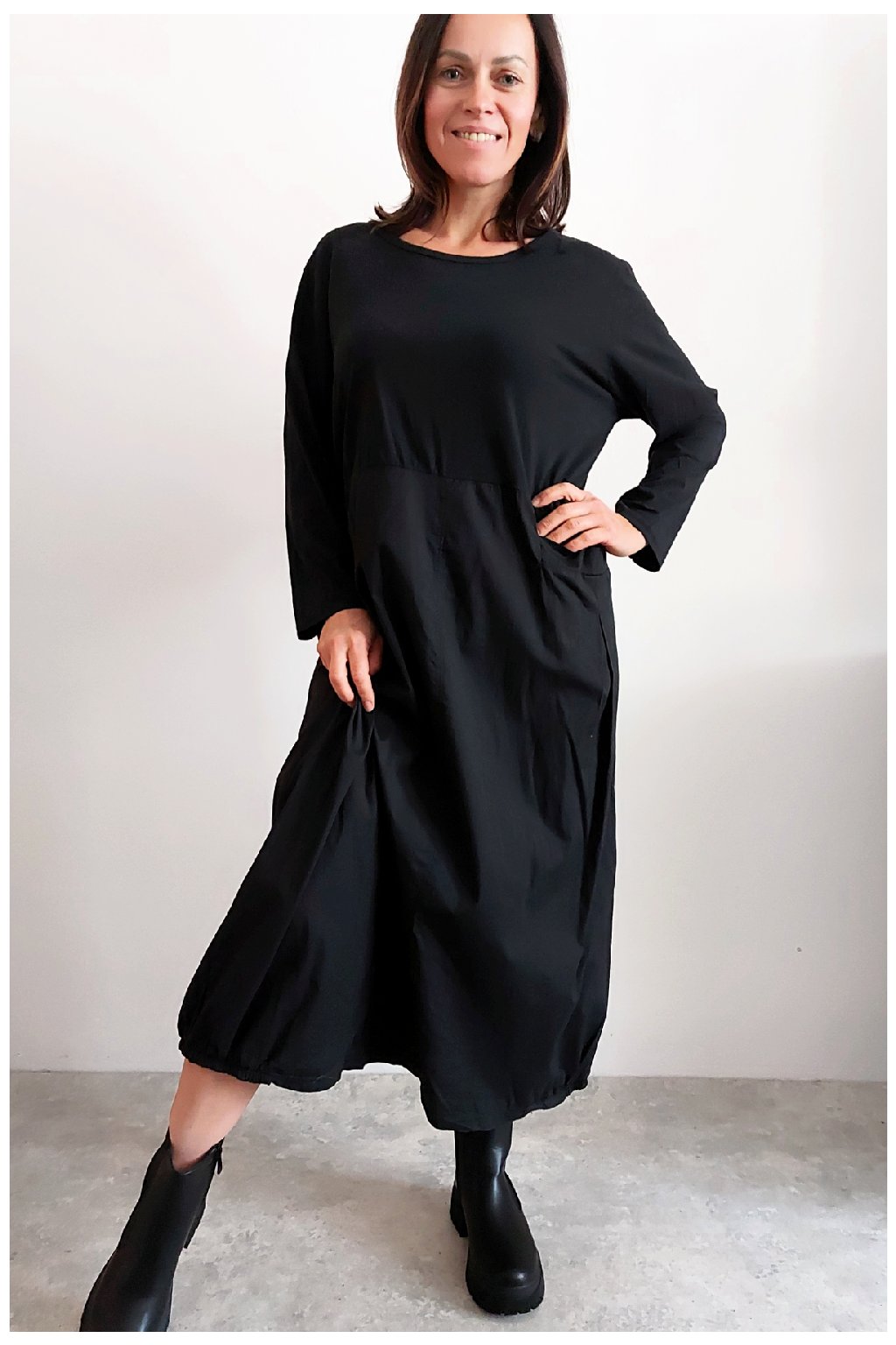 Dlouhé šaty s 3/4 rukávem. Vrchní díl z hodně pružného materiálu. Spodní díl (sukně) jakoby z lehčího plátěného materiálu. Přední hlubší kapsy, pod nimi sešité sámky. Spodní lem je po stranách řešený gumkou a tak drží tvar. Materiál kvalitní, pružný. Super kousek i pro větší velikost. Foceno na vel. XS, výška 156cm i na vel. 2XL (prsa 116cm, pas 110cm, boky 120cm), výška 165cm.