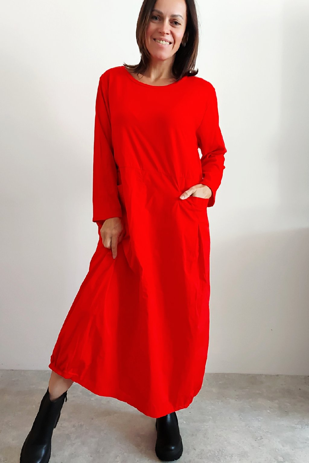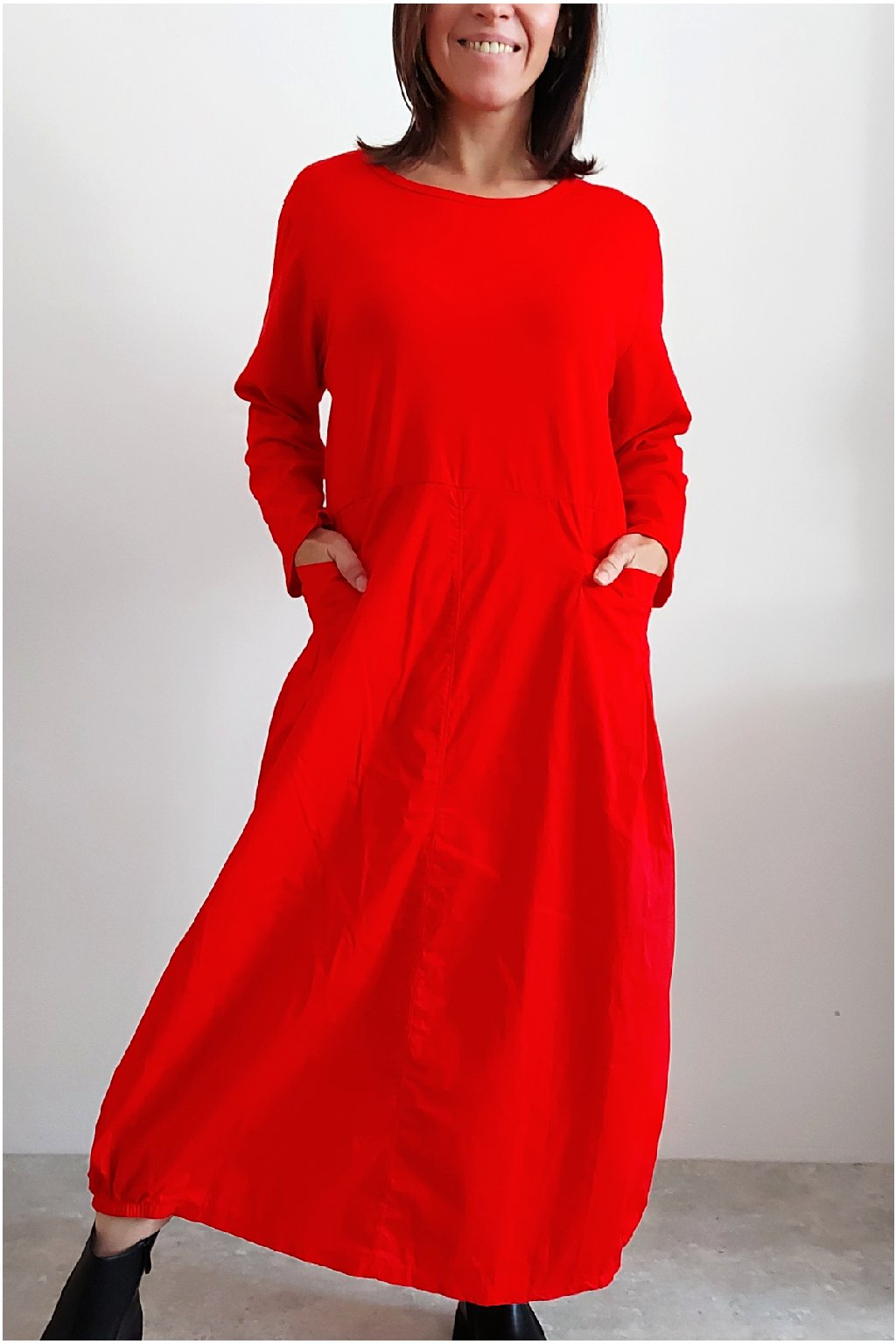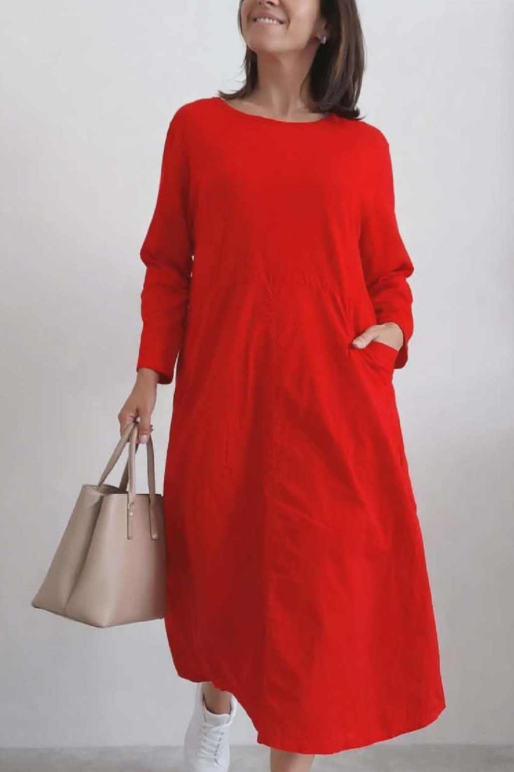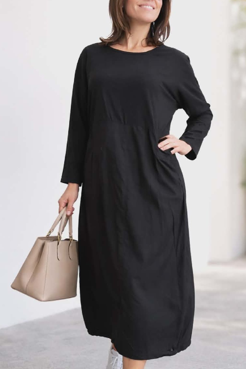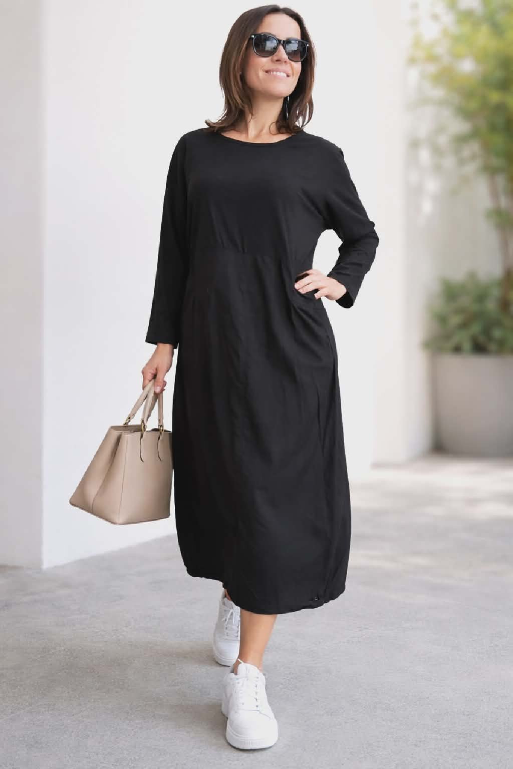 Dlouhé šaty s 3/4 rukávem. Vrchní díl z hodně pružného materiálu. Spodní díl (sukně) jakoby z lehčího plátěného materiálu. Přední hlubší kapsy, pod nimi sešité sámky. Spodní lem je po stranách řešený gumkou a tak drží tvar. Materiál kvalitní, pružný. Super kousek i pro větší velikost. Foceno na vel. XS, výška 156cm i na vel. 2XL (prsa 116cm, pas 110cm, boky 120cm), výška 165cm.