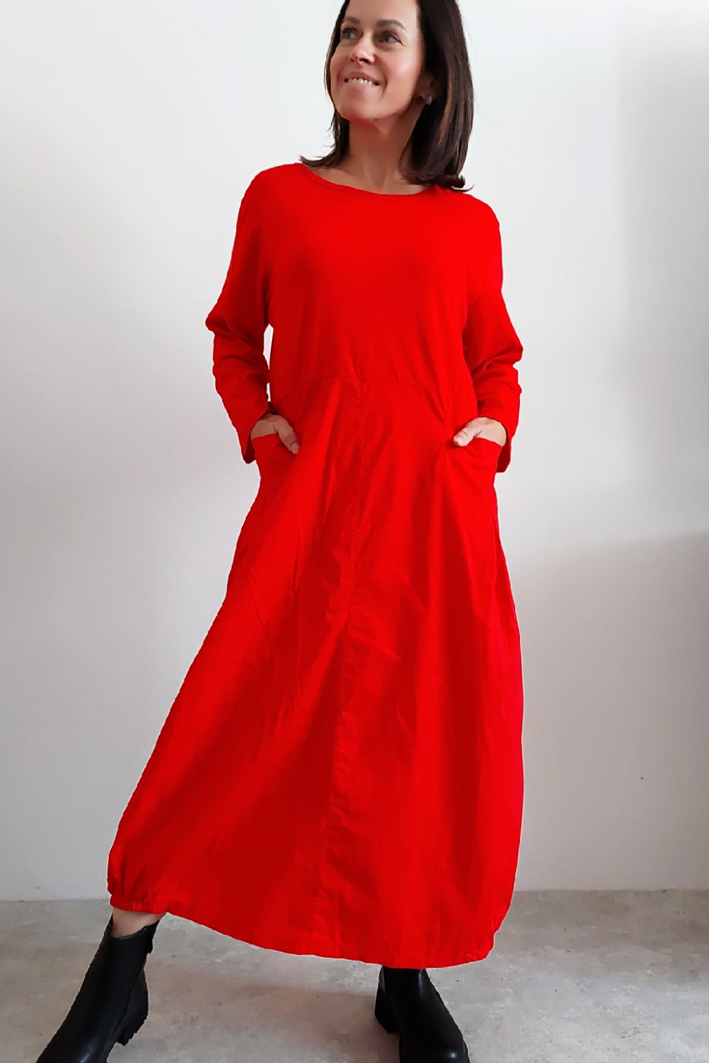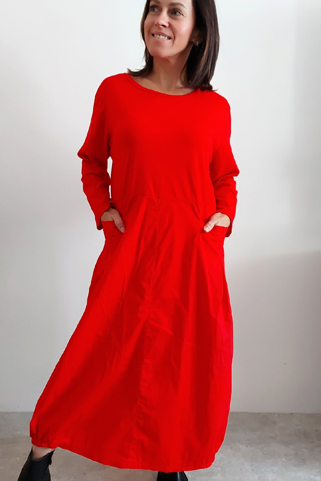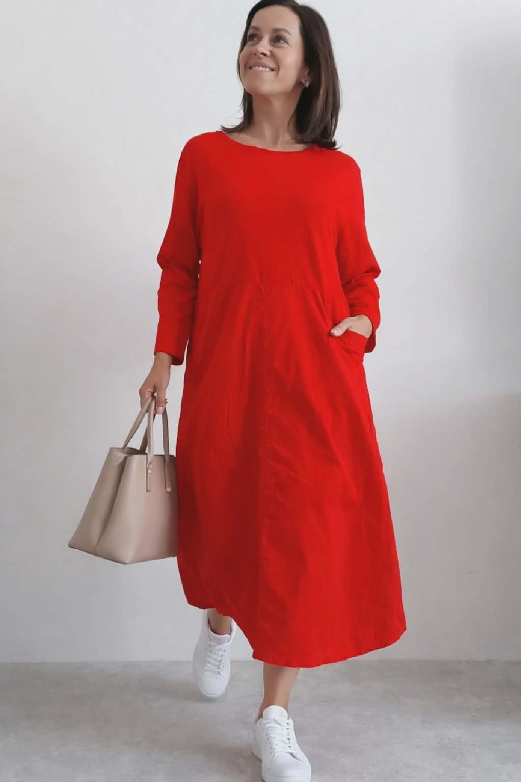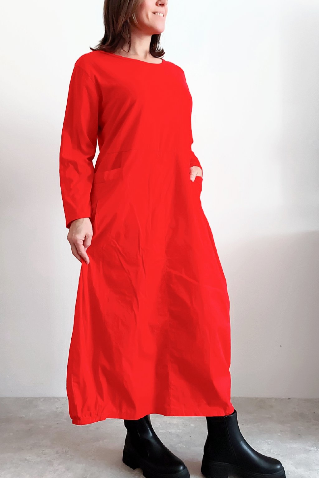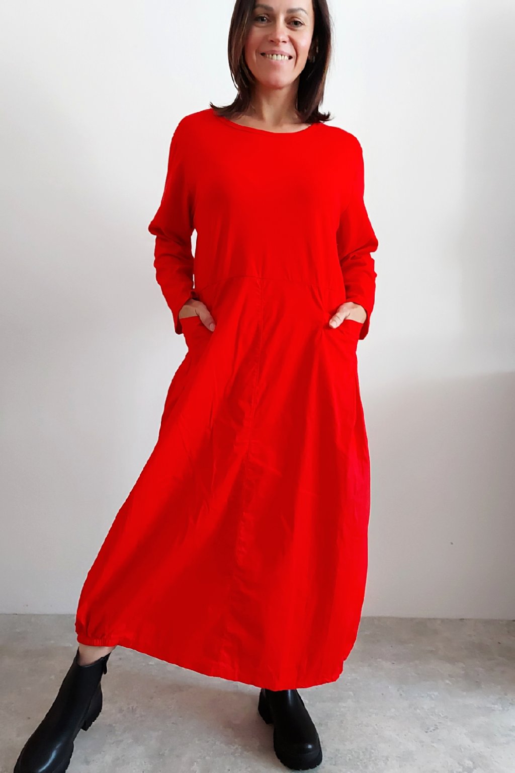 Dlouhé šaty s 3/4 rukávem. Vrchní díl z hodně pružného materiálu. Spodní díl (sukně) jakoby z lehčího plátěného materiálu. Přední hlubší kapsy, pod nimi sešité sámky. Spodní lem je po stranách řešený gumkou a tak drží tvar. Materiál kvalitní, pružný. Super kousek i pro větší velikost. Foceno na vel. XS, výška 156cm i na vel. 2XL (prsa 116cm, pas 110cm, boky 120cm), výška 165cm.