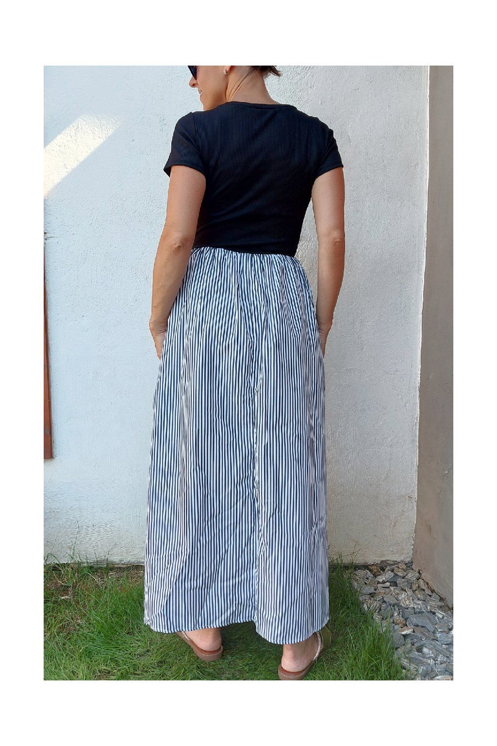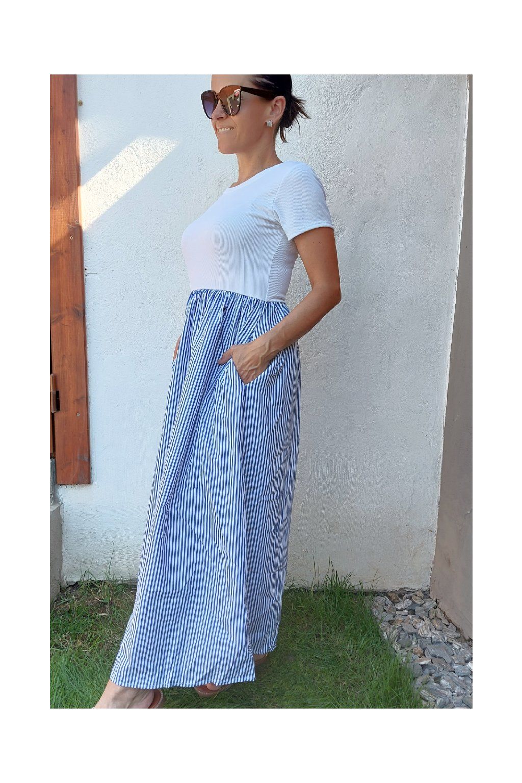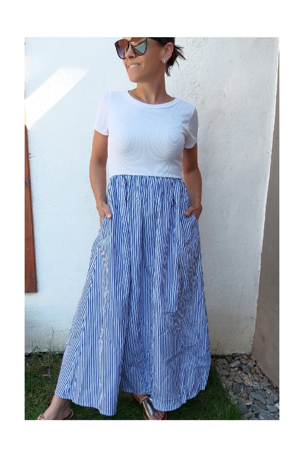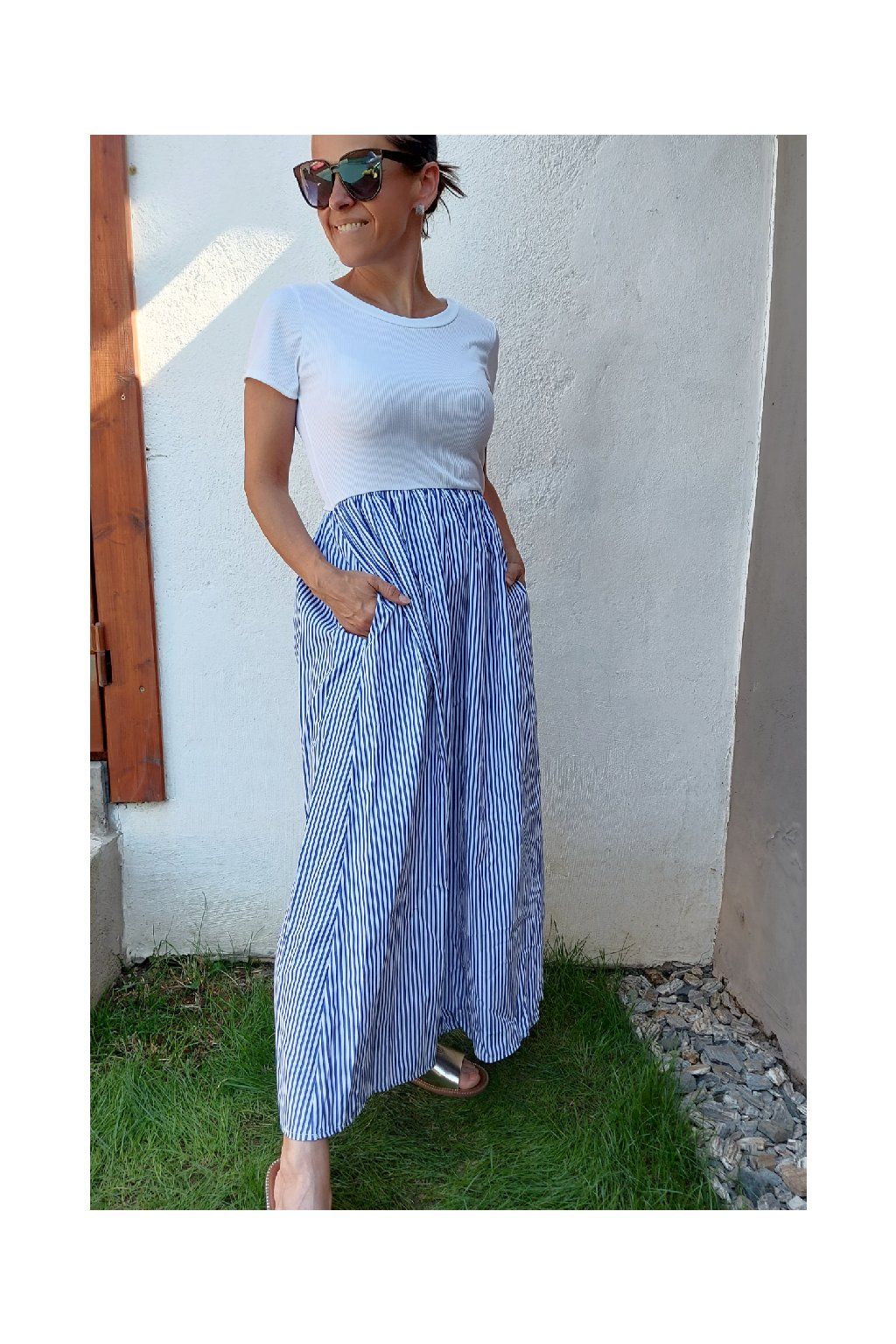 Dlouhé šaty s gumkou v pase a krátkým rukávem. Vrchní díl je z žebrovaného - pružného materiálu. Spodní sukně je s motivem proužků v modrém provedeí a je z plátěného materiálu. Oblékání přes hlavu, boční kapsy. Dokonalý letní model. Foceno na vel. XS, výška 156cm i na vel. XL/2XL, výška 165cm (prsa 116cm, pas 110cm, boky 119cm) - na této velikosti již obeplejší.