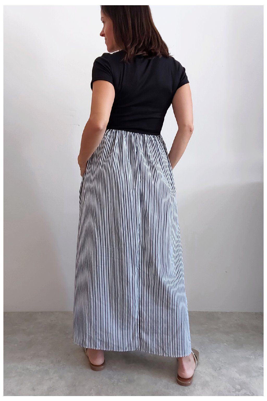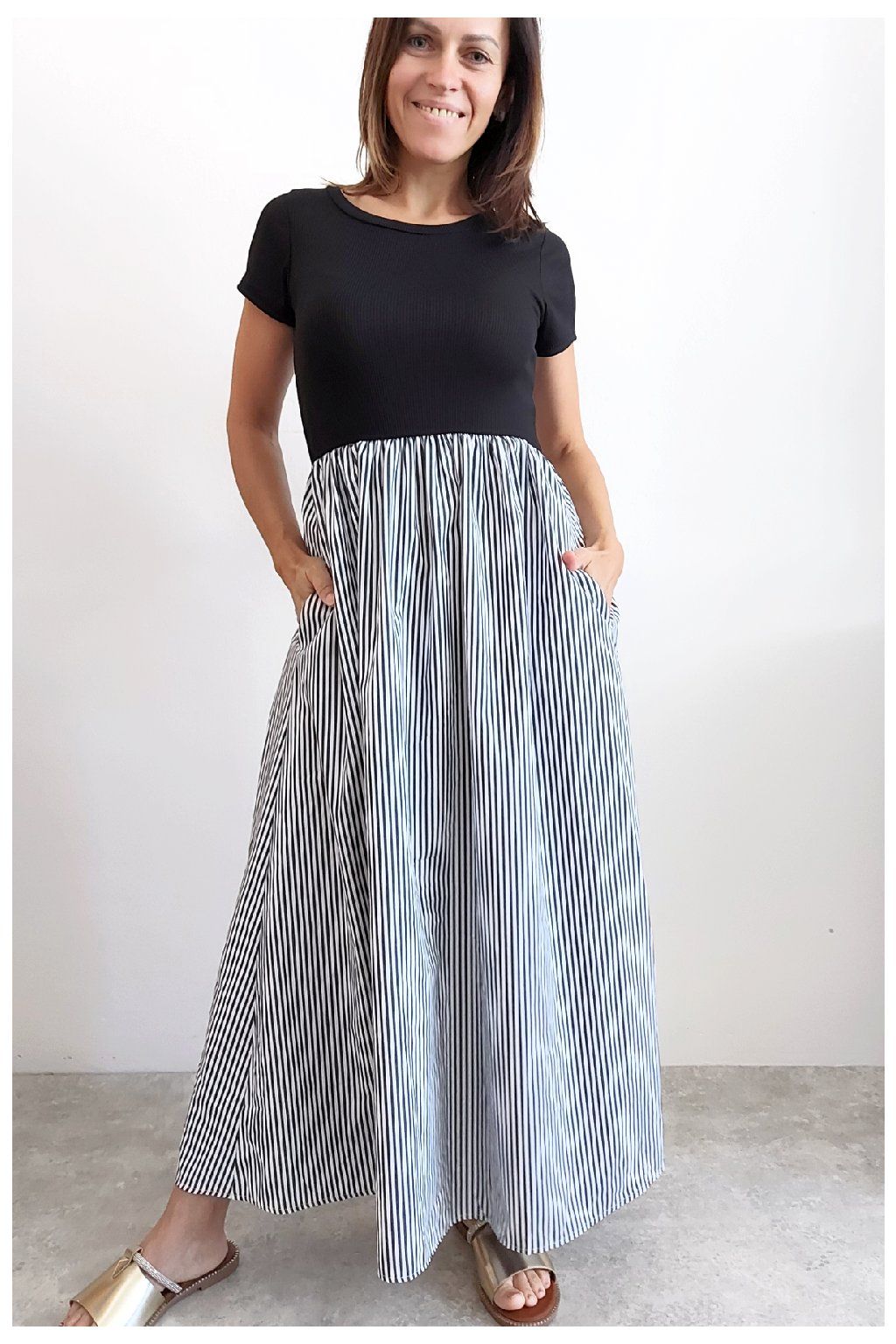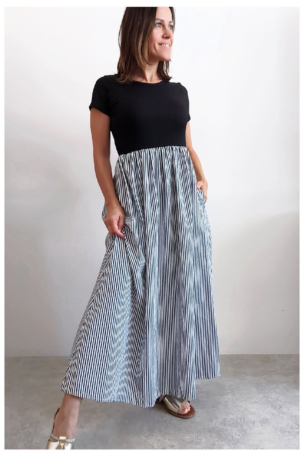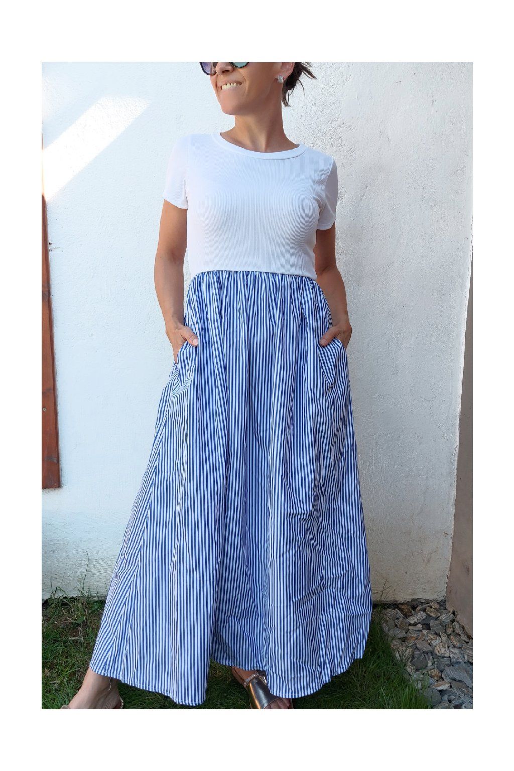 Dlouhé šaty s gumkou v pase a krátkým rukávem. Vrchní díl je z žebrovaného - pružného materiálu. Spodní sukně je s motivem proužků v modrém provedeí a je z plátěného materiálu. Oblékání přes hlavu, boční kapsy. Dokonalý letní model. Foceno na vel. XS, výška 156cm i na vel. XL/2XL, výška 165cm (prsa 116cm, pas 110cm, boky 119cm) - na této velikosti již obeplejší.