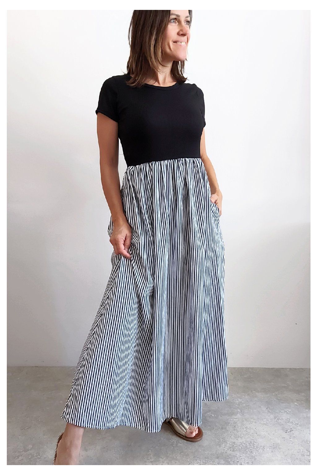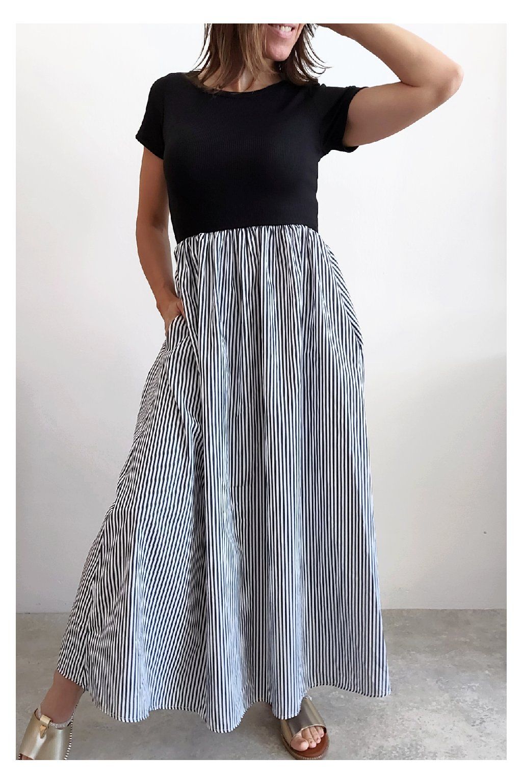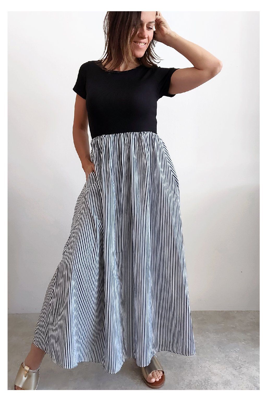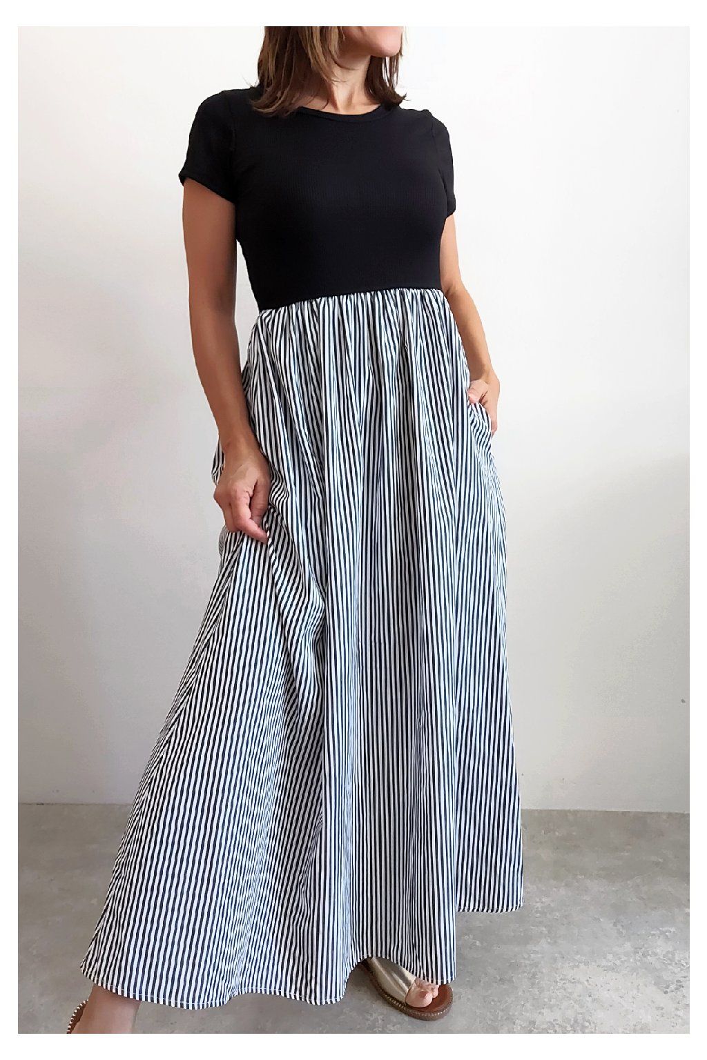 Dlouhé šaty s gumkou v pase a krátkým rukávem. Vrchní díl je z žebrovaného - pružného materiálu. Spodní sukně je s motivem proužků v modrém provedeí a je z plátěného materiálu. Oblékání přes hlavu, boční kapsy. Dokonalý letní model. Foceno na vel. XS, výška 156cm i na vel. XL/2XL, výška 165cm (prsa 116cm, pas 110cm, boky 119cm) - na této velikosti již obeplejší.