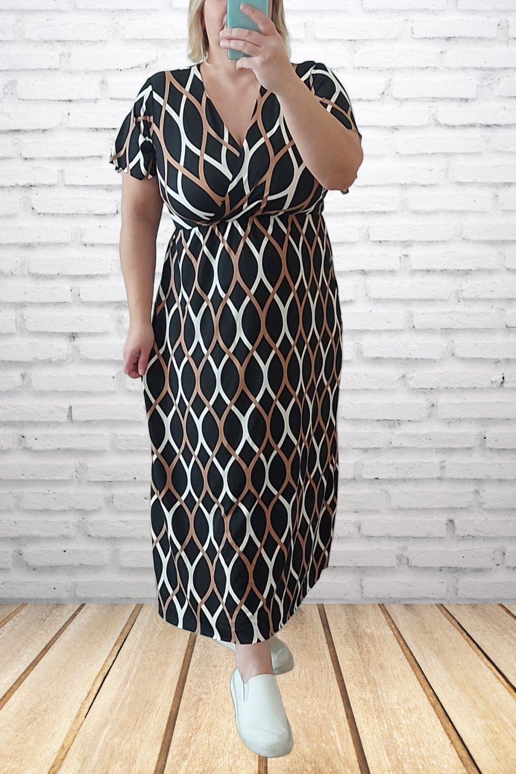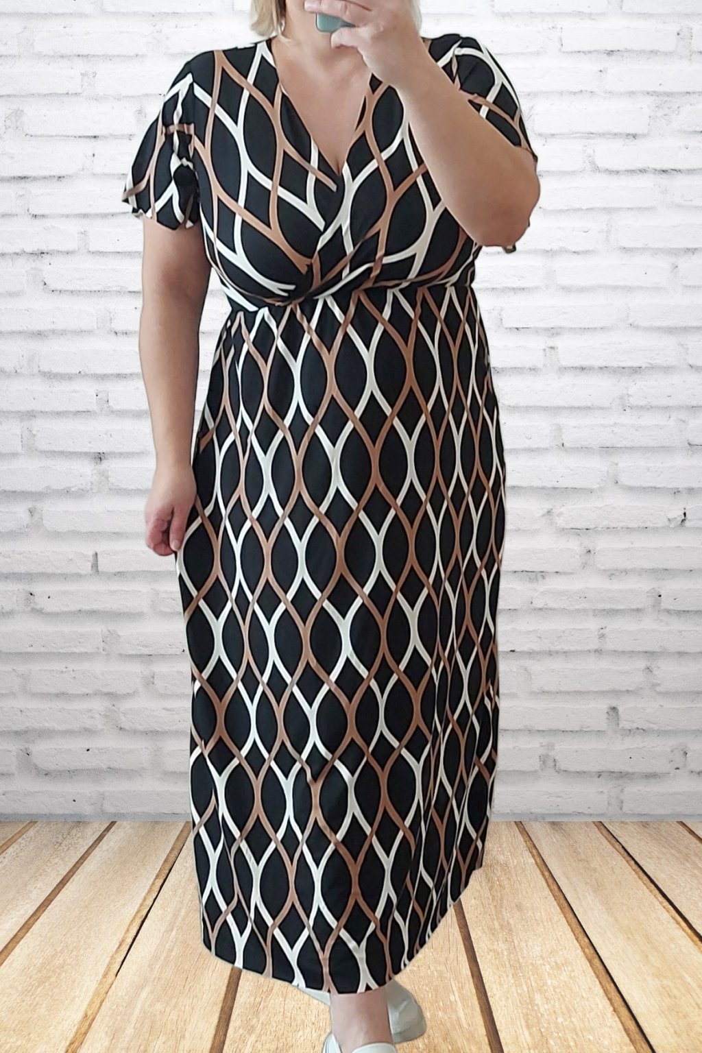 Dlouhé šaty s krátkým rukávem. Véčkový, hlubší výstřih, který si můžete upravovat dle potřeby a to překrytím látky přes sebe. Pod prsy guma, krásně se přizpůsobí. U ní je také pásek ze stejného materiálu jako šaty, který lze uvázat vpředu či vzadu nebo jej můžete dát pryč. Materiál je chladivý a hodně pružný. Vel. L sedne i na vel. S a M. Vel. 2XL focena na vel. 2XL (prsa 116cm, boky 120cm), výška 165cm.