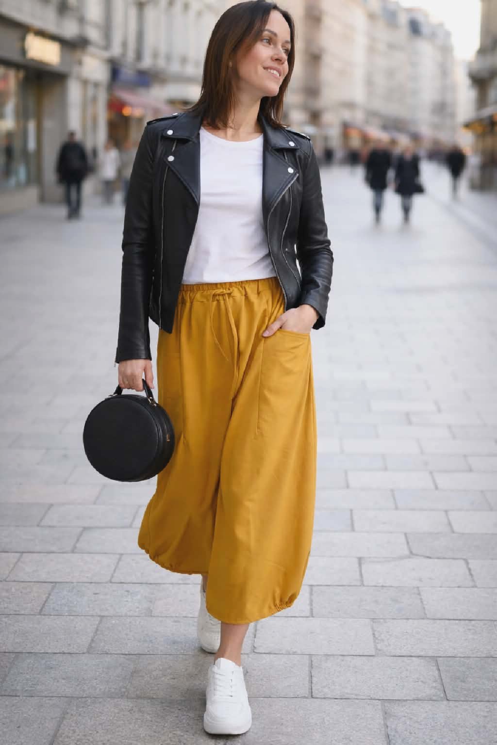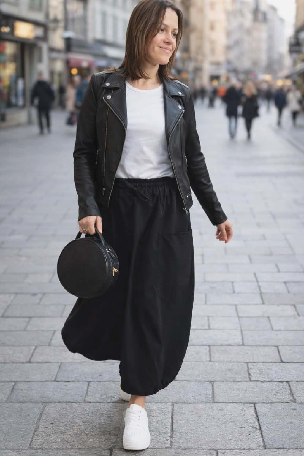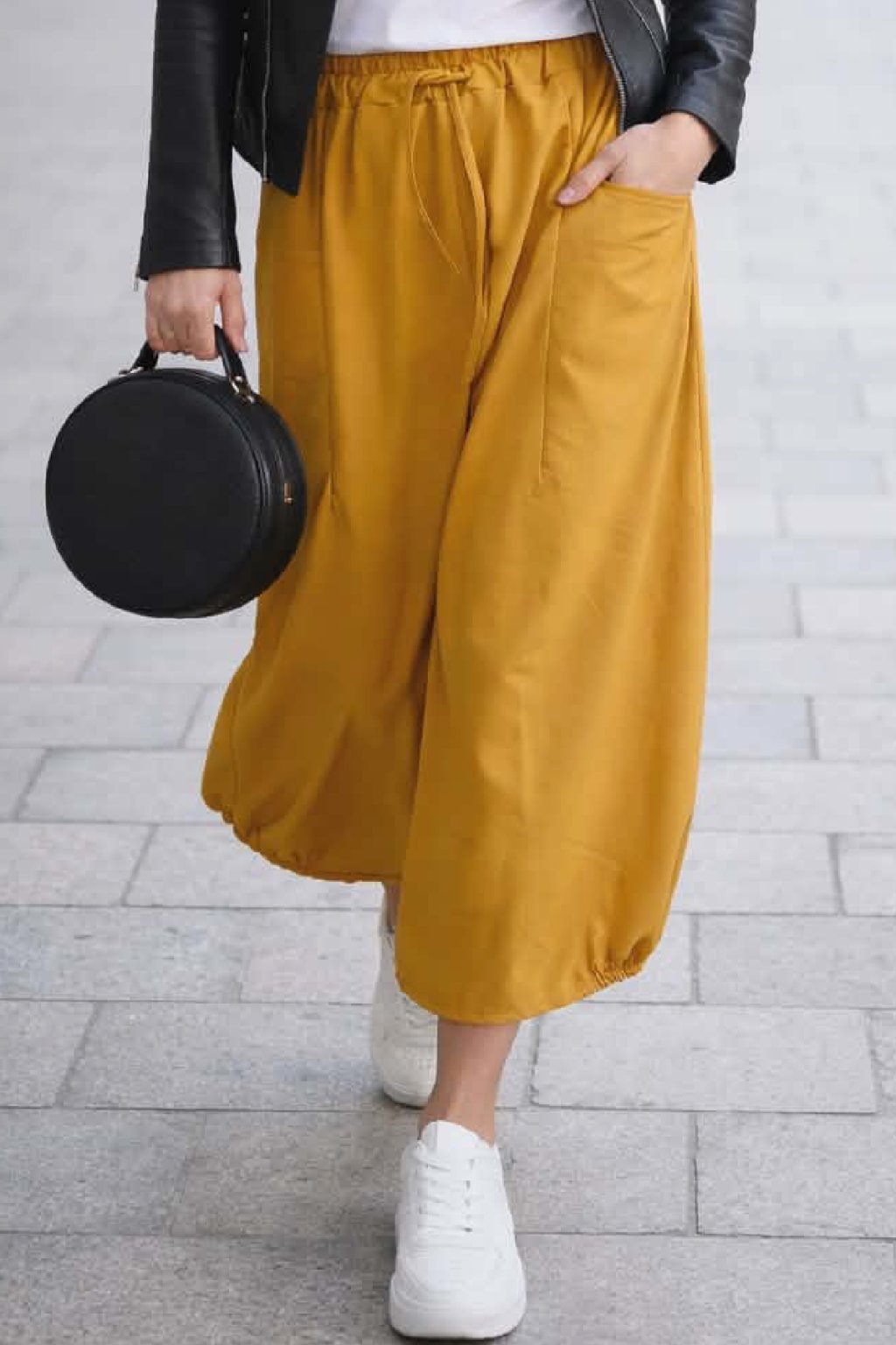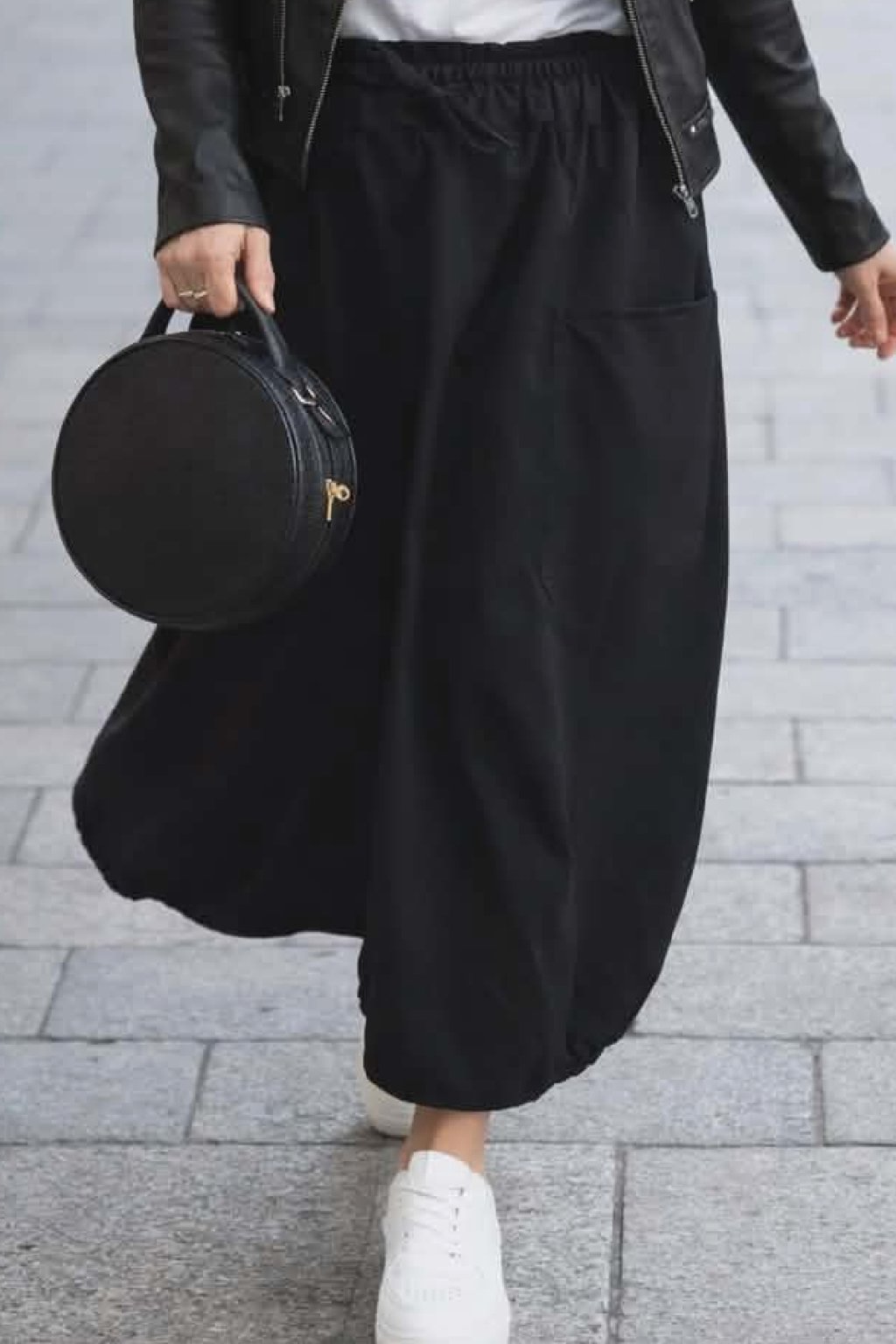Bavlněná delší sukně balónovitého tvaru. V pase guma a šňůrka pro stažení obvodu. Vpředu hluboké kapsy, vzadu bez kapes. Ve spodní části po stranách gumky, díky nimž drží sukně ten správný tvar. Materiál bavlněný, pružný. Foceno na vel. XS, výška 156cm.