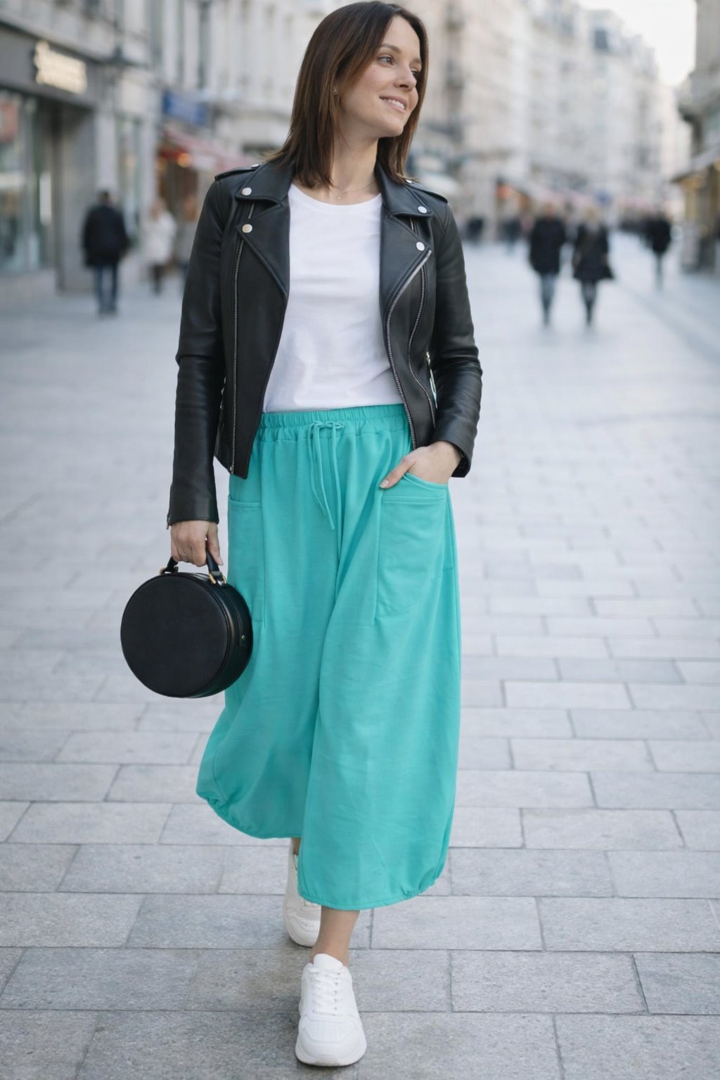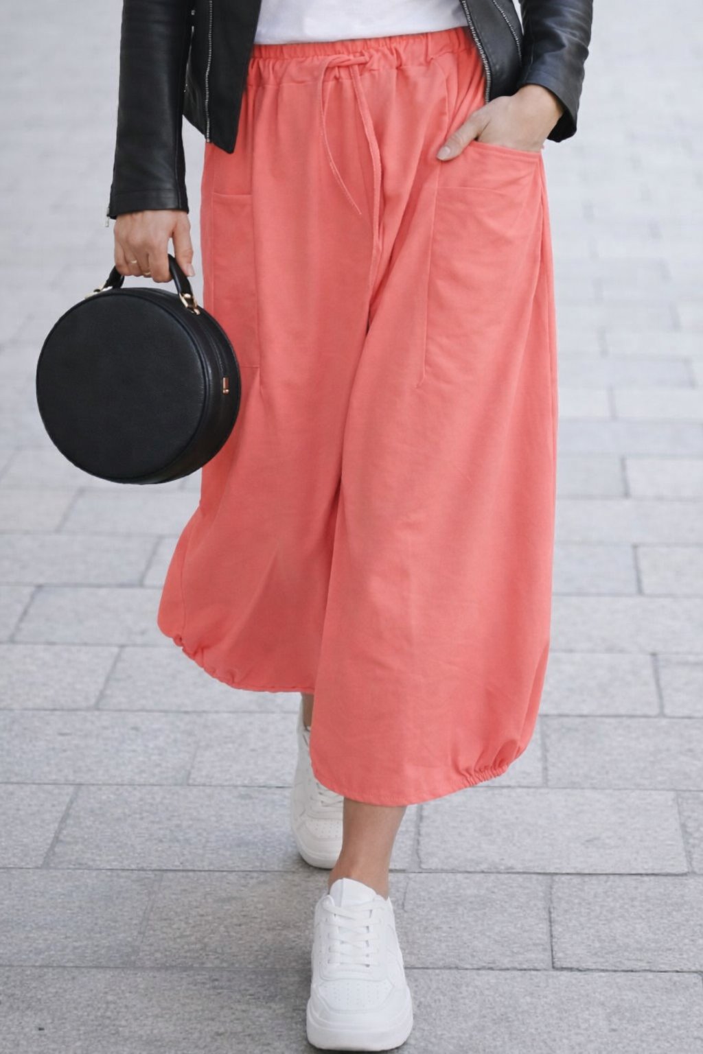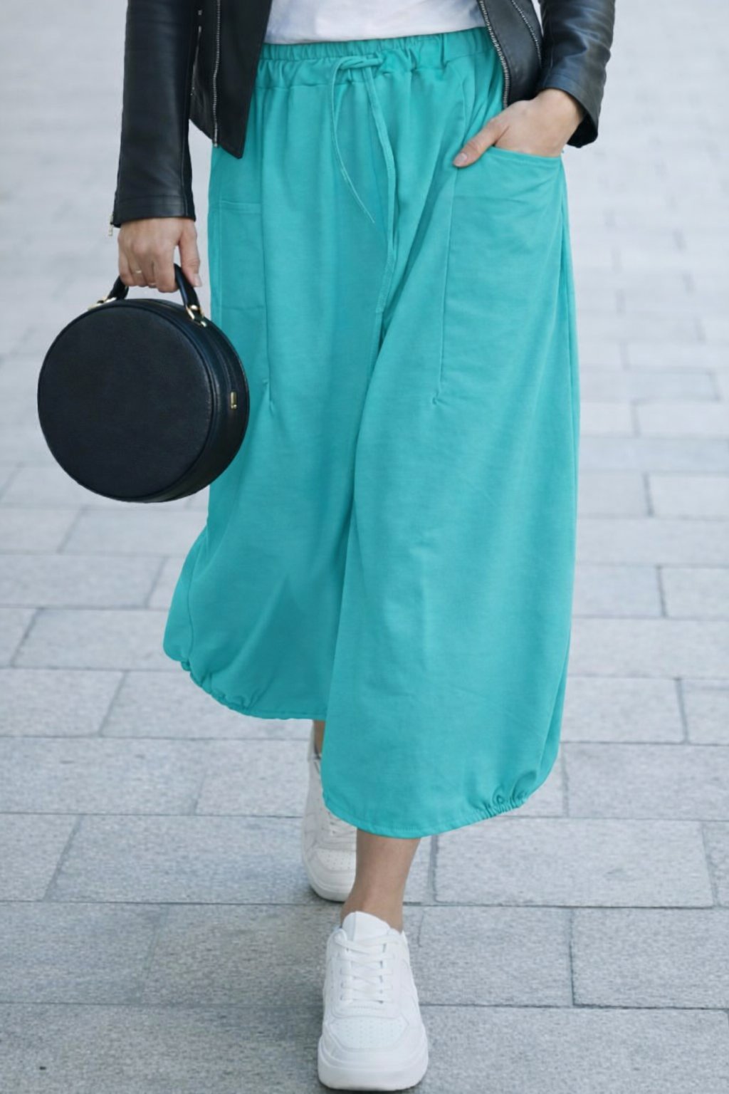 Bavlněná delší sukně balónovitého tvaru. V pase guma a šňůrka pro stažení obvodu. Vpředu hluboké kapsy, vzadu bez kapes. Ve spodní části po stranách gumky, díky nimž drží sukně ten správný tvar. Materiál bavlněný, pružný. Foceno na vel. XS, výška 156cm.