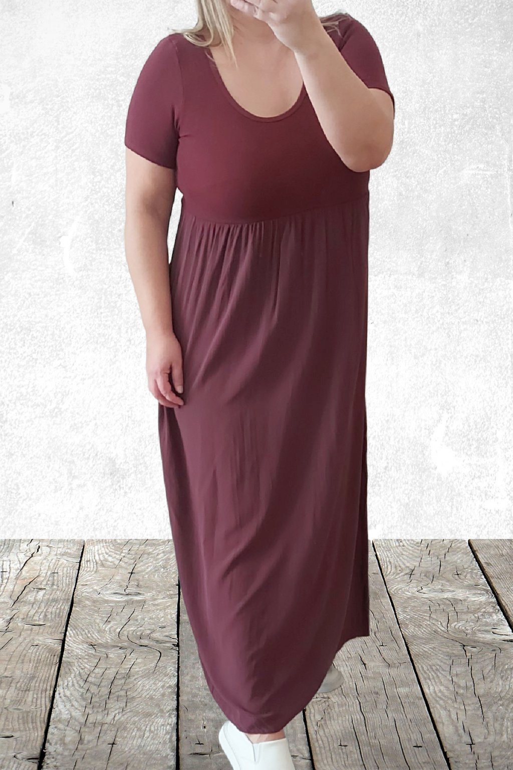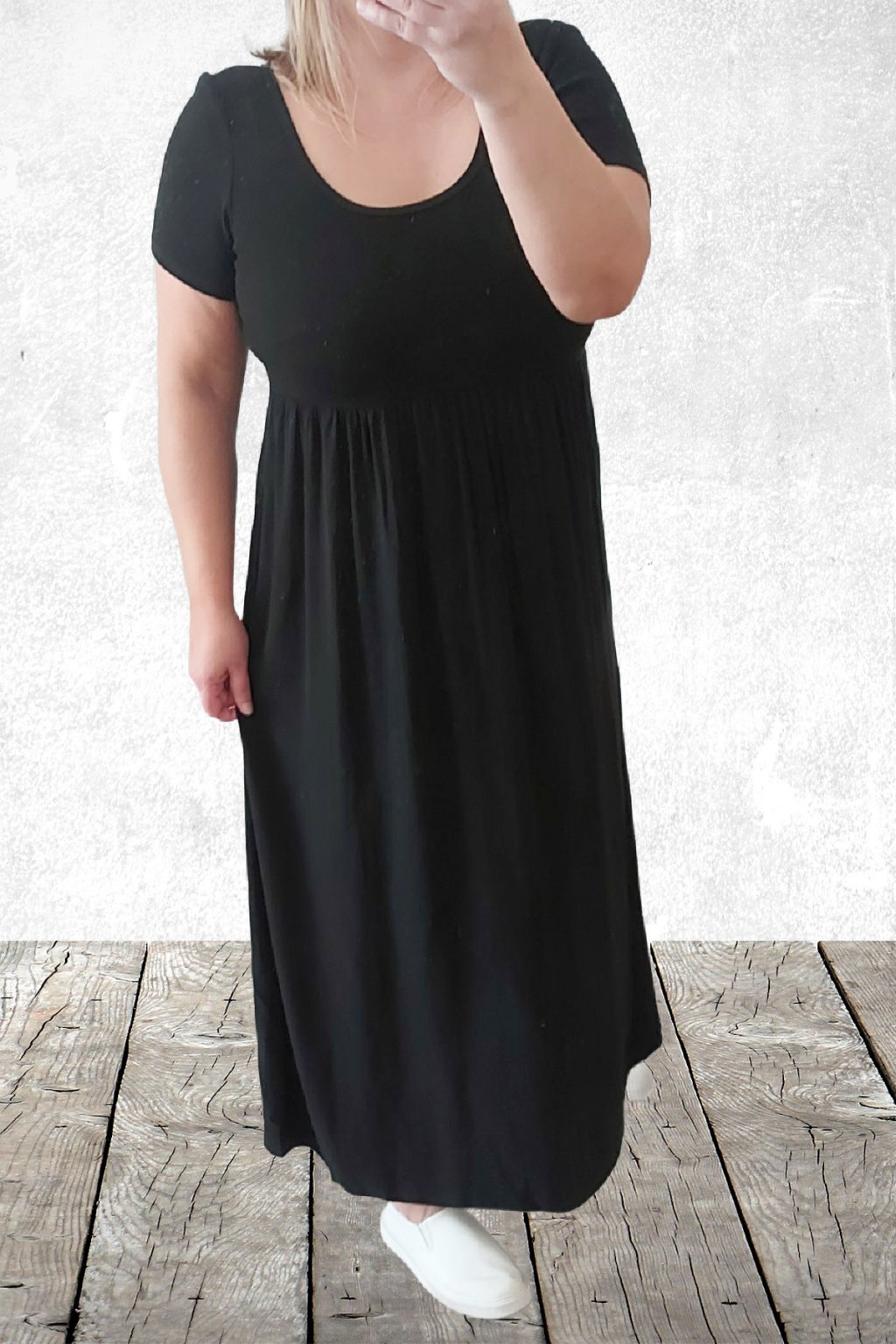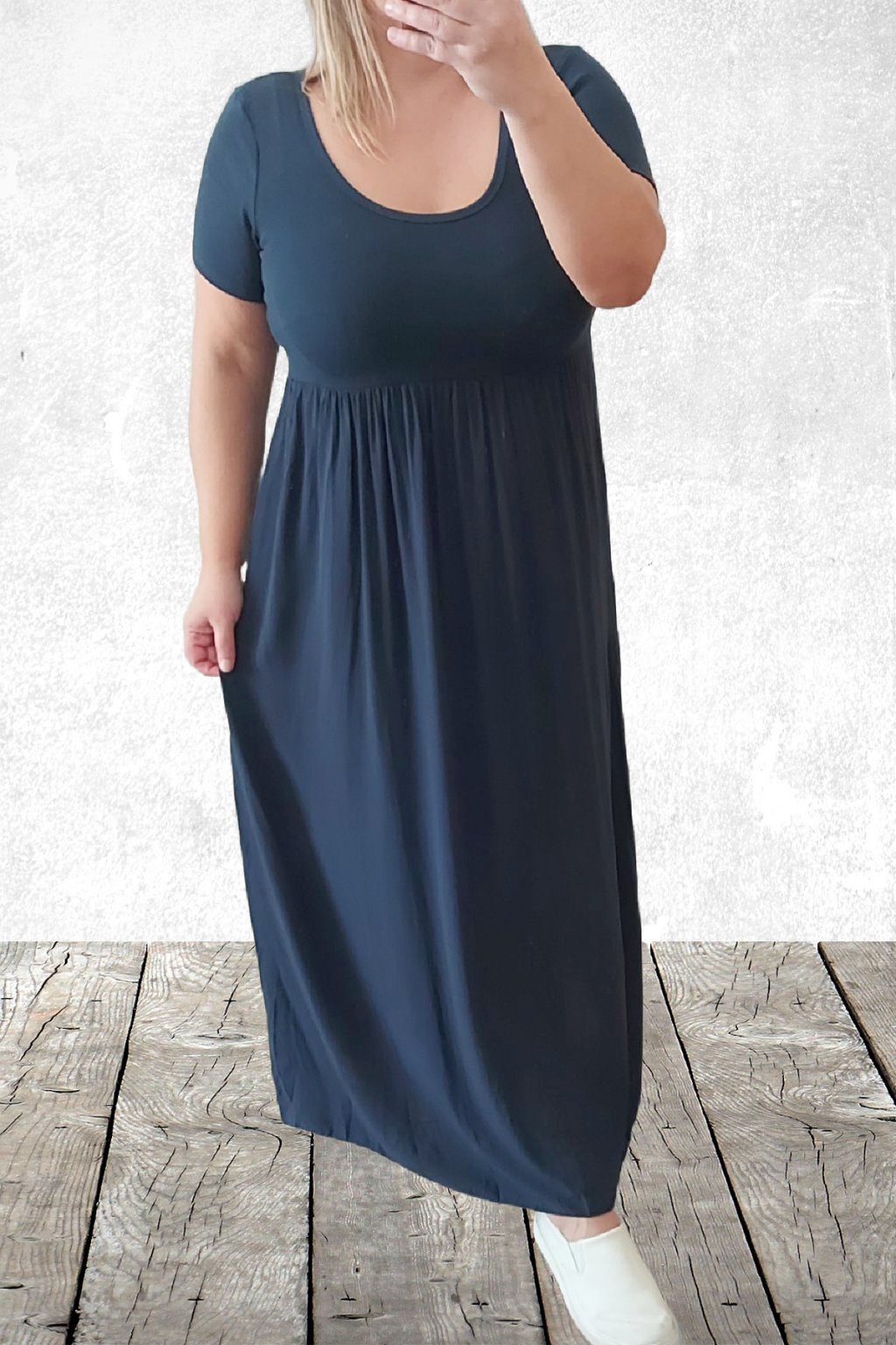 Dlouhé šaty s krátkým rukávem. Vrchní díl je z žebrovaného materiálu, spodní díl je z lehoučkého-vzdušného materiálu. Oblékání přes hlavu, bez kapes. Dokonalý letní model. Foceno na vel. XS, výška 156cm i na vel. 2X, výška 165cm (prsa 116cm, pas 110cm, boky 119cm).