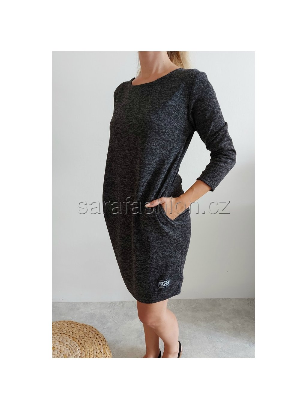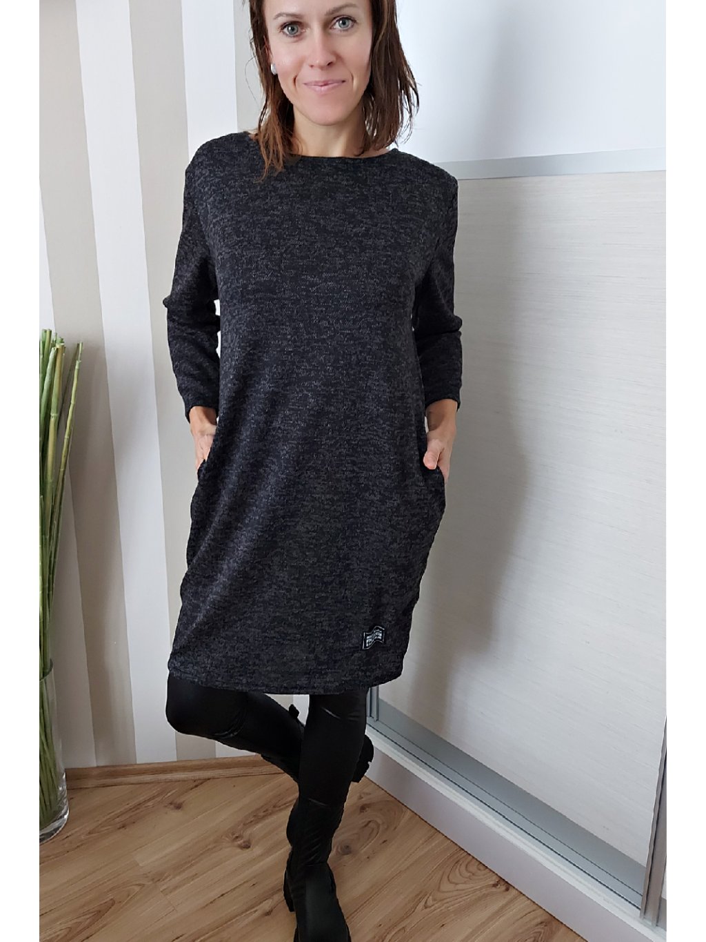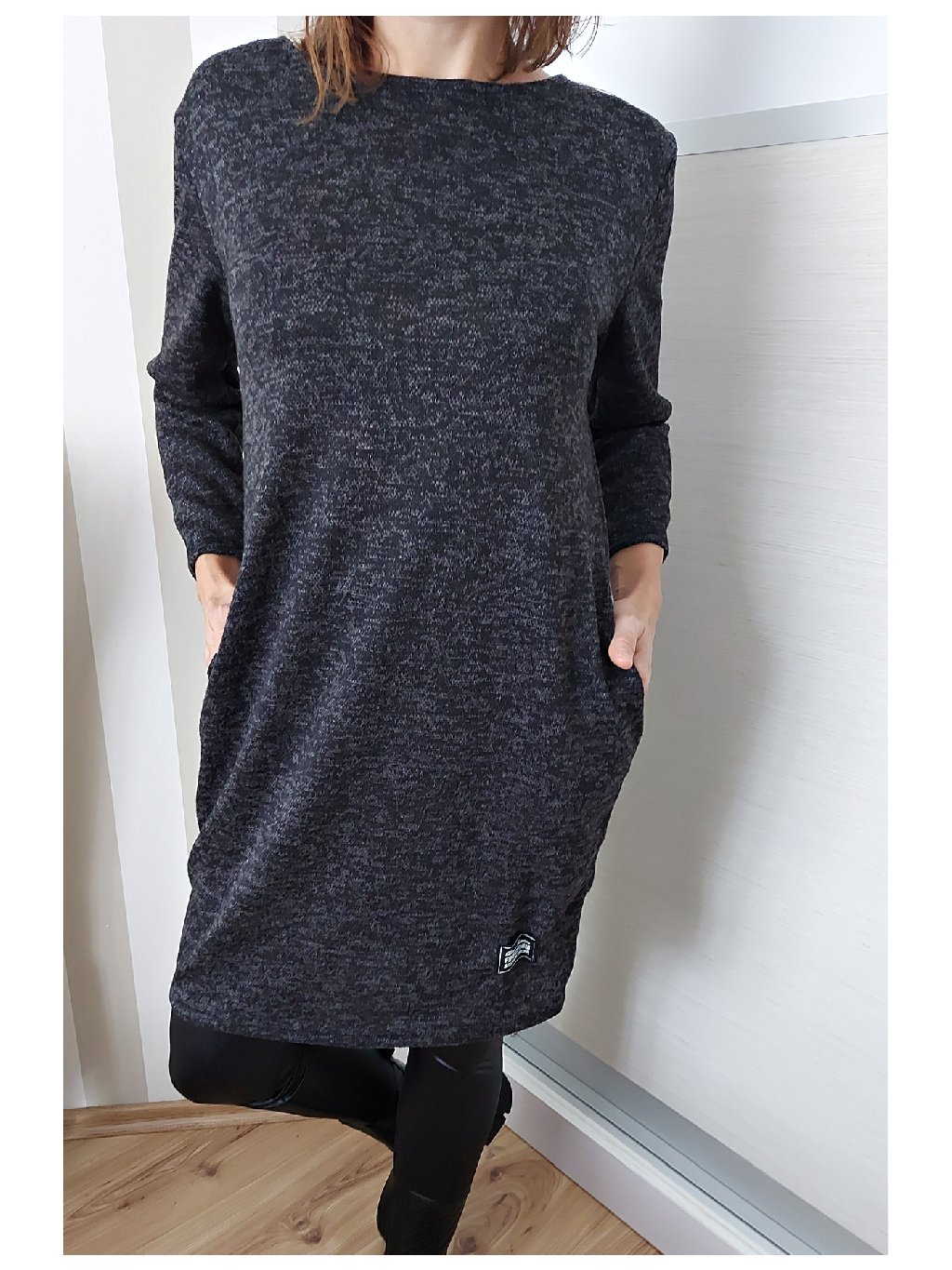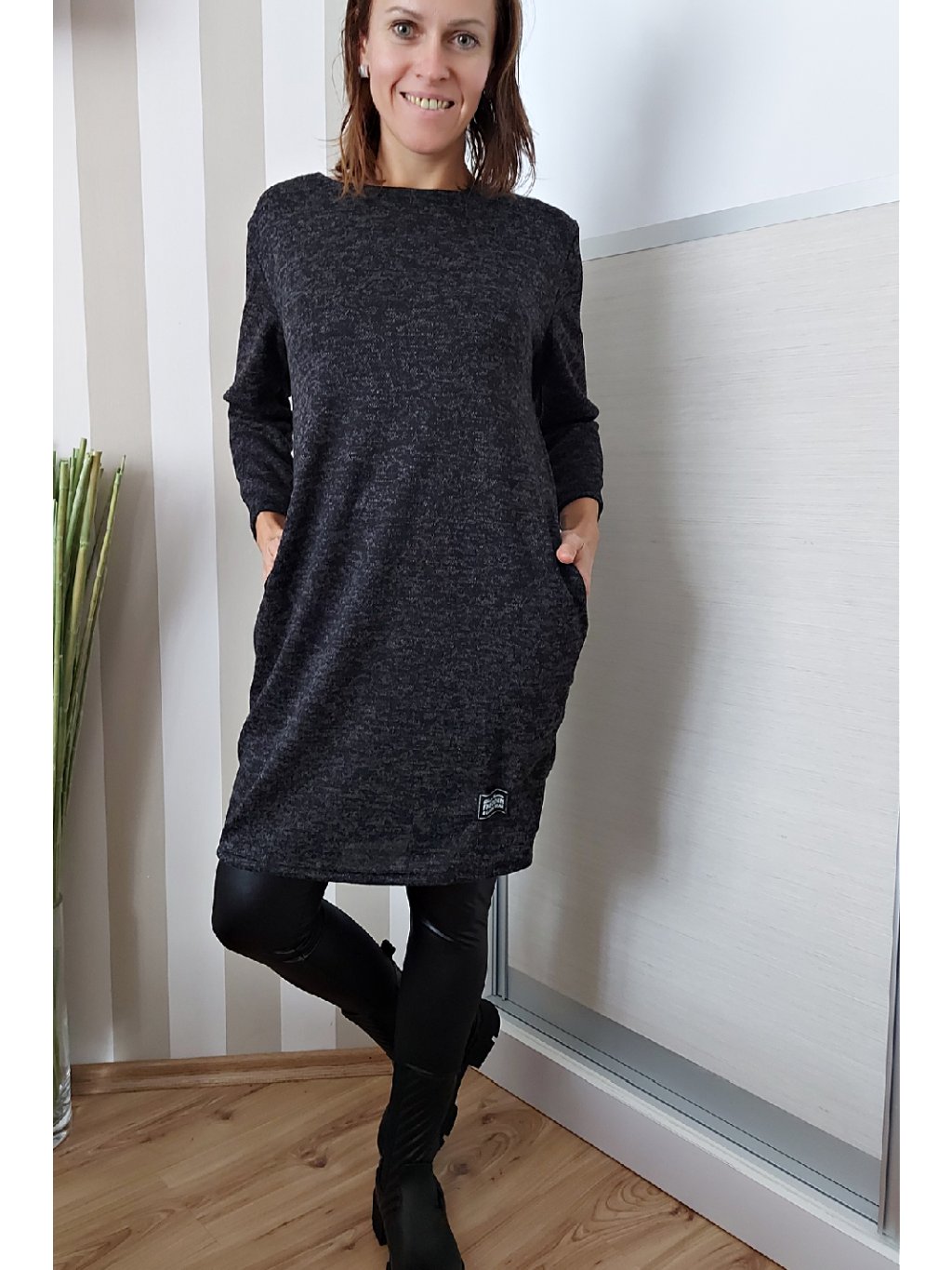 Šaty s bočními kapsami a ozdobnou nášivkou ve spodní části. Střih velmi slušivý a módní. Rukávy 3/4. Materiál s kratším chloupkem - nekousavý. Vhodné pro podzim a zimu. Menší velikost focena na vel. XS, výška 156cm a větší velikost focen na vel.46/48, výška 168cm (prsa 116cm, boky 119cm).