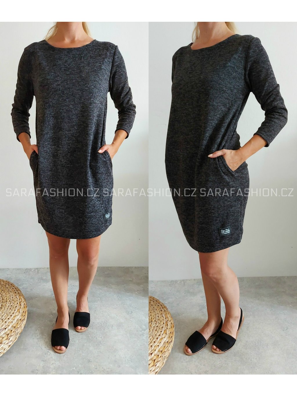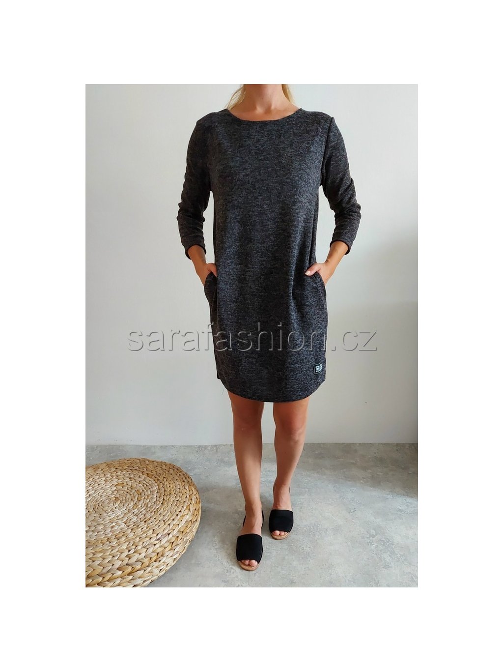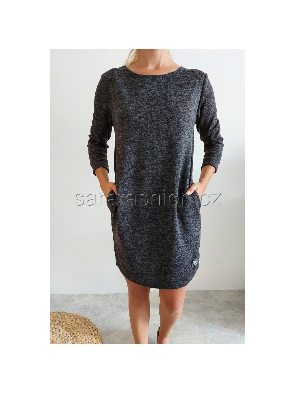Šaty s bočními kapsami a ozdobnou nášivkou ve spodní části. Střih velmi slušivý a módní. Rukávy 3/4. Materiál s kratším chloupkem - nekousavý. Vhodné pro podzim a zimu. Menší velikost focena na vel. XS, výška 156cm a větší velikost focen na vel.46/48, výška 168cm (prsa 116cm, boky 119cm).