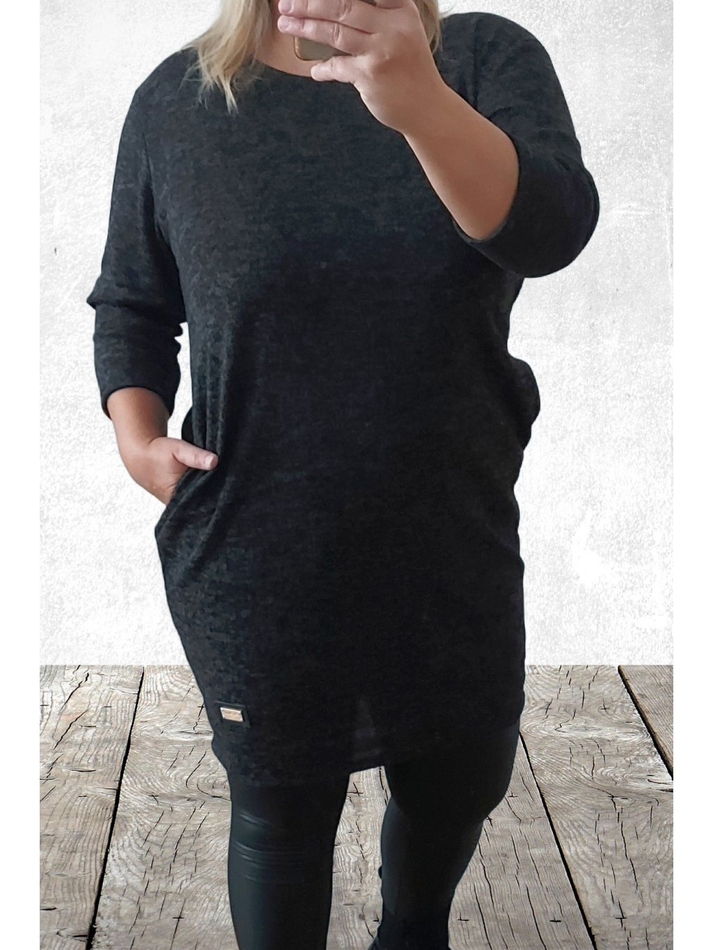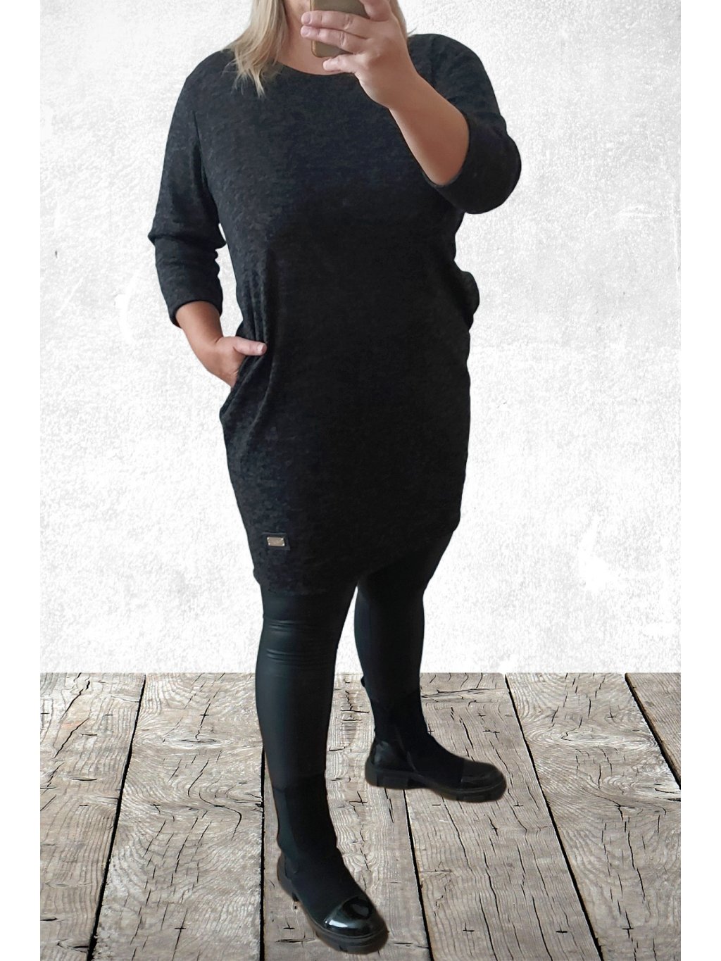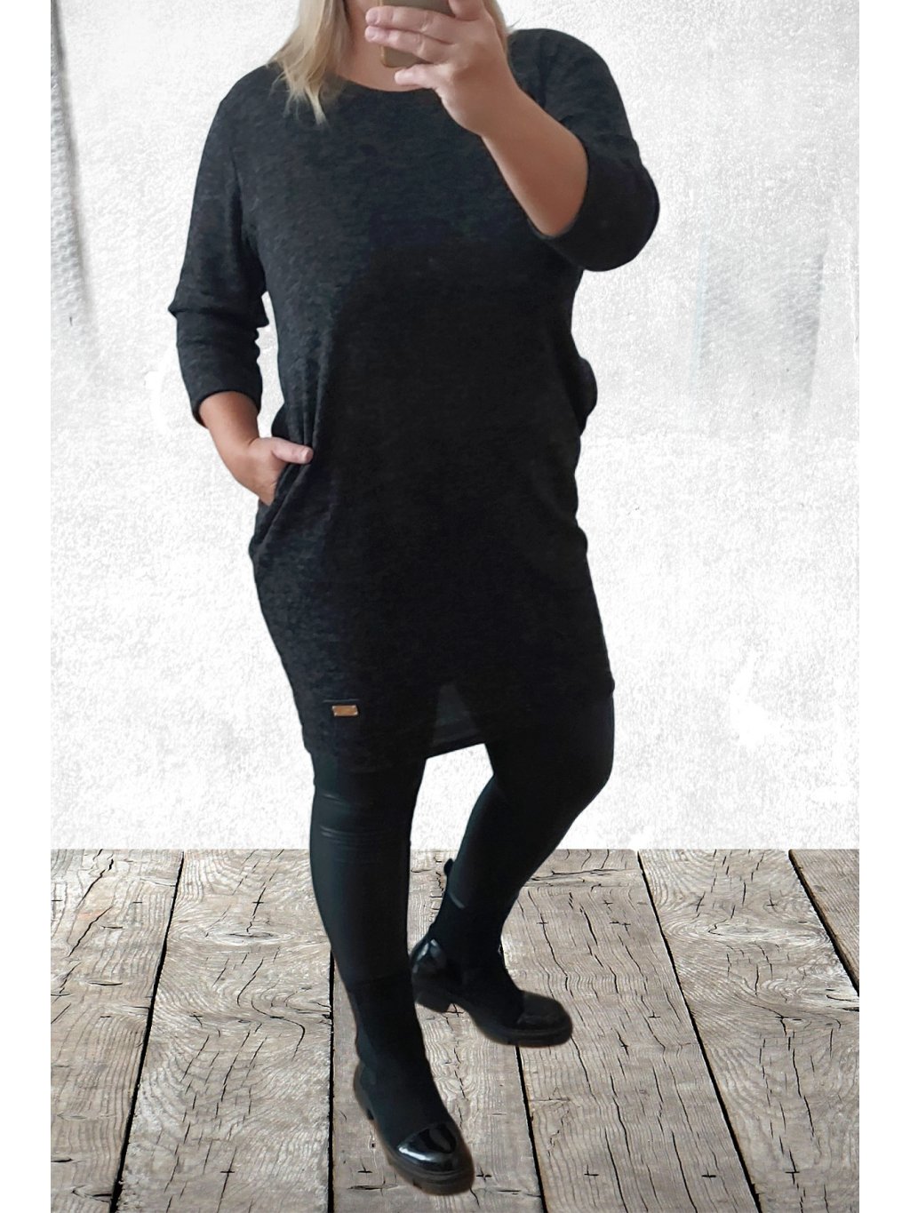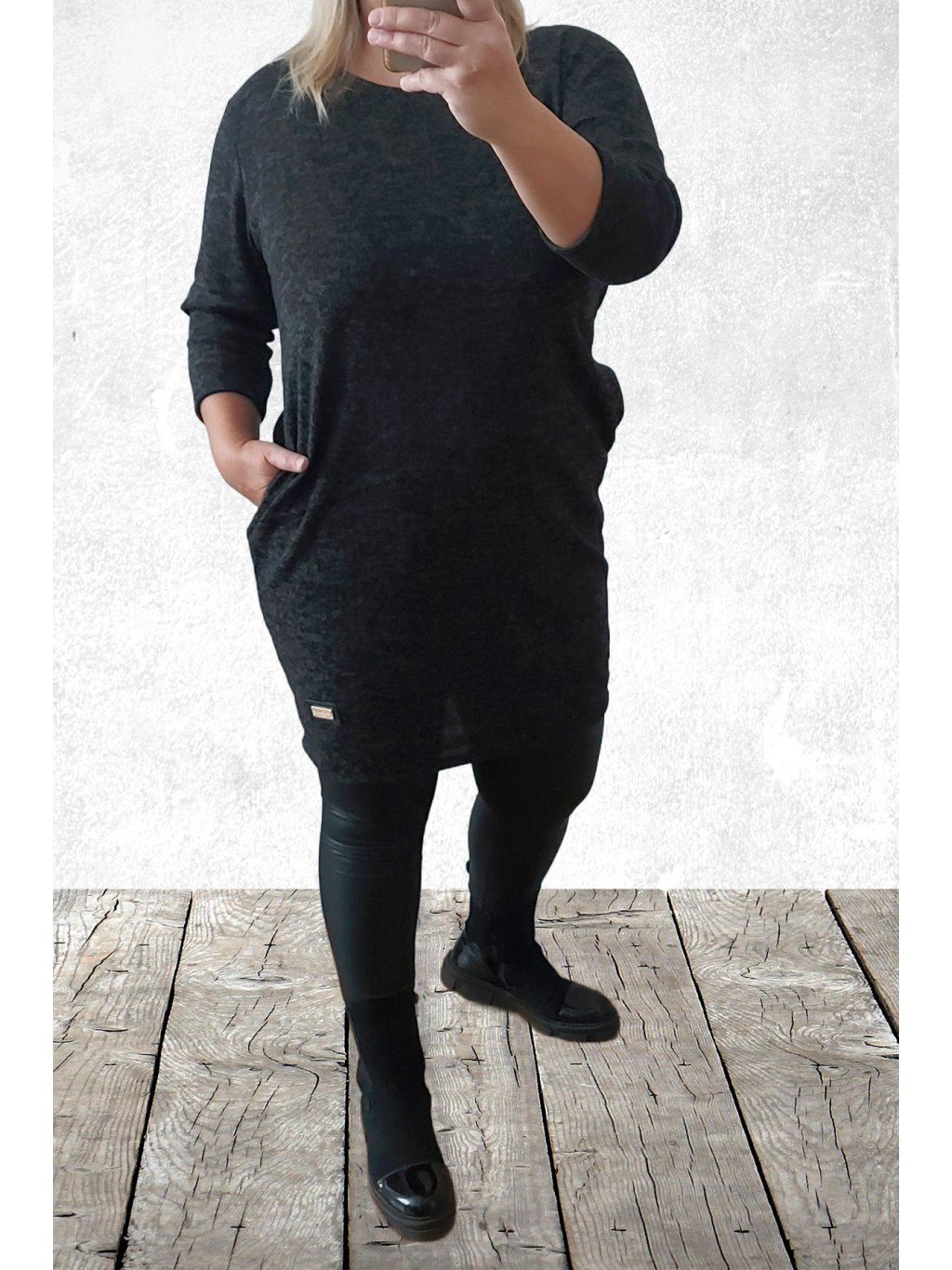 Šaty s bočními kapsami a ozdobnou nášivkou ve spodní části. Střih velmi slušivý a módní. Rukávy 3/4. Materiál s kratším chloupkem - nekousavý. Vhodné pro podzim a zimu. Menší velikost focena na vel. XS, výška 156cm a větší velikost focen na vel.46/48, výška 168cm (prsa 116cm, boky 119cm).
