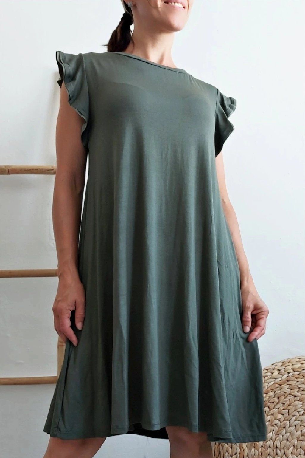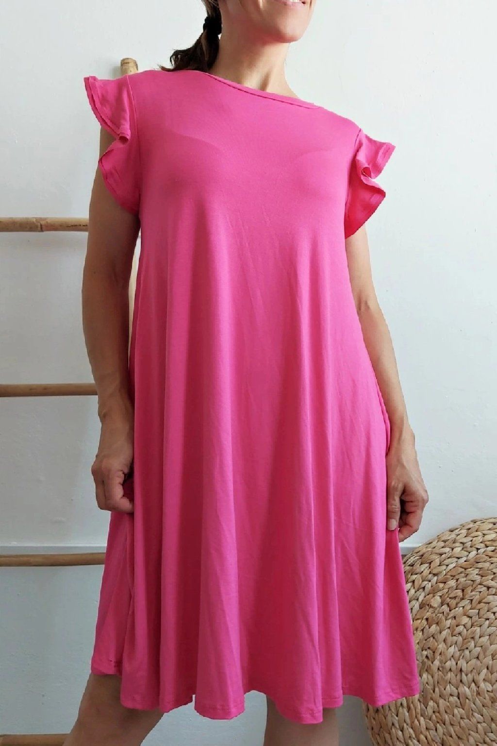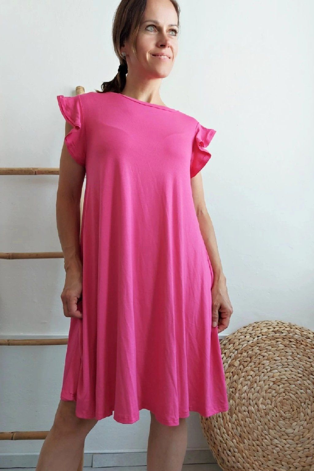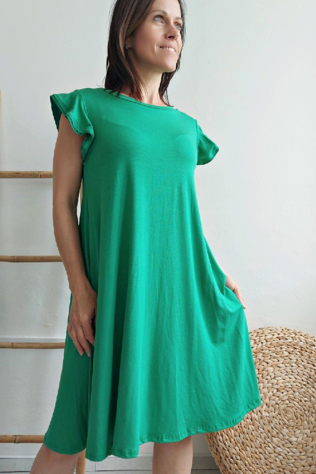 Lehoučké, vzdušné šaty áčkového střihu. Rukávy s volánky. Materiál je lehoučký, ideální na horké, letní dny a velmi pružný. Foceno na vel. XS, výška 163cm i na vel. 46/48 (prsa 116cm, boky 119cm), výška 165cm.