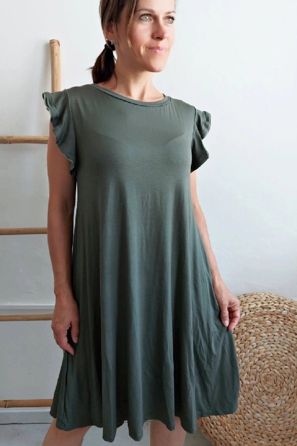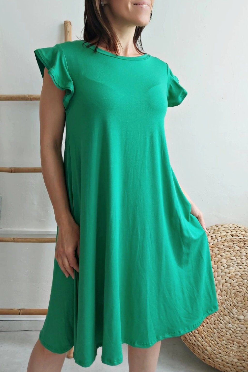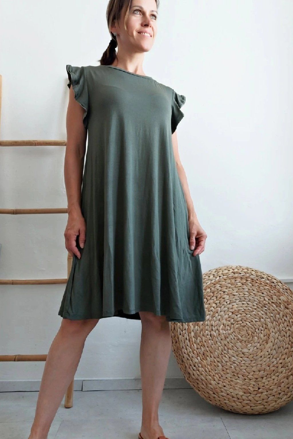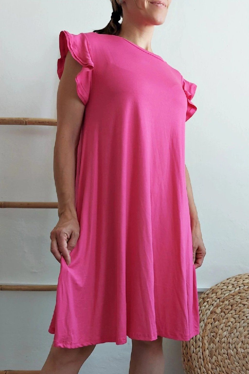 Lehoučké, vzdušné šaty áčkového střihu. Rukávy s volánky. Materiál je lehoučký, ideální na horké, letní dny a velmi pružný. Foceno na vel. XS, výška 163cm i na vel. 46/48 (prsa 116cm, boky 119cm), výška 165cm.