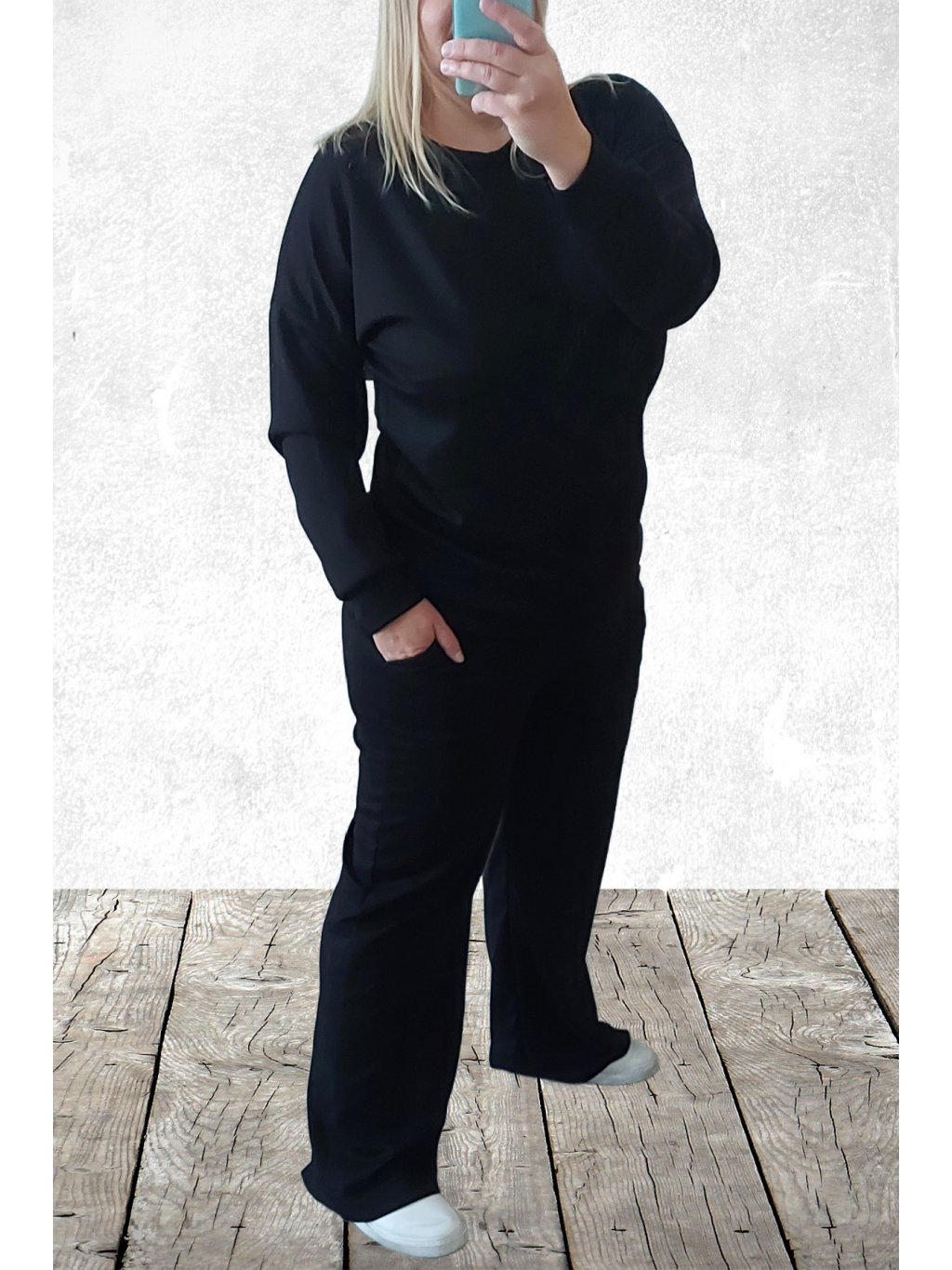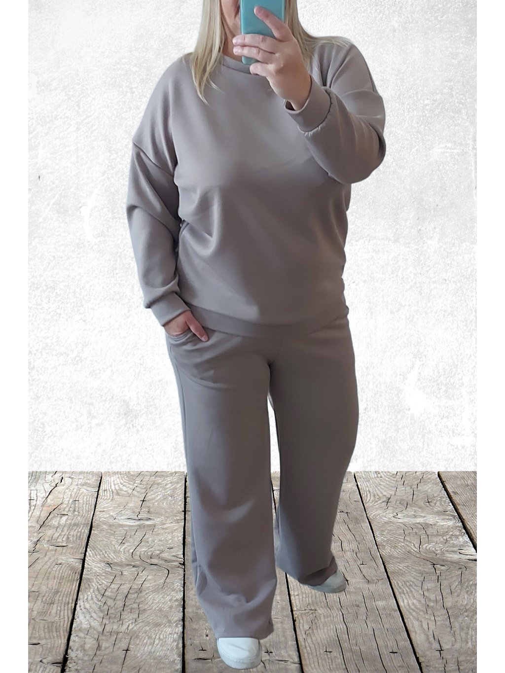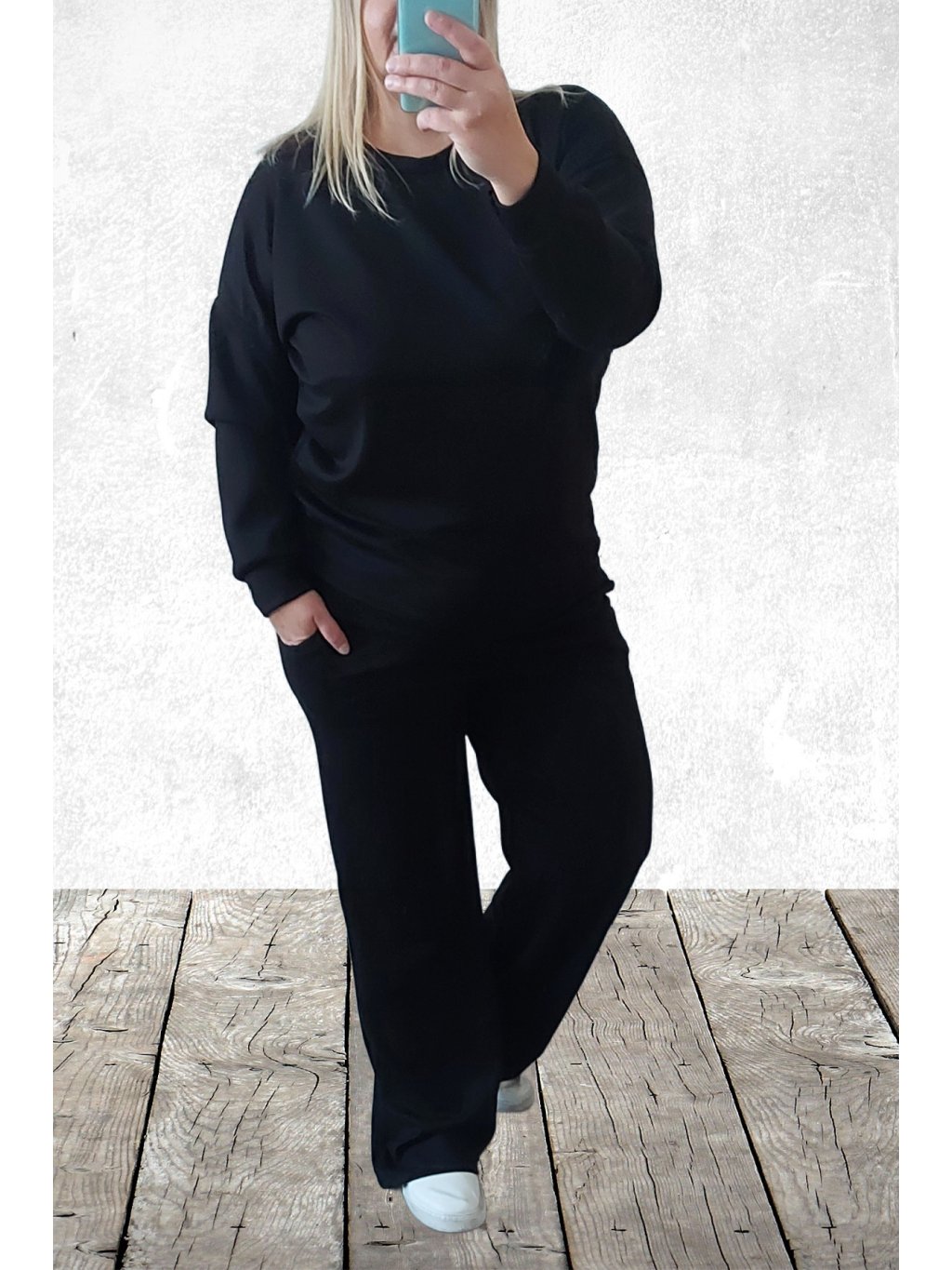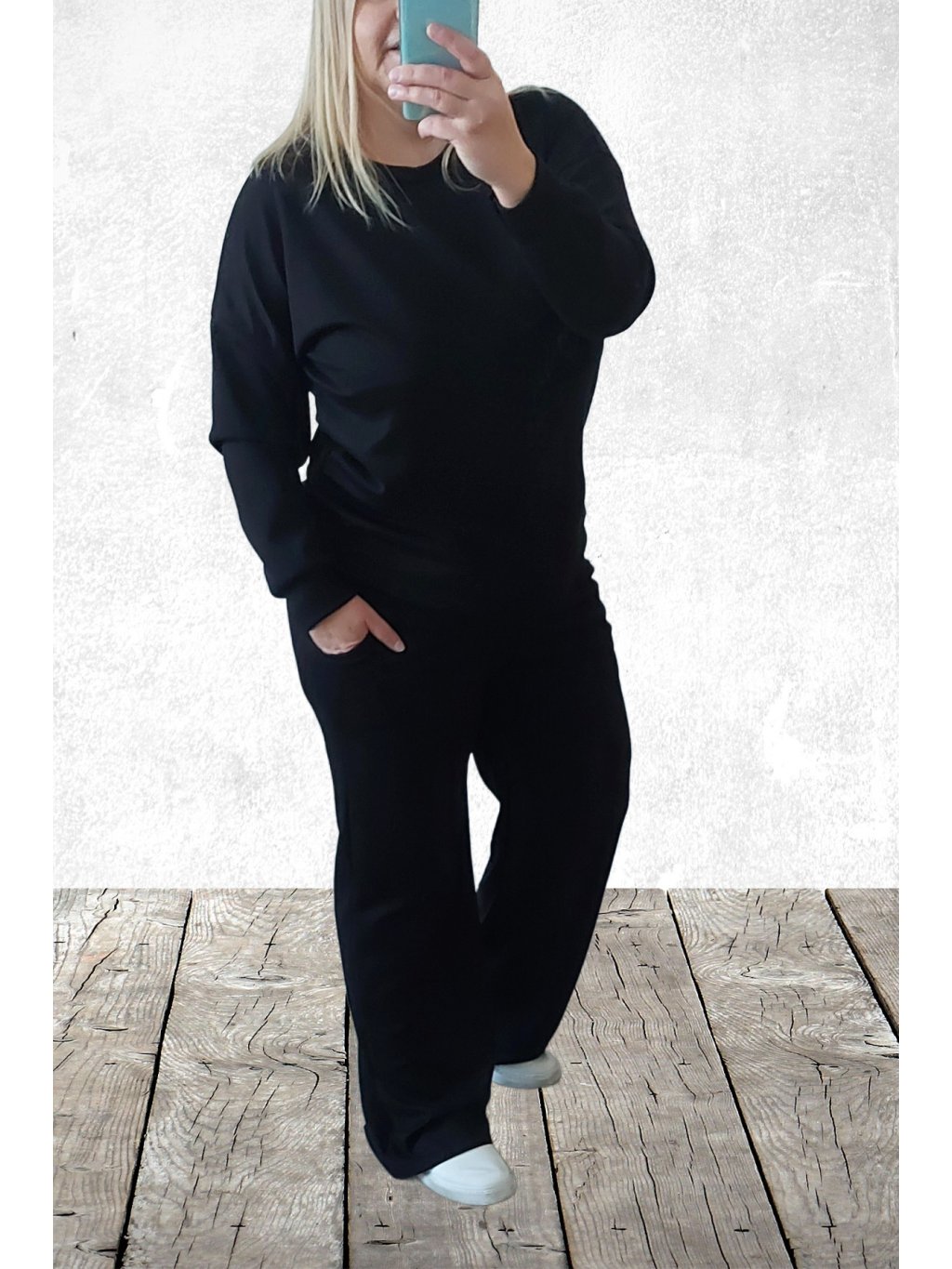 Módní komplet mikiny a kalhot. Mikina má dlouhé rukávy. Kalhoty mají široké nohavice a jsou v pase do gumy. Přední kapsy, vzadu bez kapes. Materiál je prvotřídní kvality tzv. máslový - hebký, sametový na dotek, jemný, klouzavý, nadýchaný a také pružný. Foceno na vel. 2XL (prsa 116cm, pas 110cm, boky 119cm), výška 165cm.