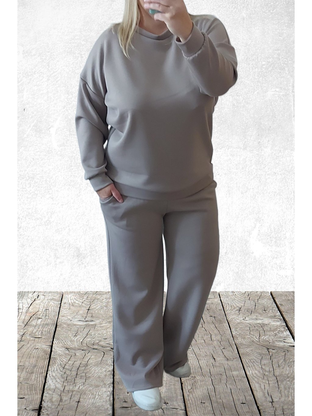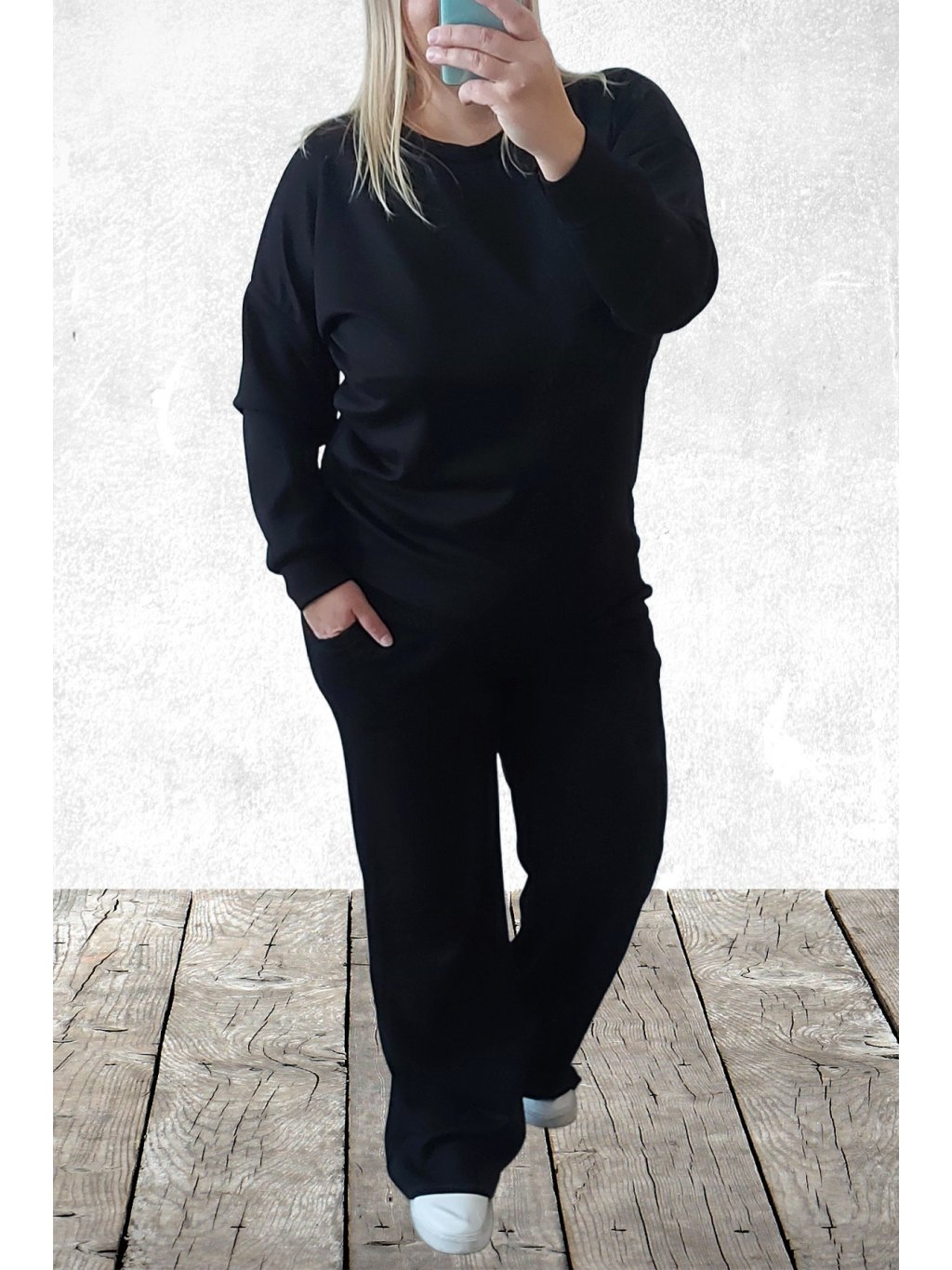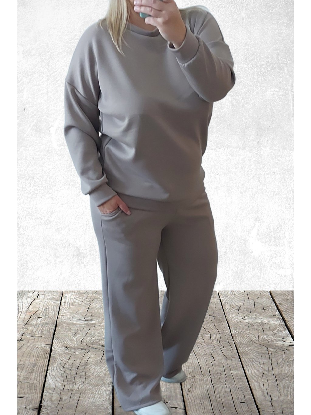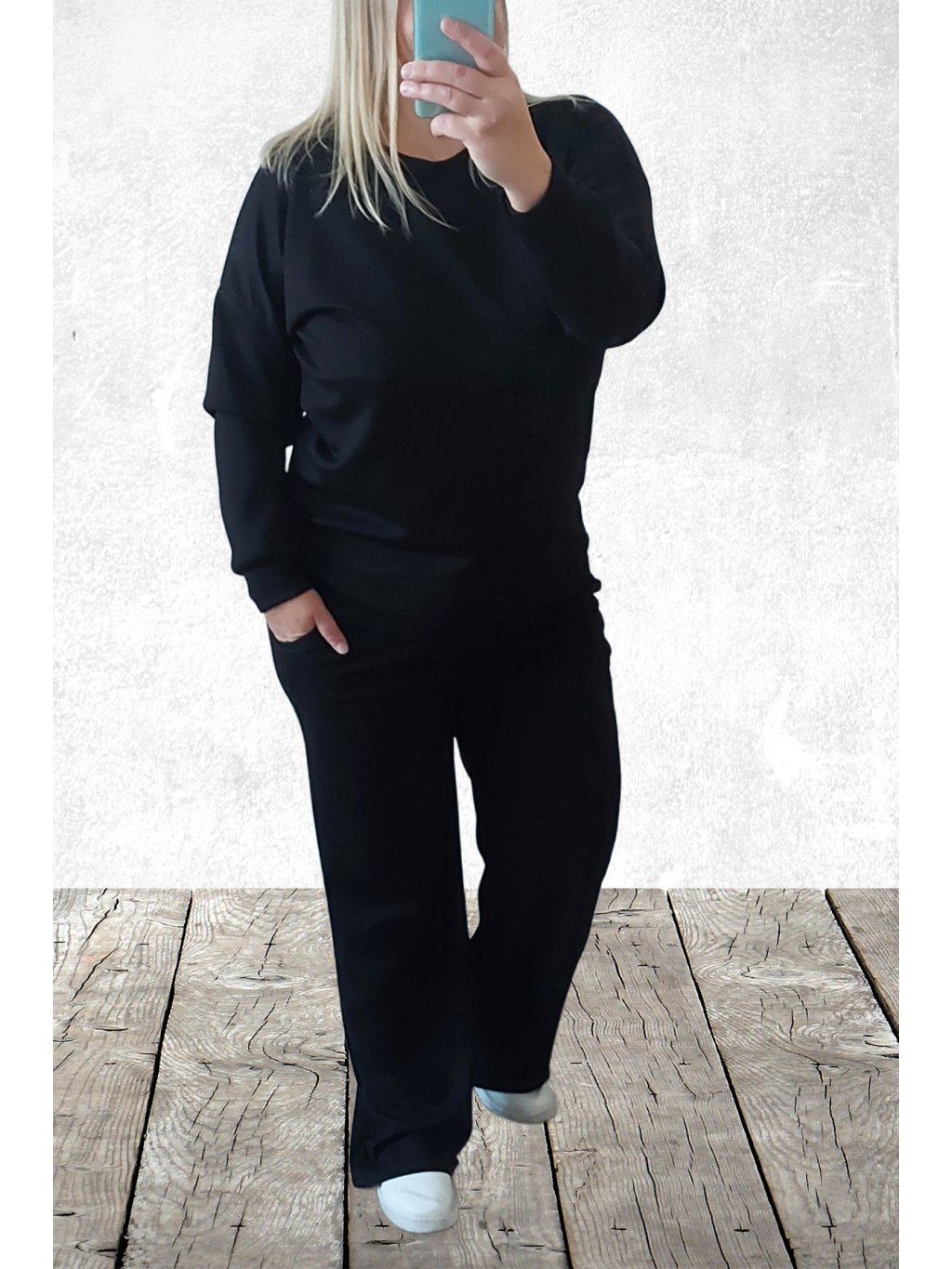 Módní komplet mikiny a kalhot. Mikina má dlouhé rukávy. Kalhoty mají široké nohavice a jsou v pase do gumy. Přední kapsy, vzadu bez kapes. Materiál je prvotřídní kvality tzv. máslový - hebký, sametový na dotek, jemný, klouzavý, nadýchaný a také pružný. Foceno na vel. 2XL (prsa 116cm, pas 110cm, boky 119cm), výška 165cm.