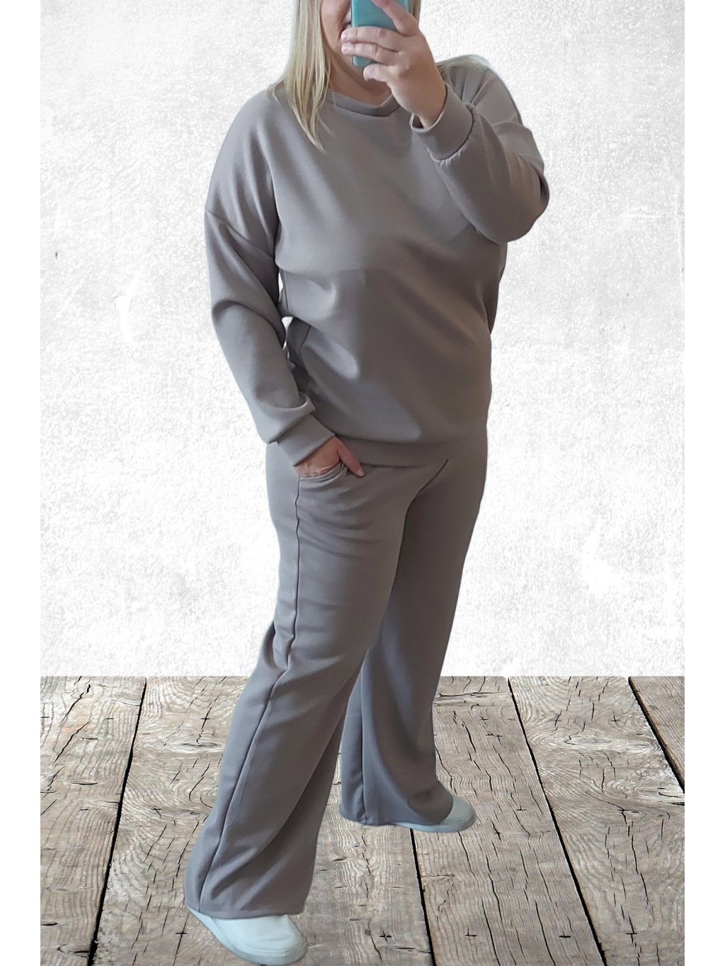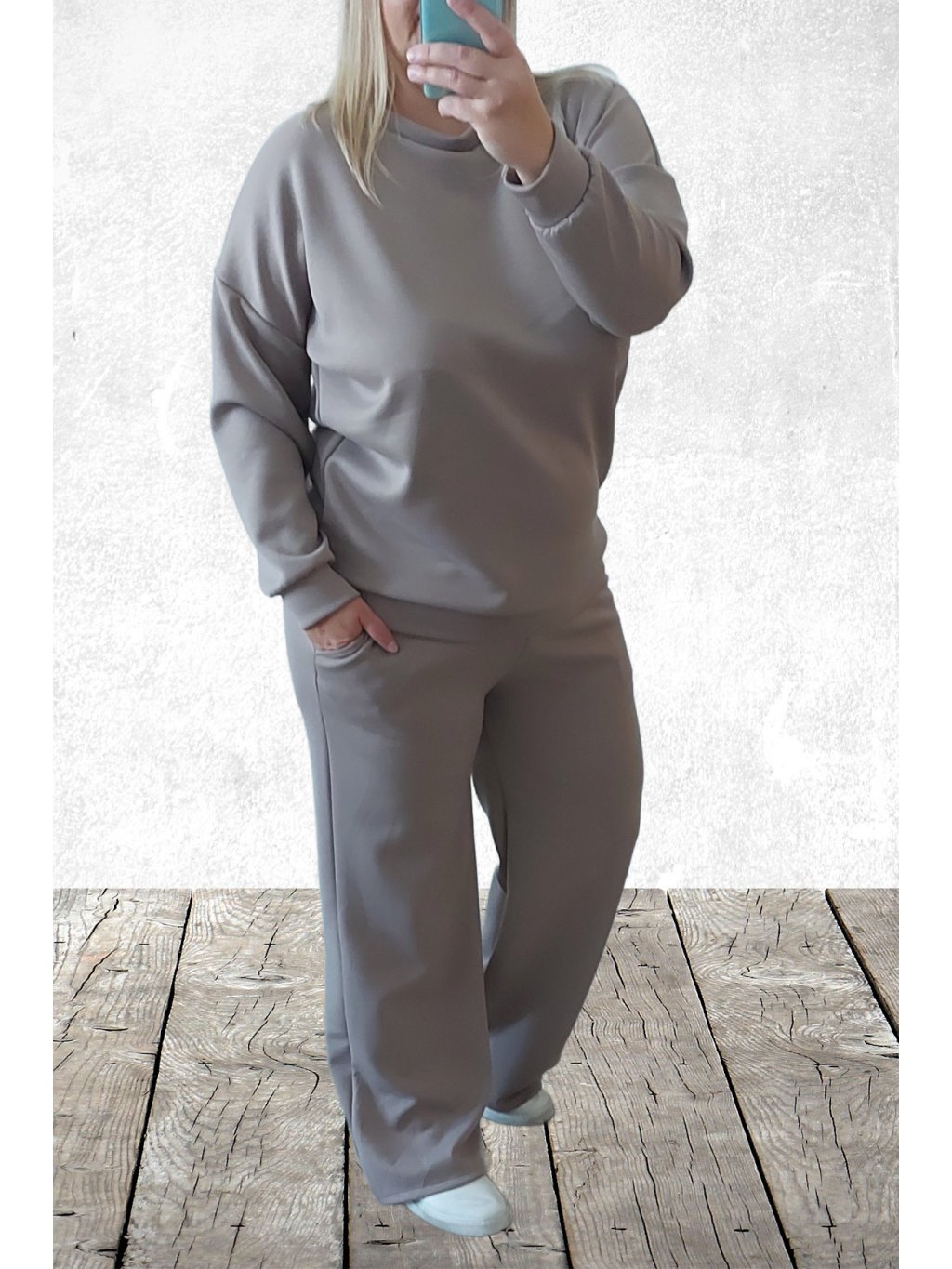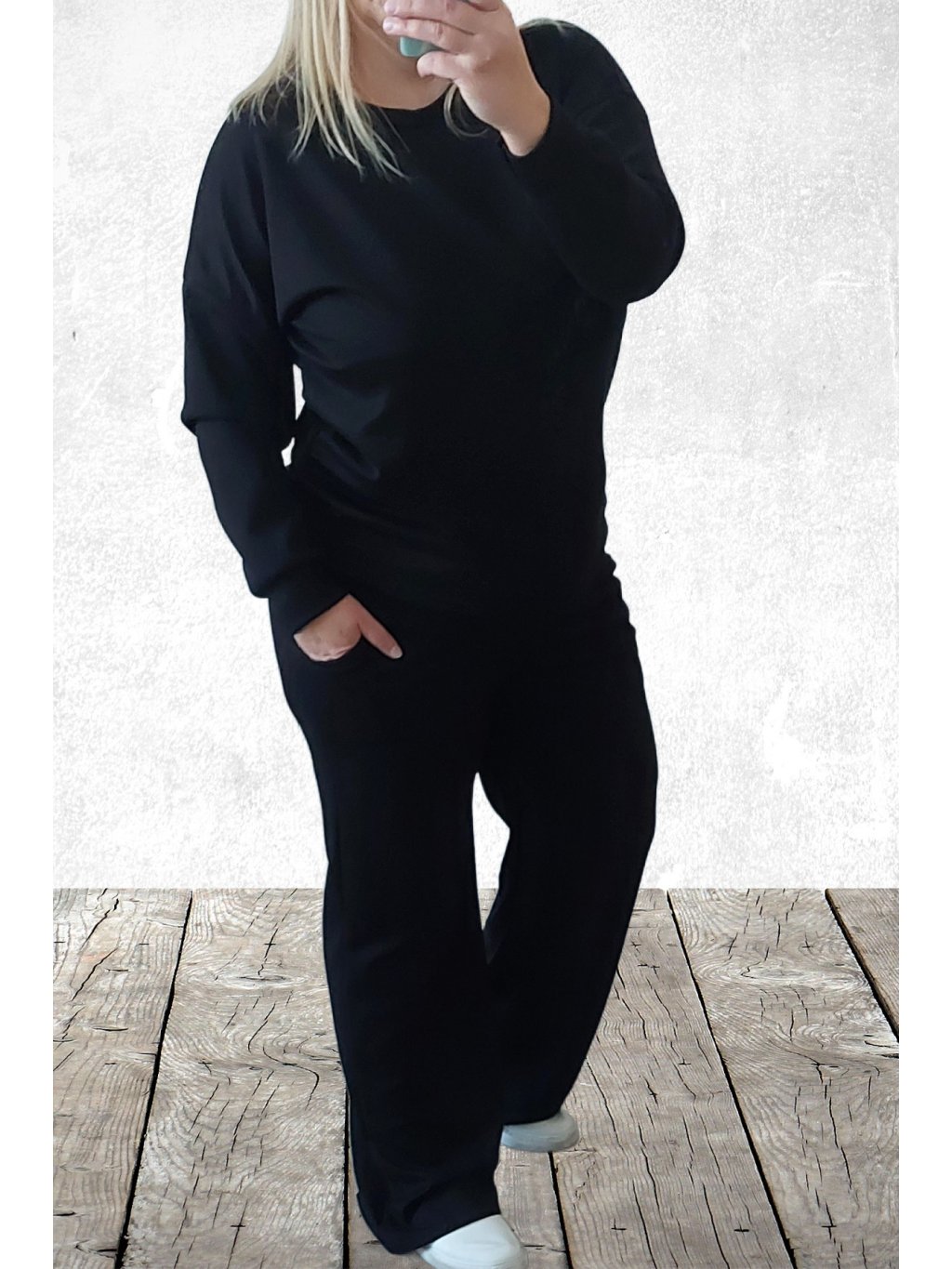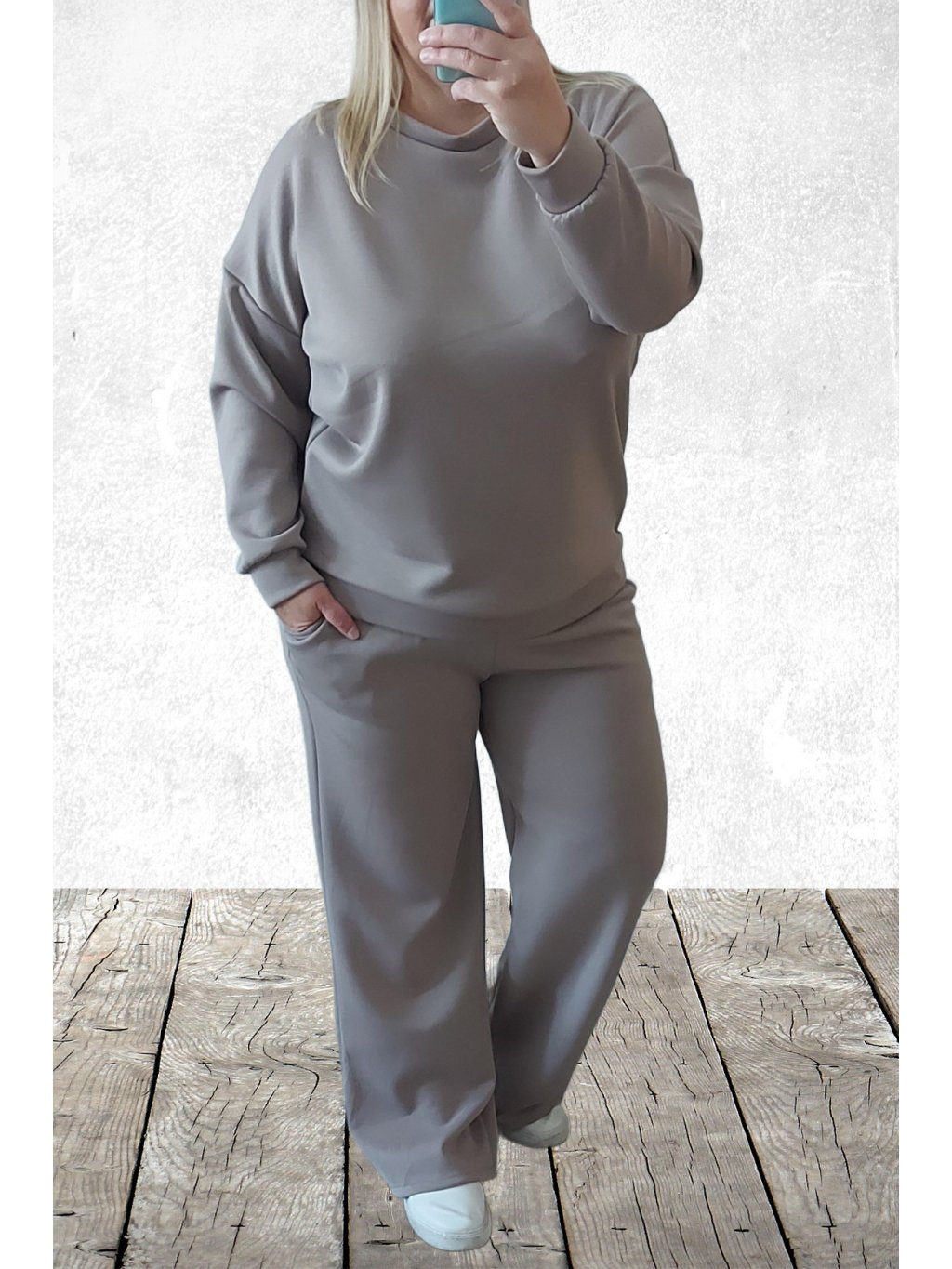 Módní komplet mikiny a kalhot. Mikina má dlouhé rukávy. Kalhoty mají široké nohavice a jsou v pase do gumy. Přední kapsy, vzadu bez kapes. Materiál je prvotřídní kvality tzv. máslový - hebký, sametový na dotek, jemný, klouzavý, nadýchaný a také pružný. Foceno na vel. 2XL (prsa 116cm, pas 110cm, boky 119cm), výška 165cm.