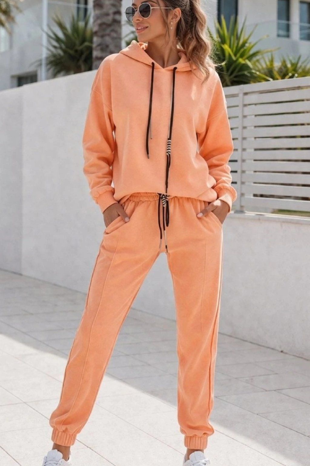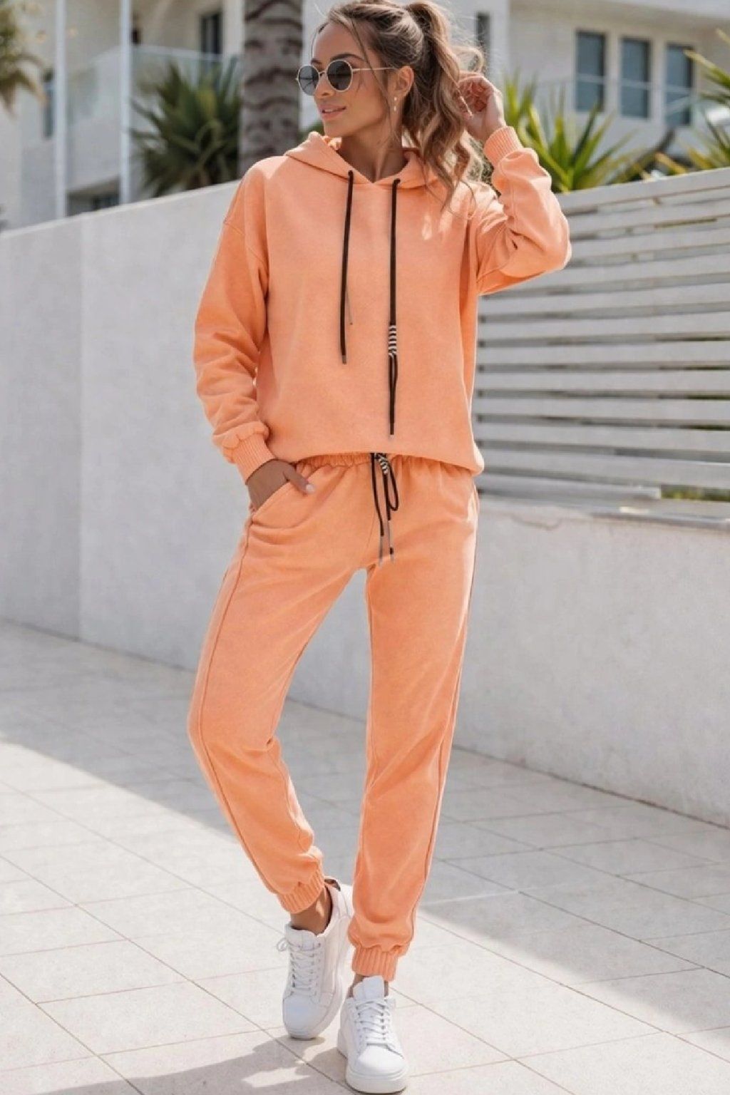 Módní komplet mikiny a teplákových kalhot. Mikina má kapuci a u ní ozdobné dvojbarevné šňůrky, které ji dodávají luxusní šmrnc. Rukávy jsou dlouhé, ukončené širším lemem. Spodní část je také řešena širším lemem. Tepláky mají v pase gumu a šňůrky pro stažení obvodu. Přední kapsy, vzadu bez kapes. Nohavice jsou ukončené gumkou. Luxusní prémiový materiál - vysokogramážní bavlna.
