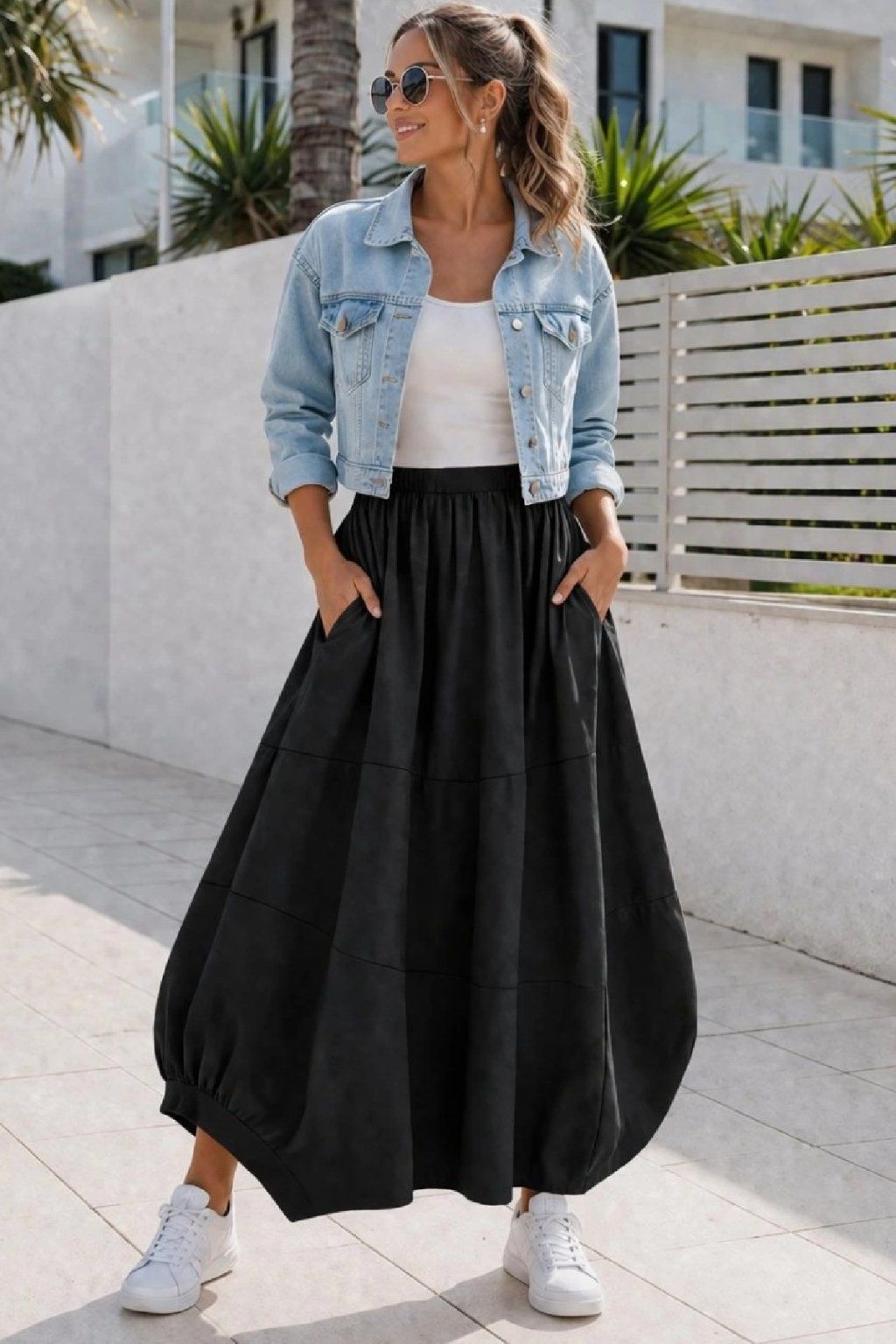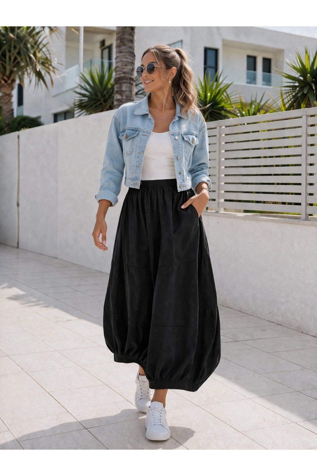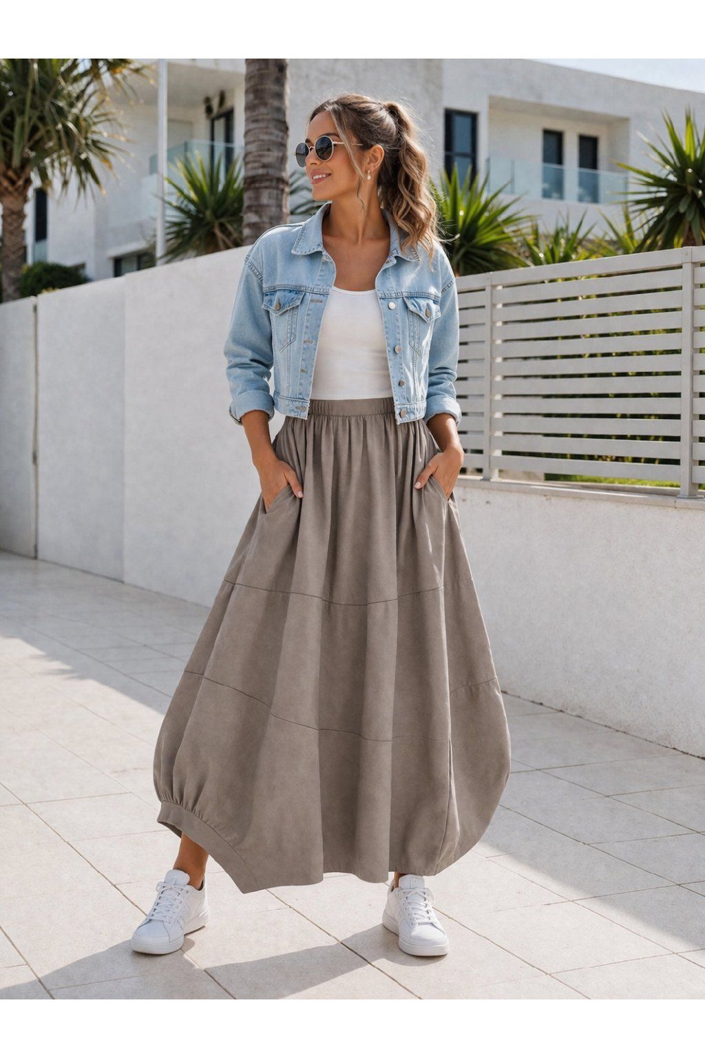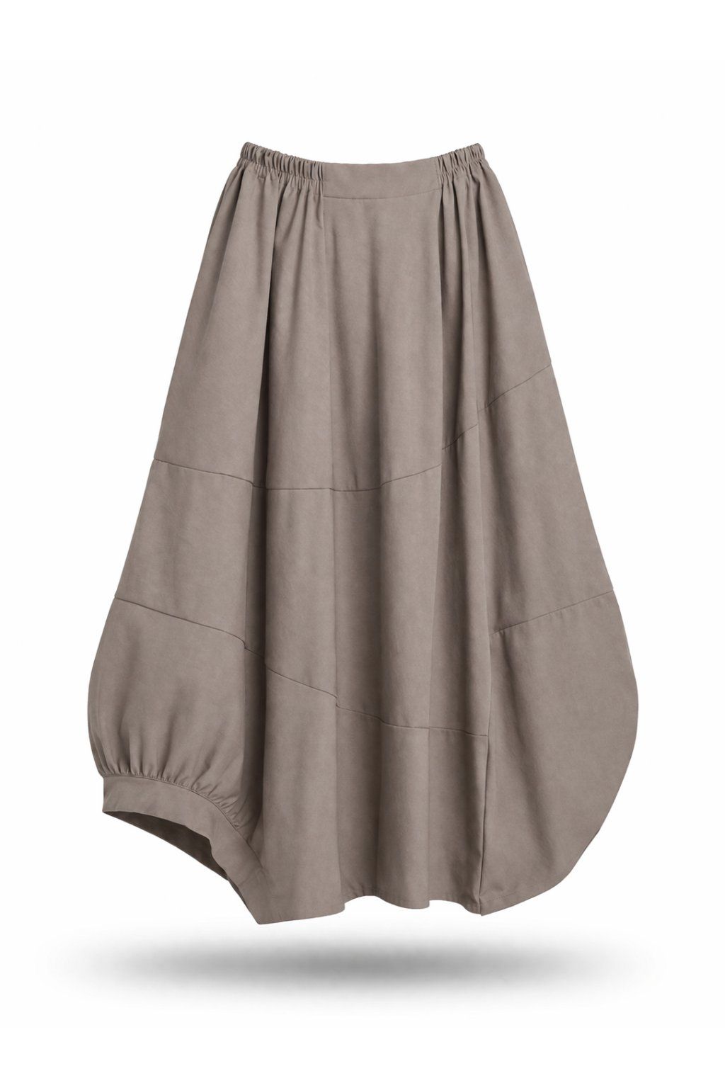 Dlouhá sukně balonového tvaru. V pase do gumy. Boční kapsy. Vpředu i vzadu je řešena viditelnými švy, které vedou různými směry. Spodní díl je jedné strany řešen lemem a menším rozparkem, z druhé strany bez lemu. Prémiová kvalita. Pro milovnice luxusu jasná volba. Materiál vysoce kvalitní, pružný.