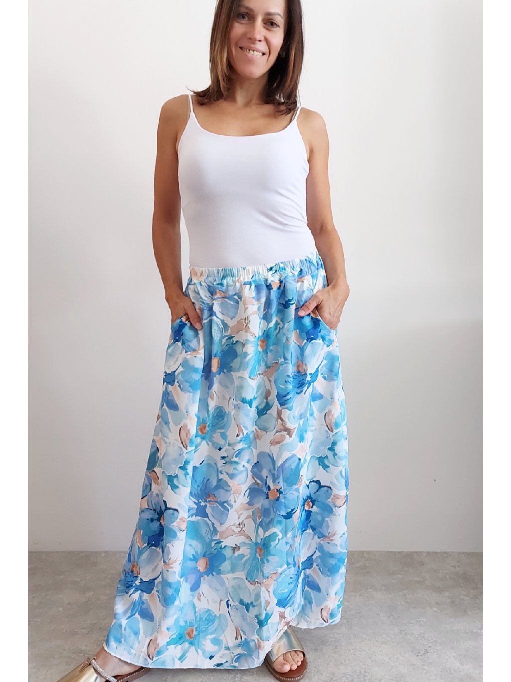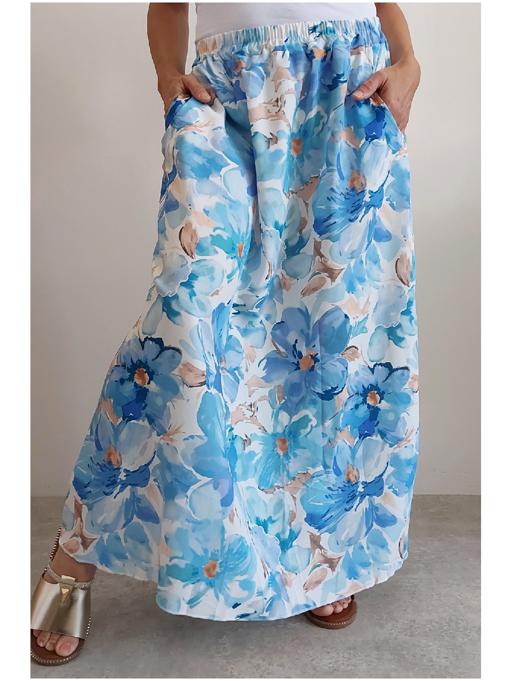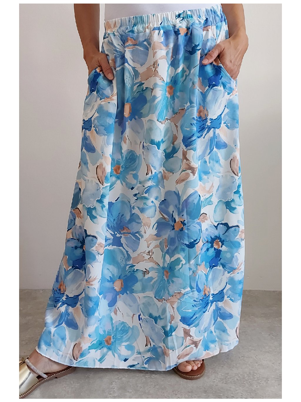 Maxi sukně s motivem květin. V pase do gumy. Přední kapsy, vzadu bez kapes. Vzdušný, chladivý materiál připomínající satén. Vel. L/XL focena na vel. XS, výška 156cm.