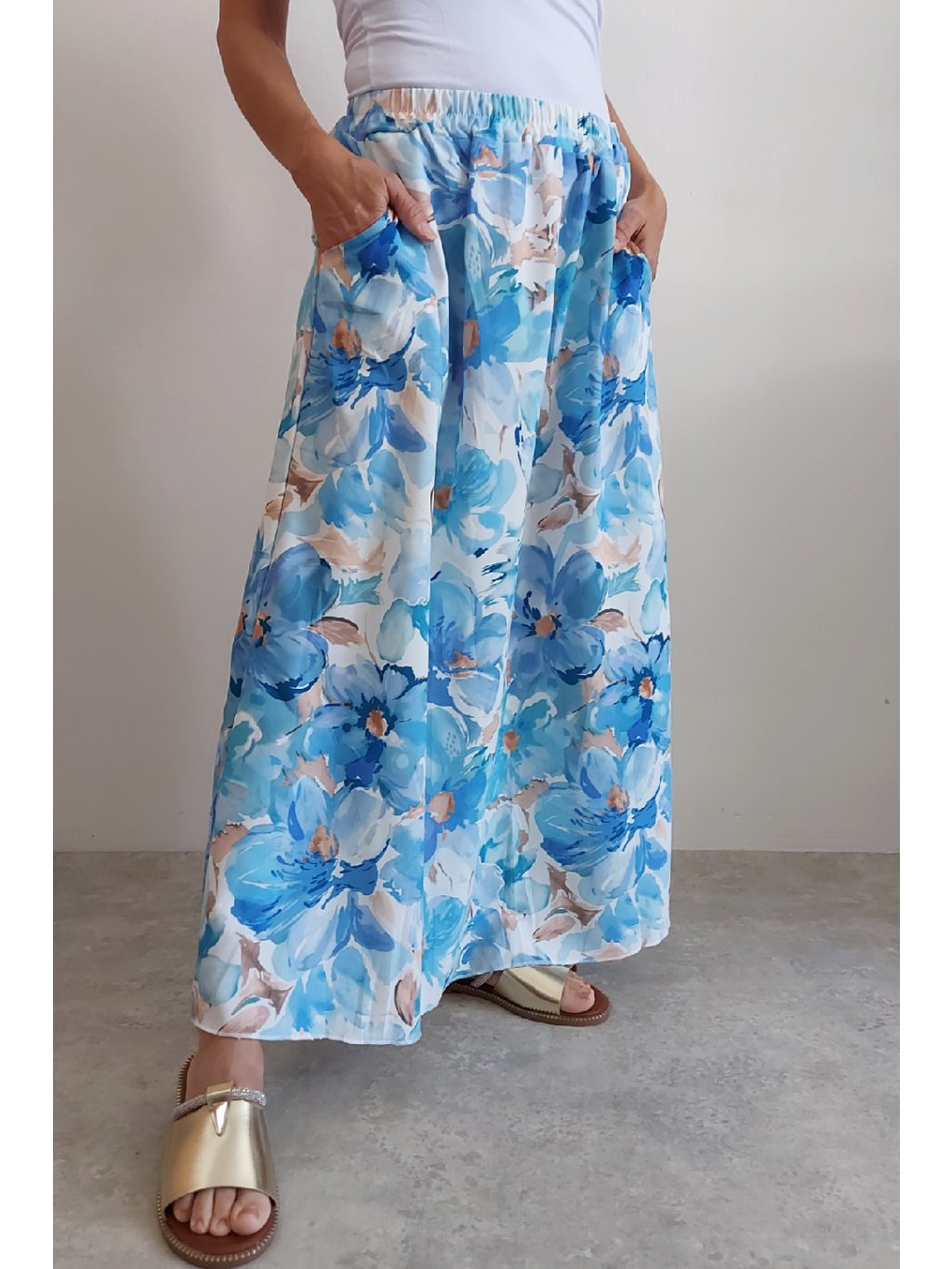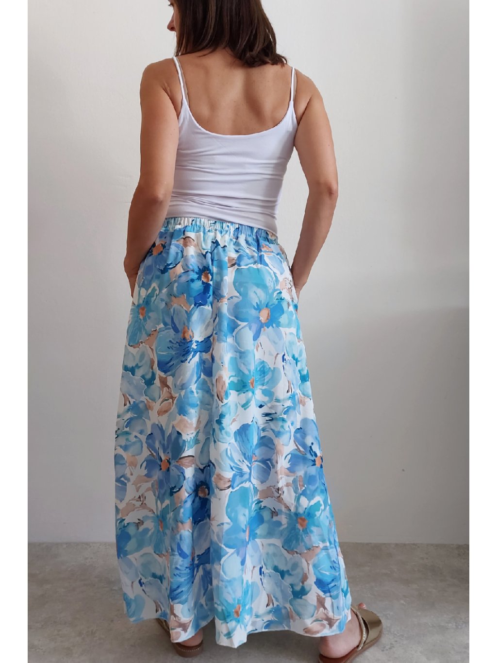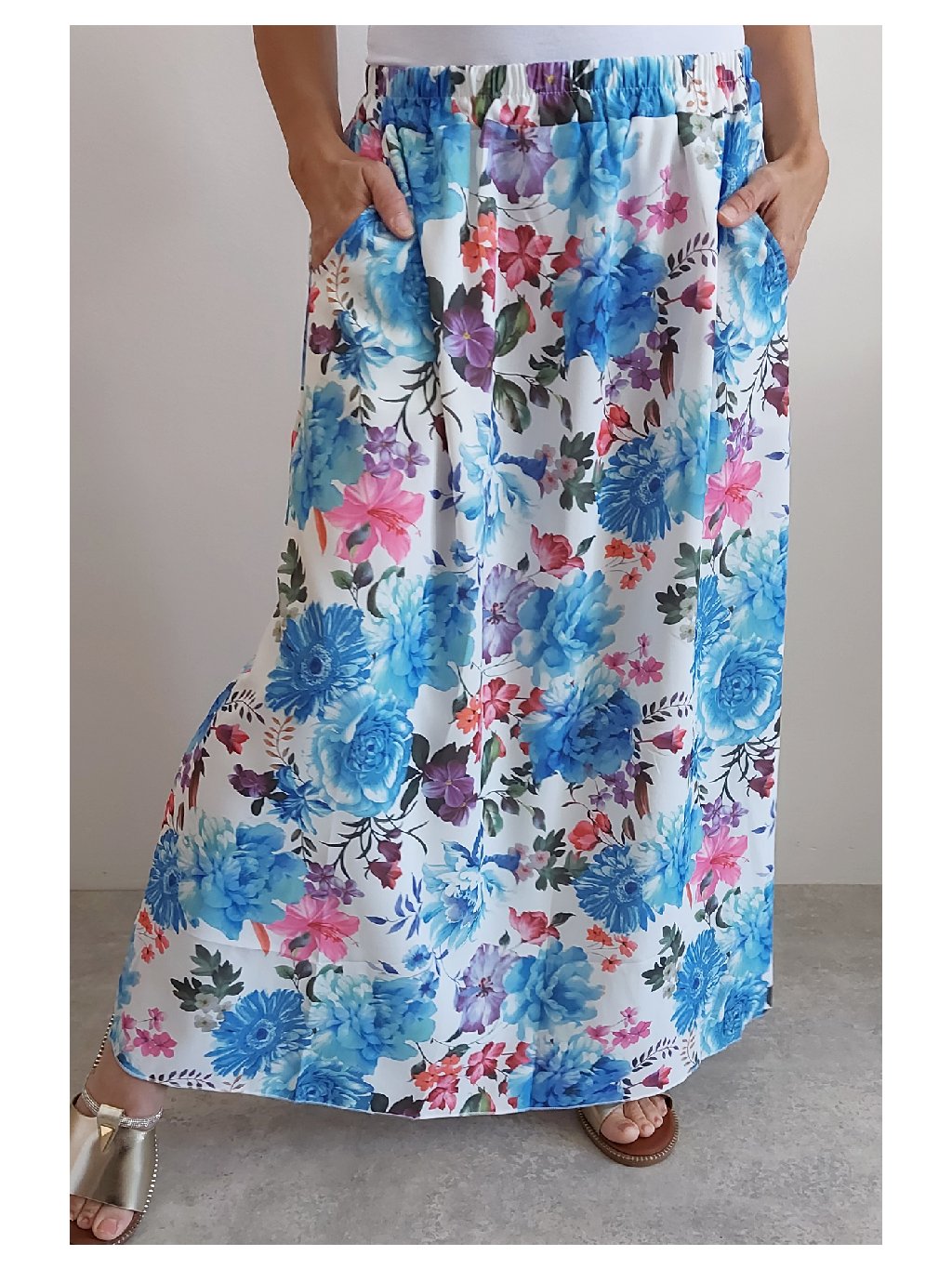 Maxi sukně s motivem květin. V pase do gumy. Přední kapsy, vzadu bez kapes. Vzdušný, chladivý materiál připomínající satén. Vel. L/XL focena na vel. XS, výška 156cm.