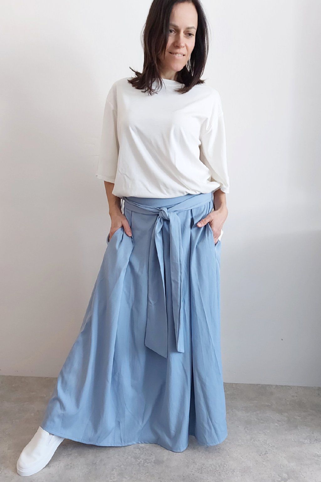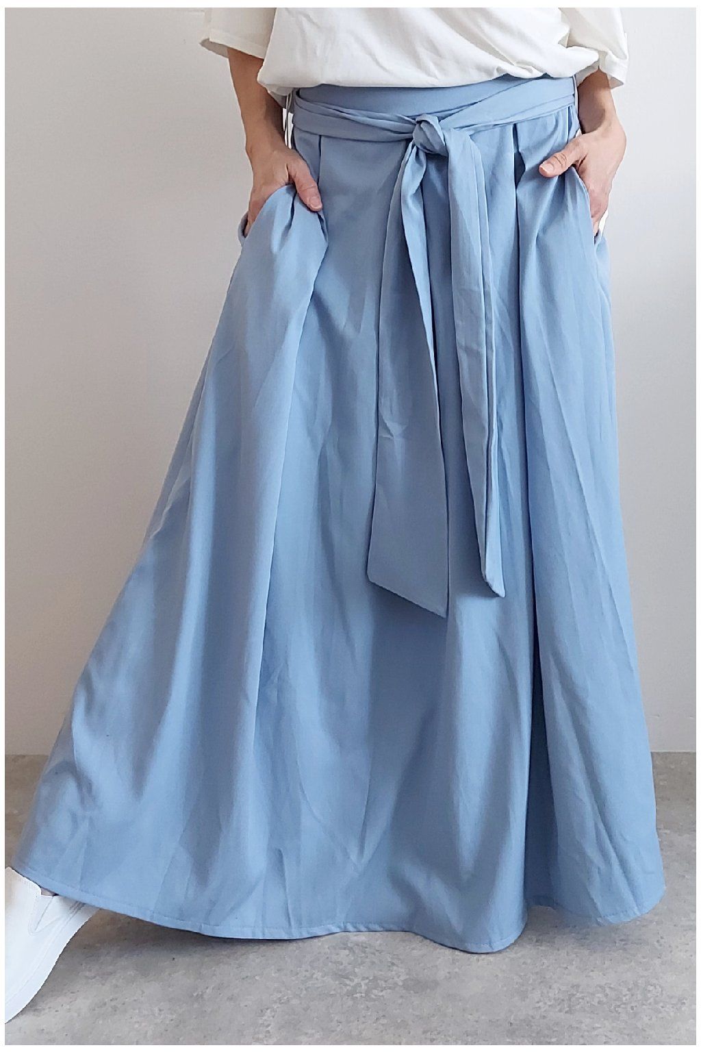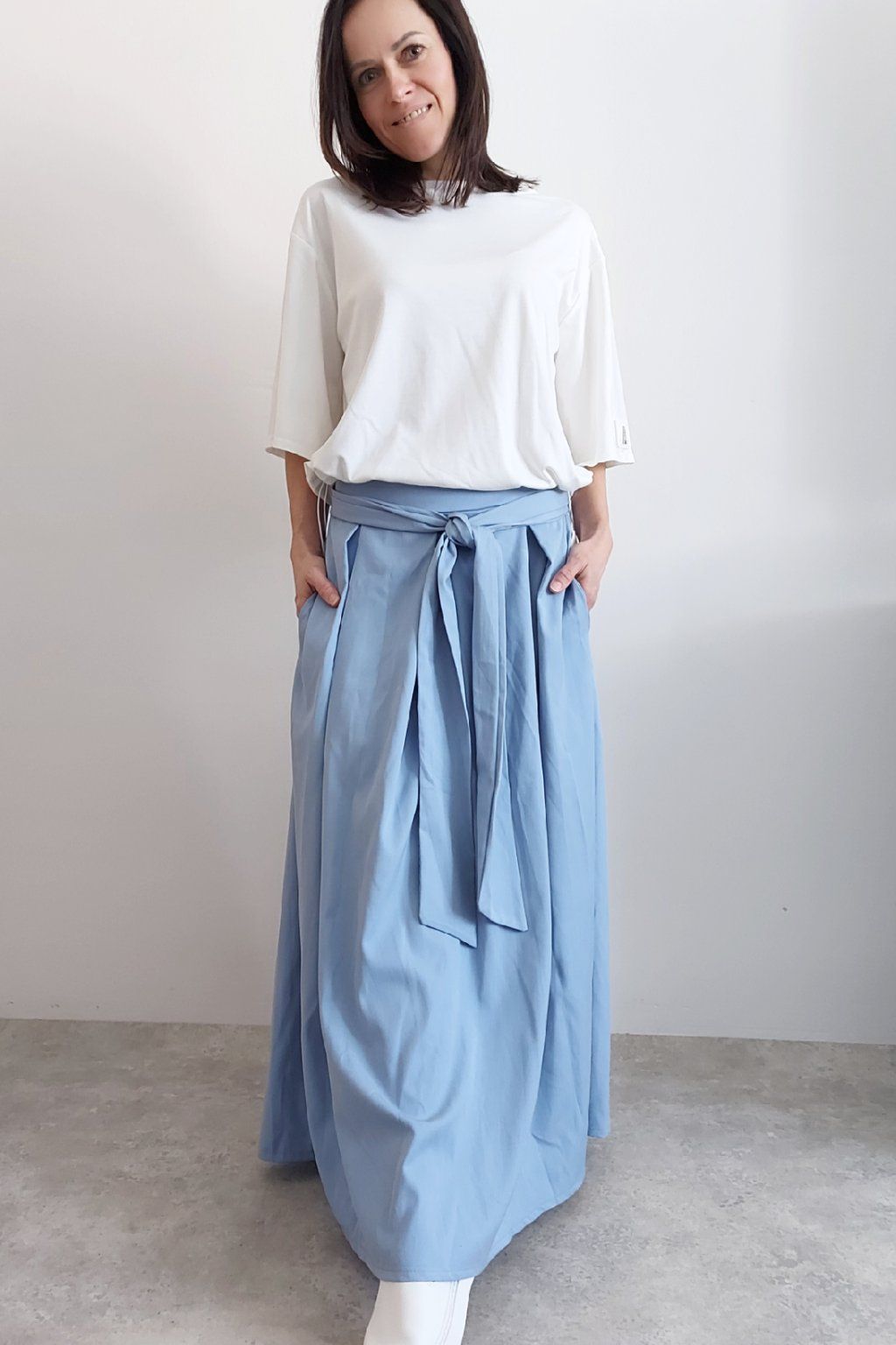 Dlouhá sukně imitace džínoviny. V pase guma a ozdobný pásek ze stejného materiálu, který lze uvázat v pase dle libosti. Ten je tam našitý napevno. Přední kapsy. Pod gumou, v pase jsou sámky a díky nim drží sukně tvar. Foceno na vel. XS, výška 156cm.