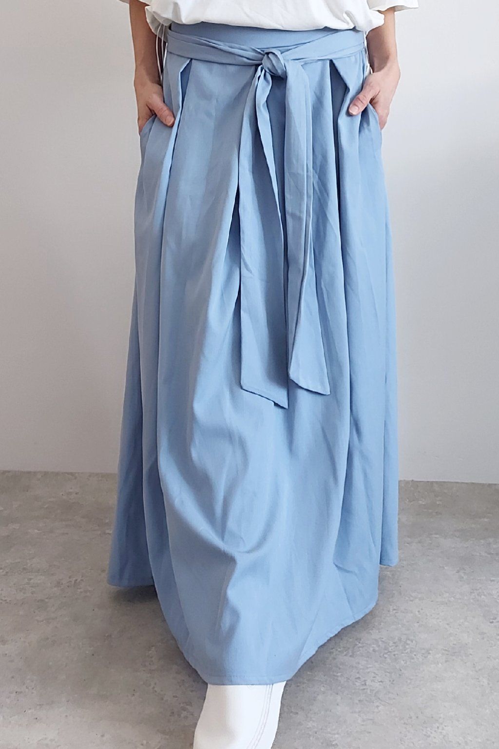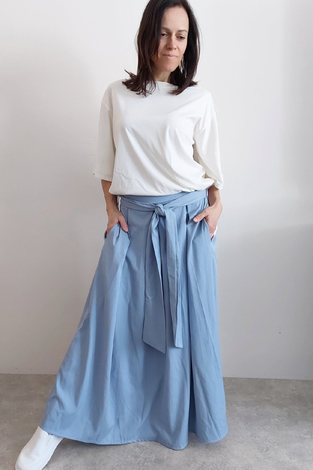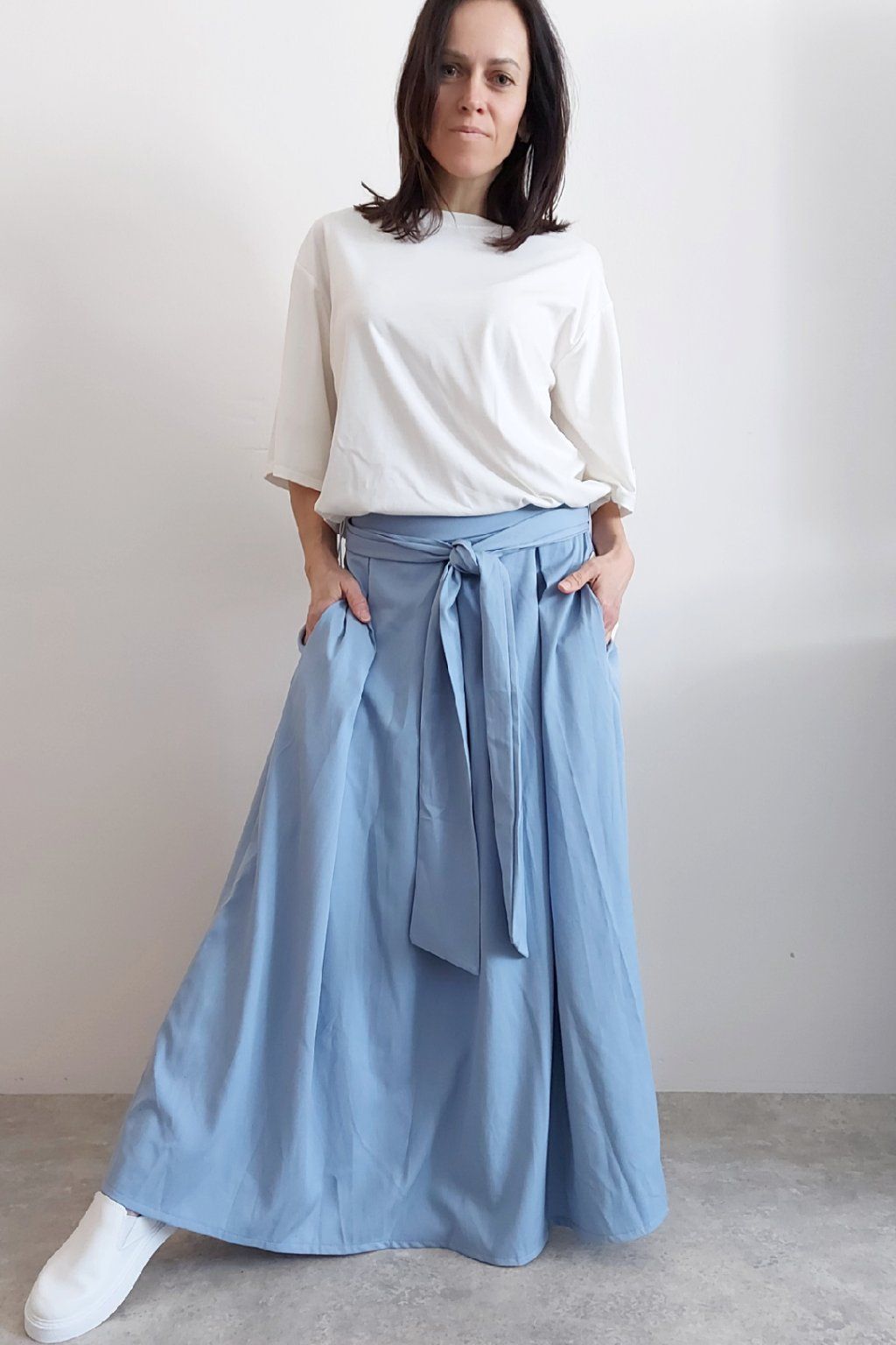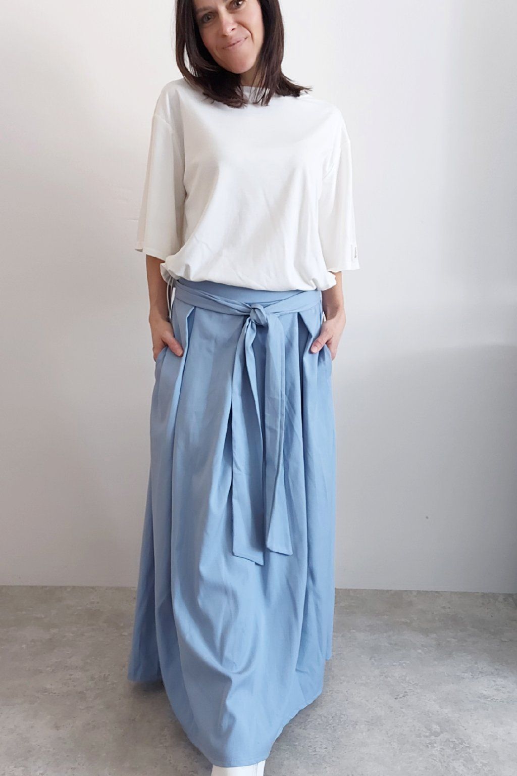 Dlouhá sukně imitace džínoviny. V pase guma a ozdobný pásek ze stejného materiálu, který lze uvázat v pase dle libosti. Ten je tam našitý napevno. Přední kapsy. Pod gumou, v pase jsou sámky a díky nim drží sukně tvar. Foceno na vel. XS, výška 156cm.