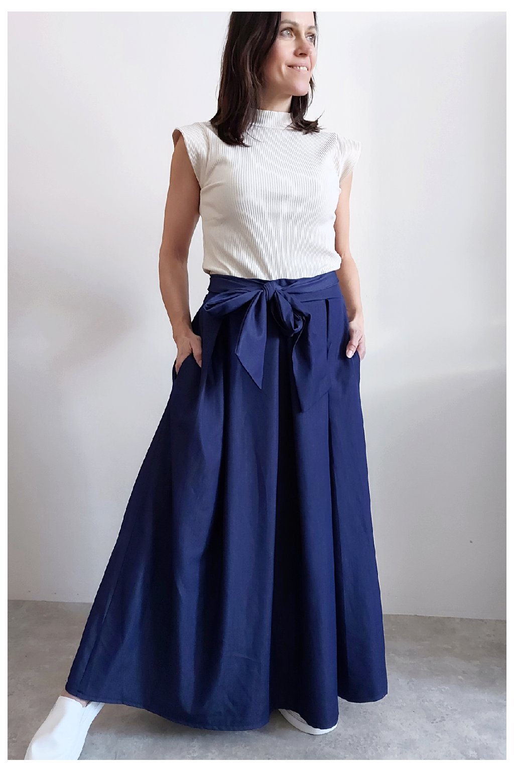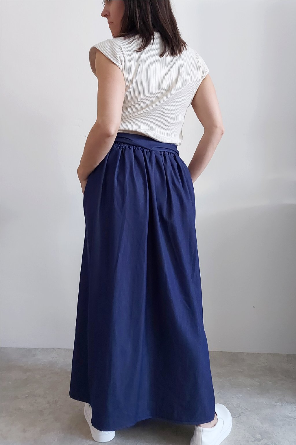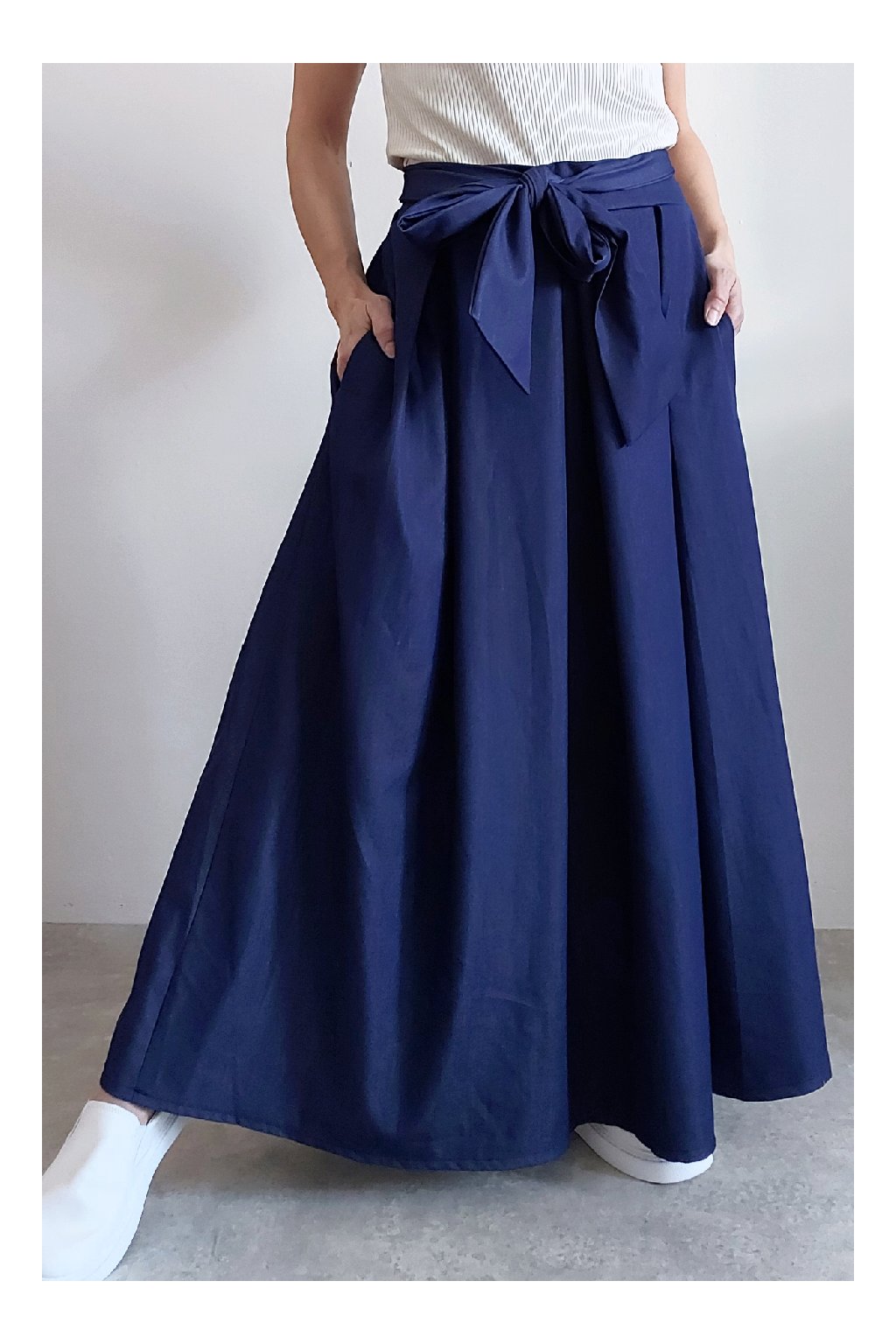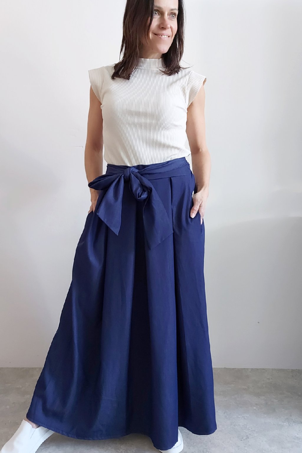 Dlouhá sukně imitace džínoviny. V pase guma a ozdobný pásek ze stejného materiálu, který lze uvázat v pase dle libosti. Ten je tam našitý napevno. Přední kapsy. Pod gumou, v pase jsou sámky a díky nim drží sukně tvar. Foceno na vel. XS, výška 156cm.