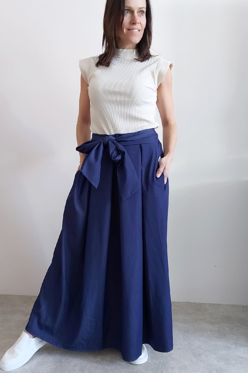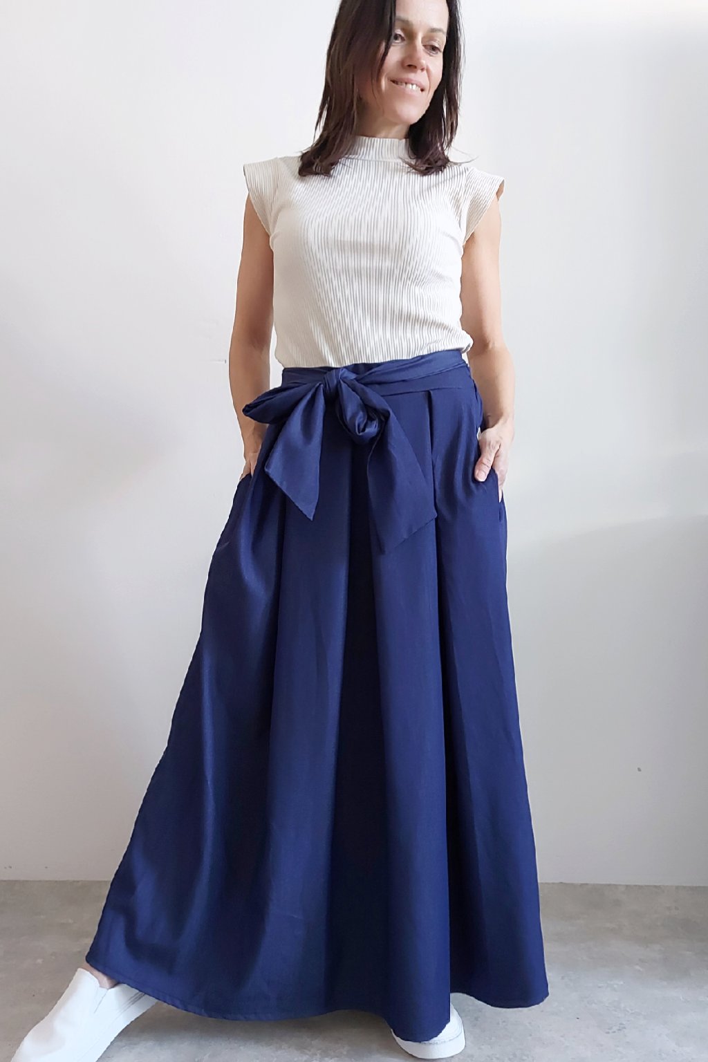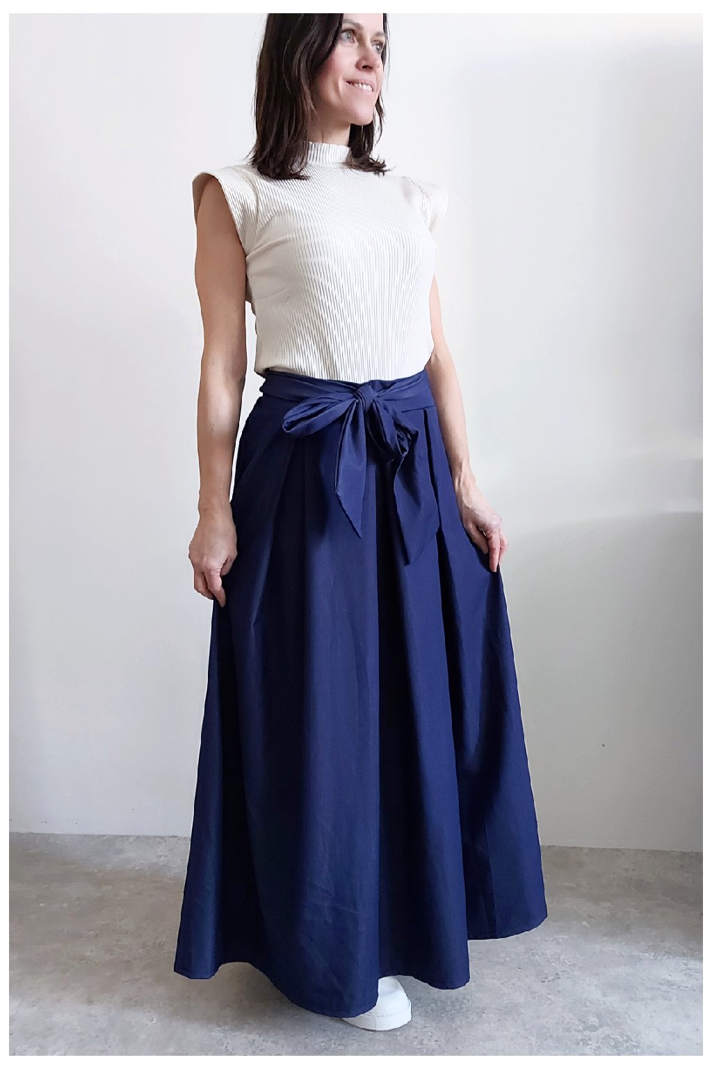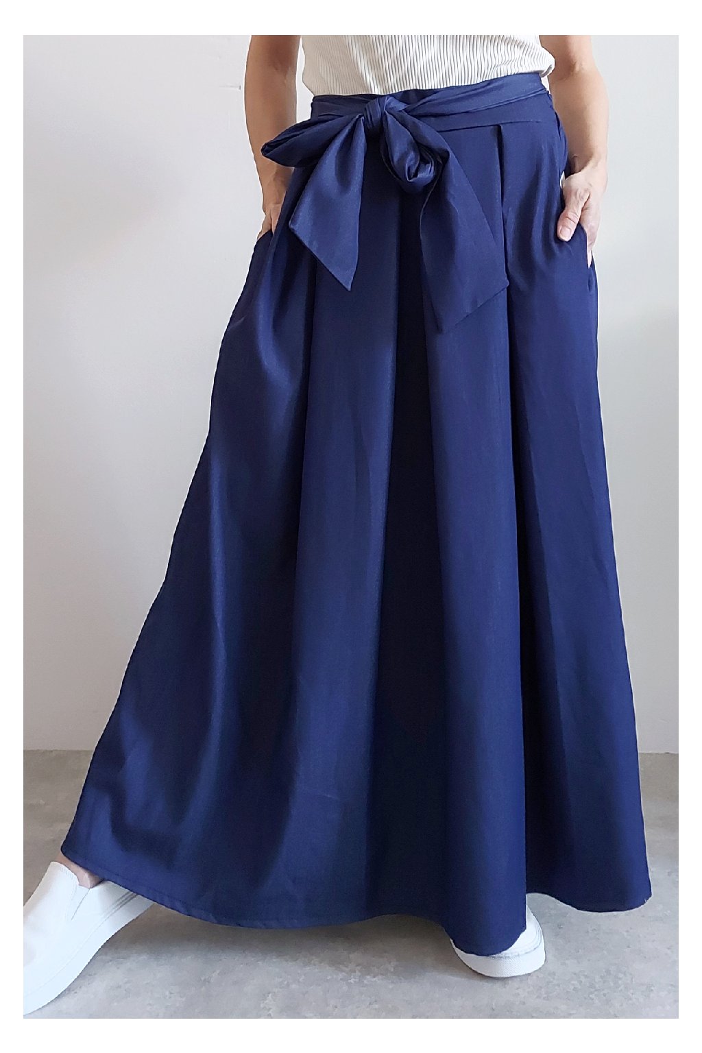 Dlouhá sukně imitace džínoviny. V pase guma a ozdobný pásek ze stejného materiálu, který lze uvázat v pase dle libosti. Ten je tam našitý napevno. Přední kapsy. Pod gumou, v pase jsou sámky a díky nim drží sukně tvar. Foceno na vel. XS, výška 156cm.