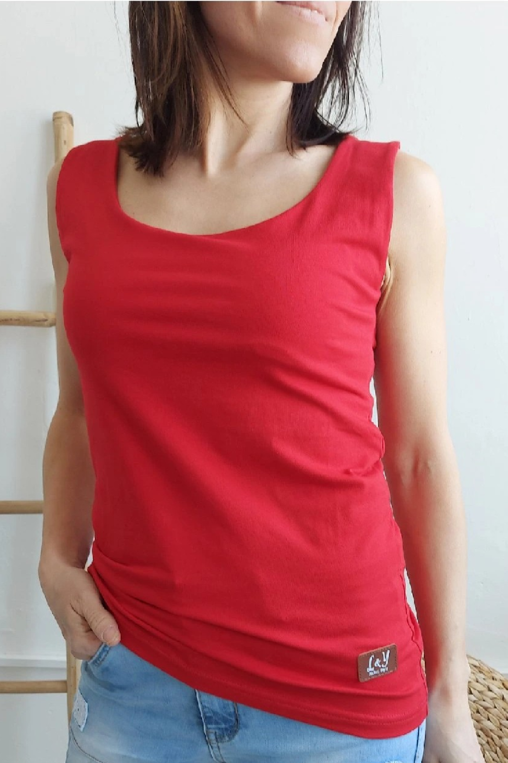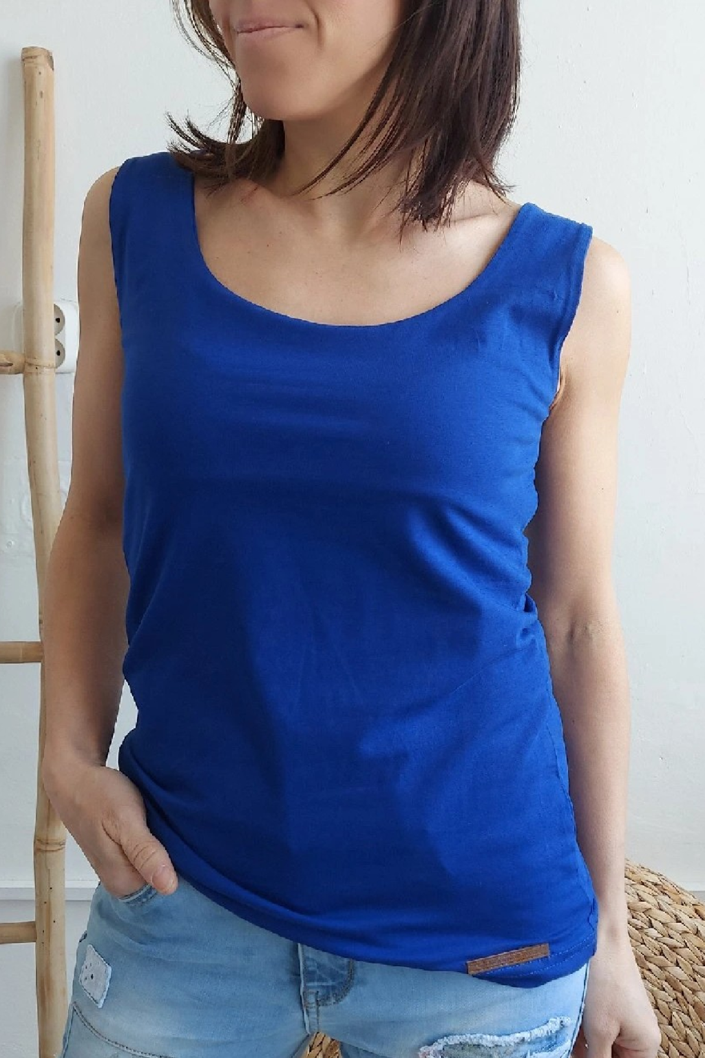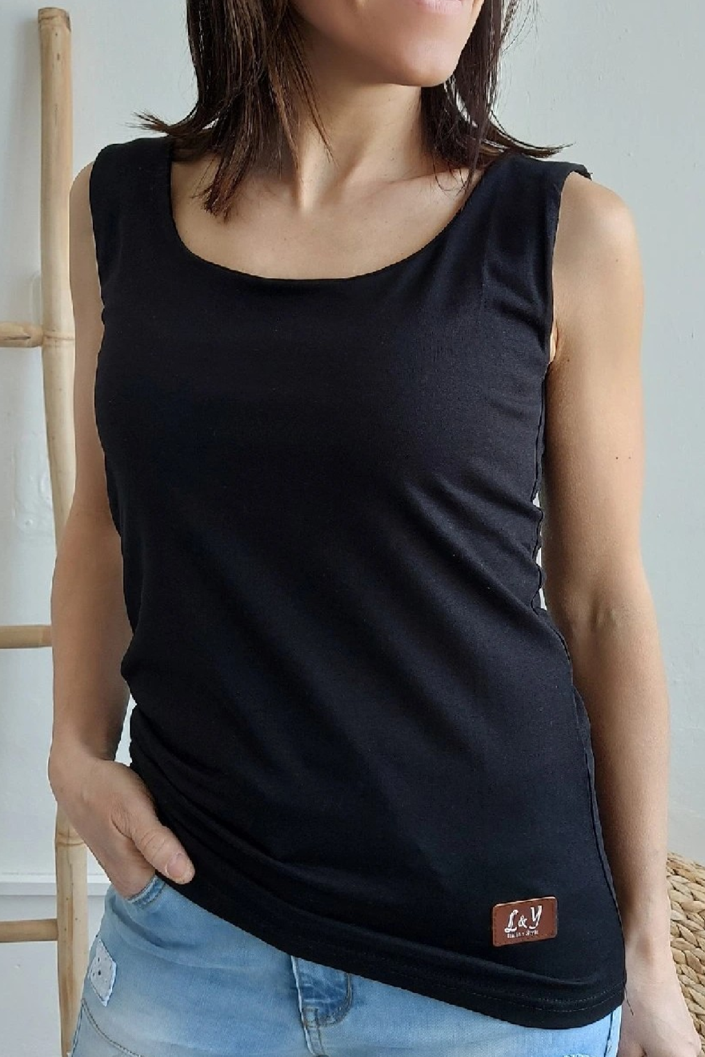 Tílko bavlněné s kulatým výstřihem a zdvojenou látkou pod prsy tzv. push-up efektem. Ve spodní části ozdobná nášivka (z koženky). Materiál velmi příjemný a hodně pružný.